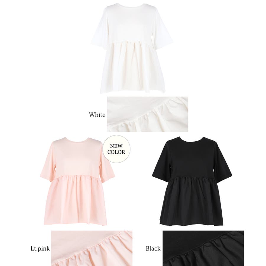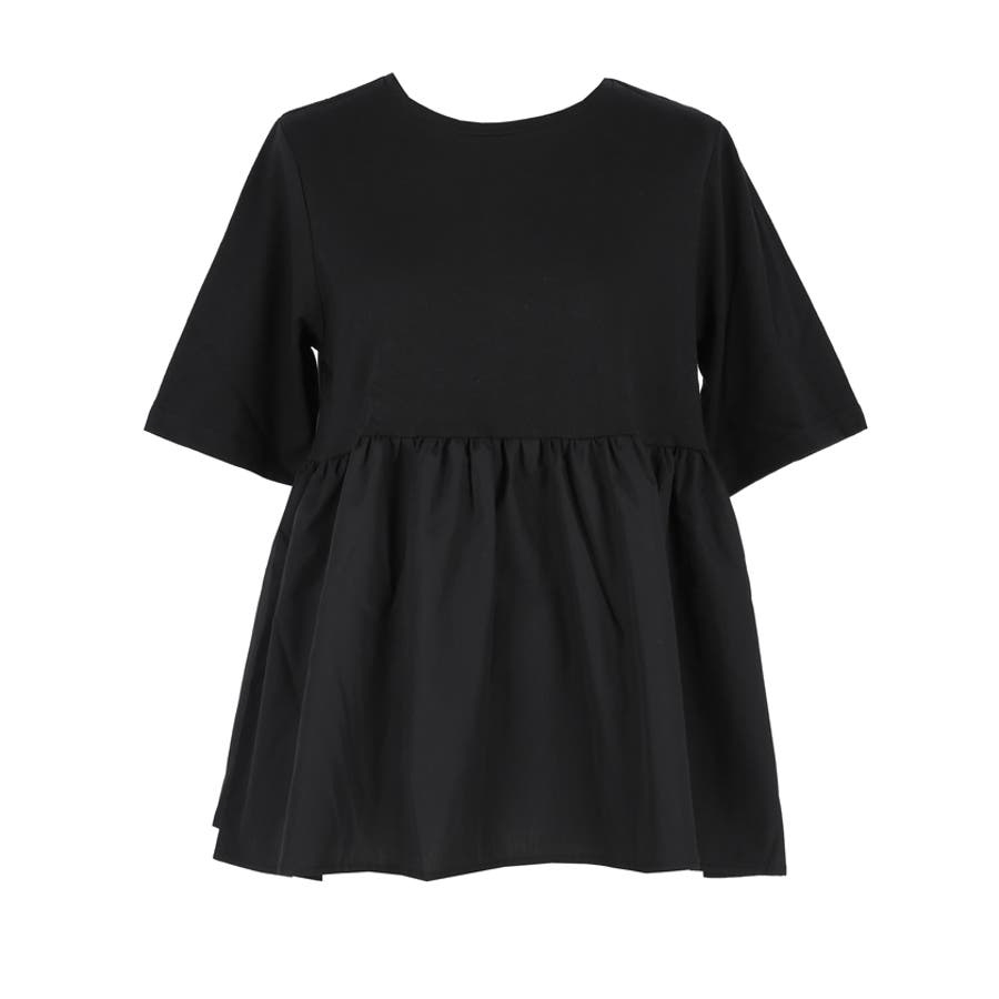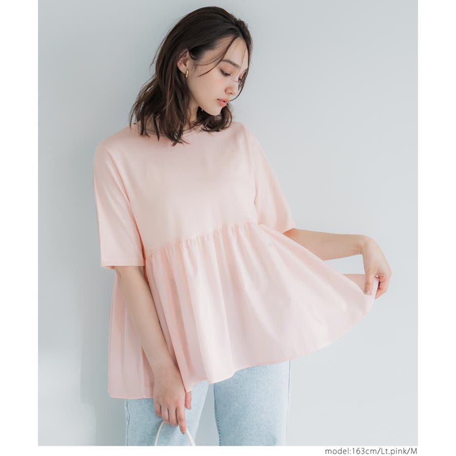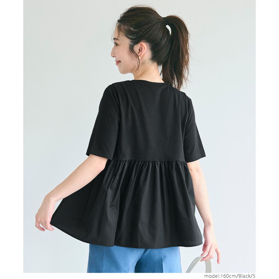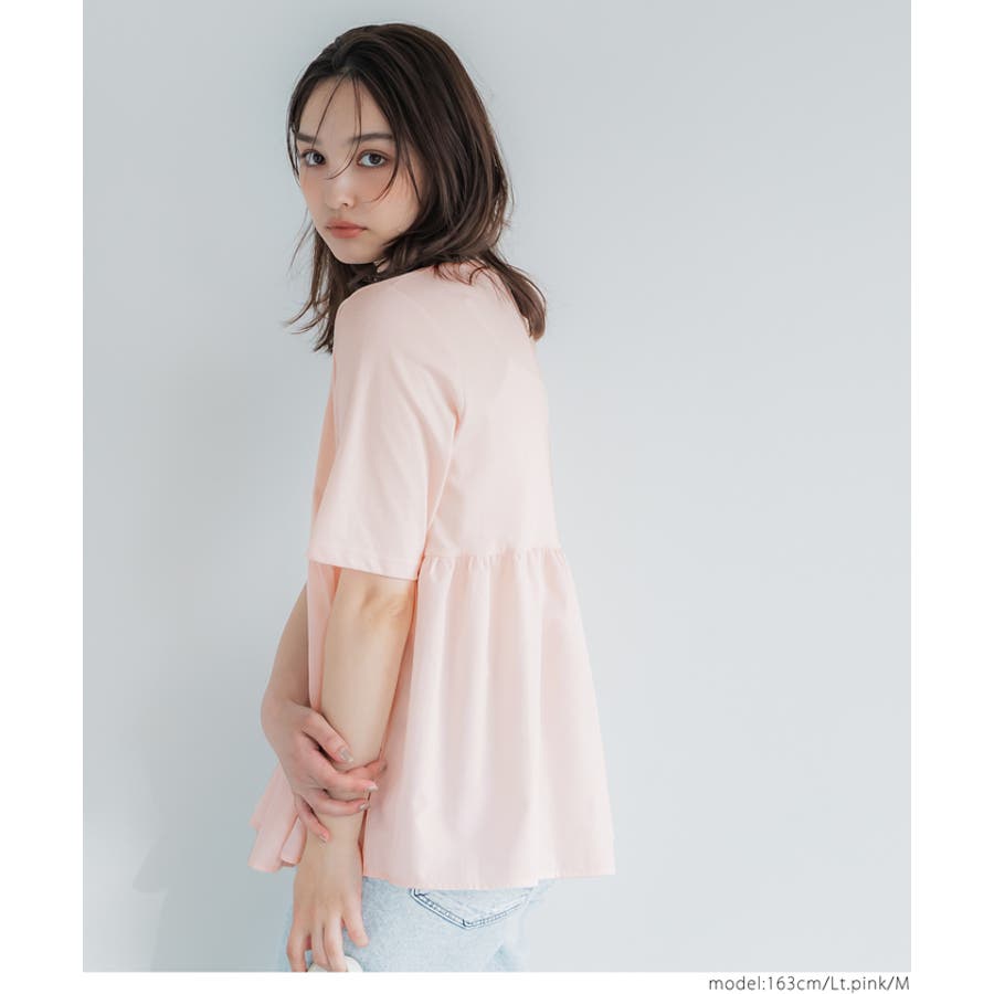 トップス カットソー Tシャツ 異素材 フレア ギャザー 5分袖 クルーネック ペプラム 切り替え ドッキング カジュアル シンプル 25ss コカ COCA coca COCA coca おしゃれ 可愛い きれいめ おとな 大人 女性ファッション 韓国 春服 夏服 春 夏 カジュアル プチプラ 10代 20代 30代 40代 50代 オフィス ホーム シンプル
