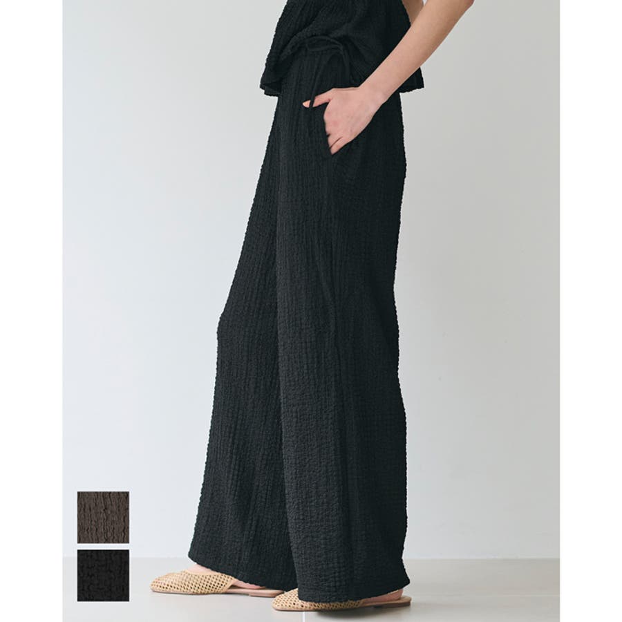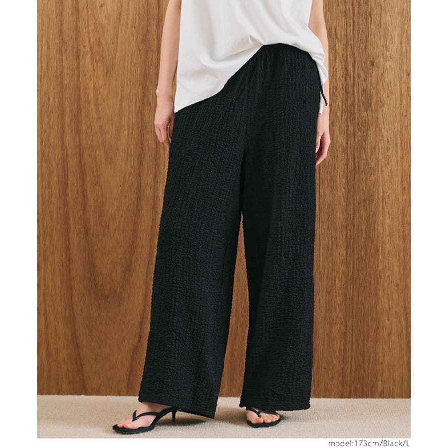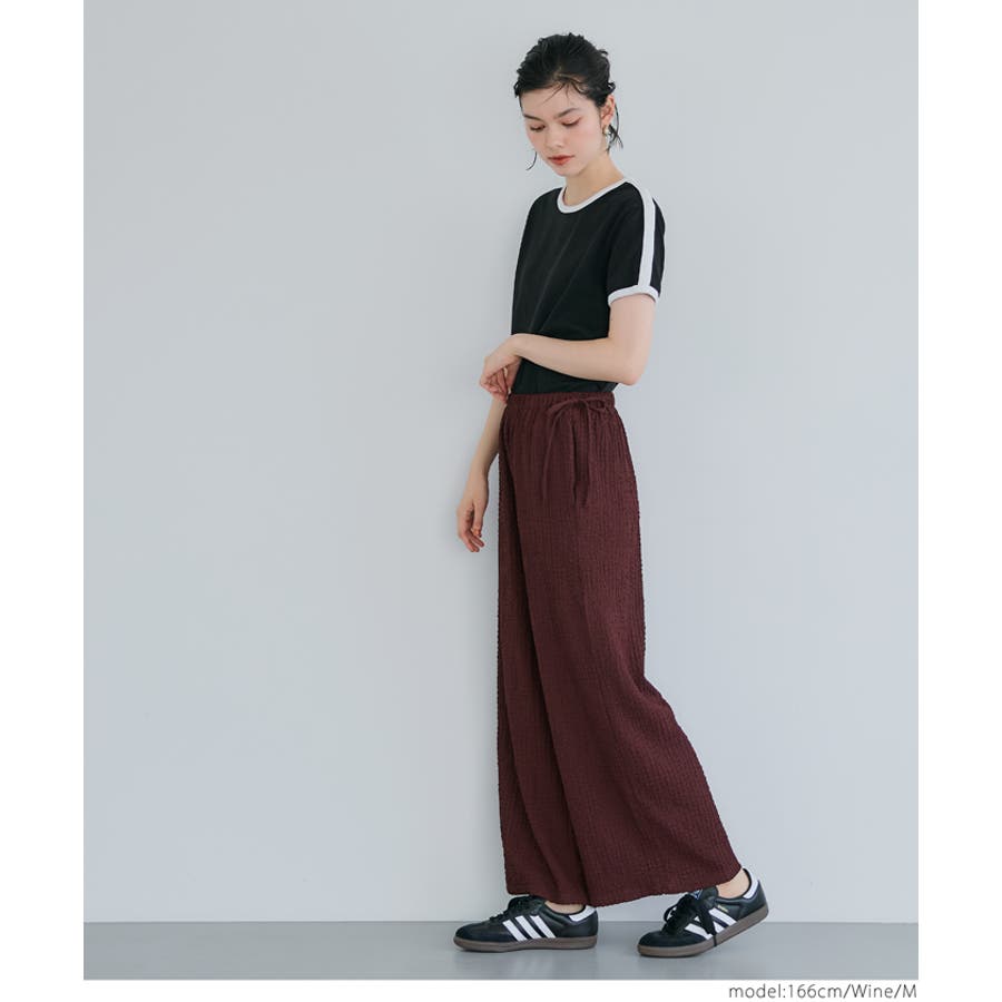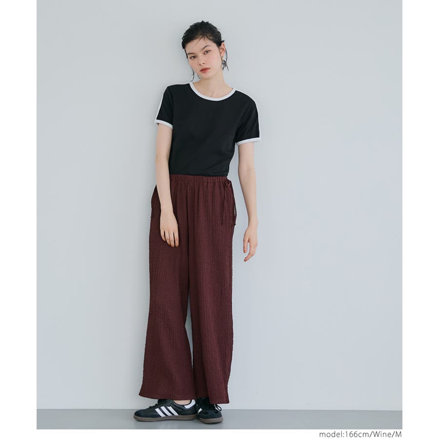 表情のある素材×サイドリボンがポイント。大人のリラックスパンツ