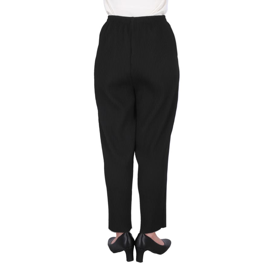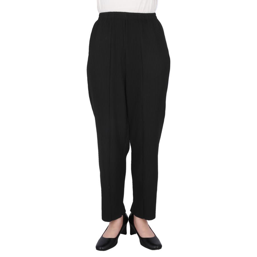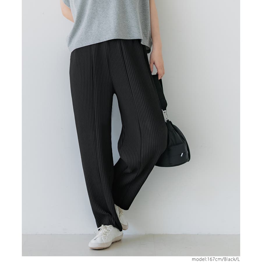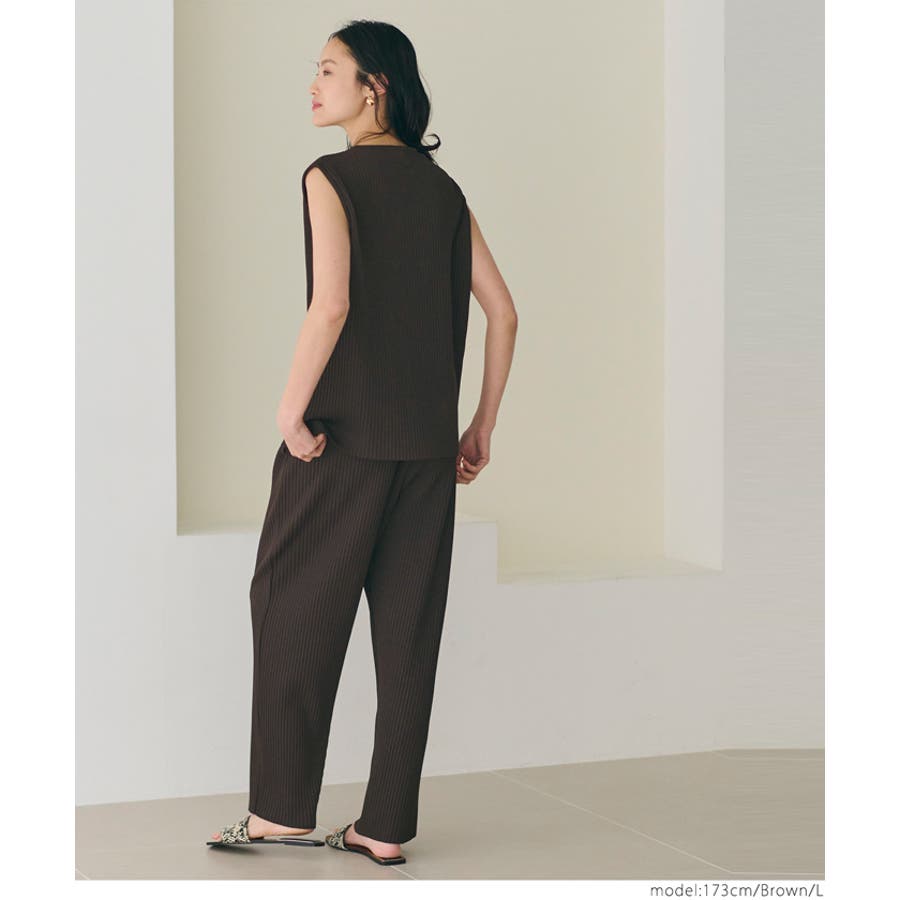 スタイルアップが叶う、細リブ調の縦ラインが特徴のテーパードパンツ。