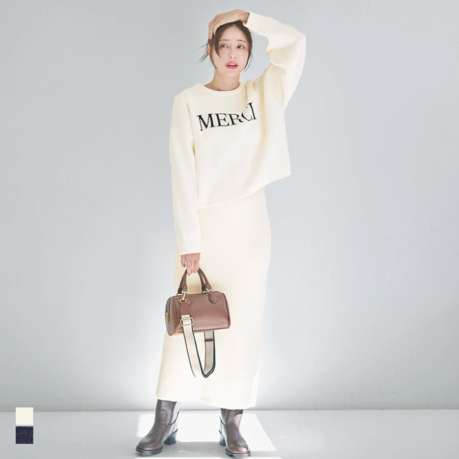 同素材のニットやゆったりめのトップスと合わせて、統一感のあるリラックススタイルに。