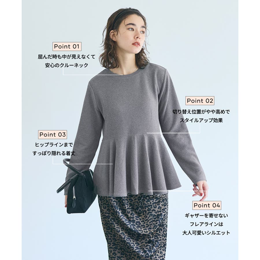 カットソー レディース エンボス イージーケア ペプラム フレア 切り替え 丸首 長袖 ミディアム丈 無地 ストレッチ 24ss coca コカ トップス プルオーバー エンボス加工 ペプラムシルエット エンボスフレア クルーネック 伸縮性 イージーケア シンプル コカ COCA coca COCA coca