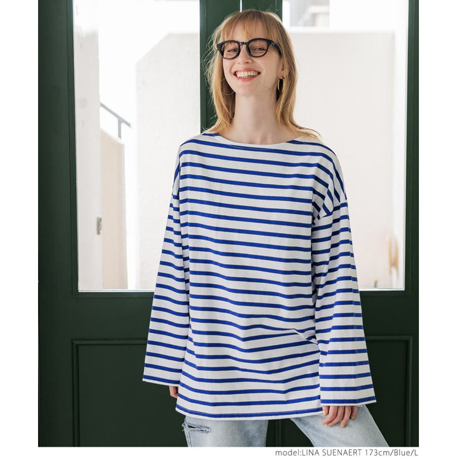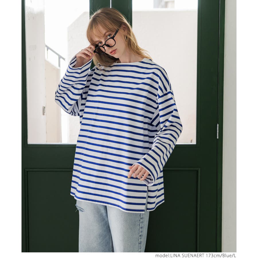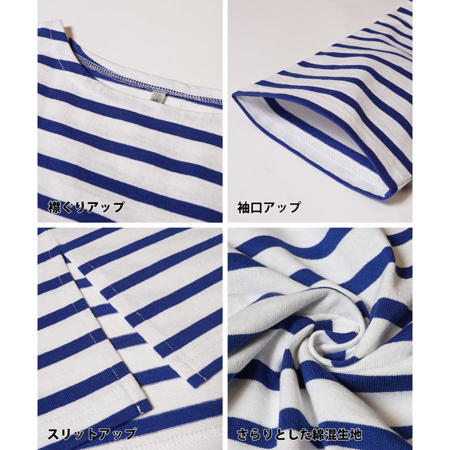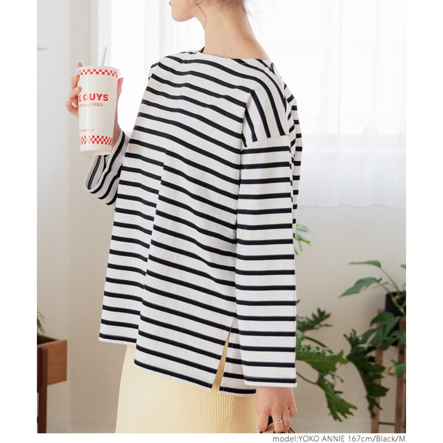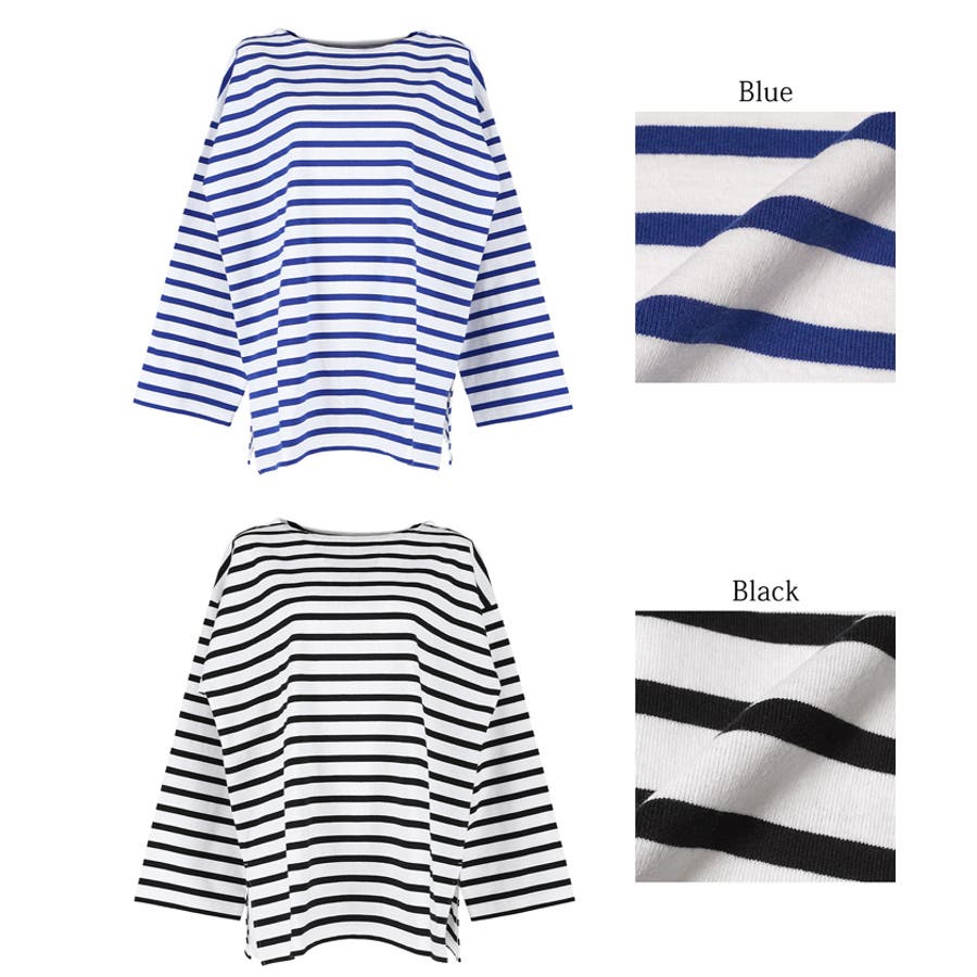 Tシャツ レディース バスクシャツ ワイドスリーブ サイドスリット ボーダー 体型カバー ボートネック ミディアム丈 薄手 トップス カットソー 長袖 プルオーバー ドロップショルダー 綿混 シンプル カジュアル ゆったり すっきり コカ COCA coca COCA coca