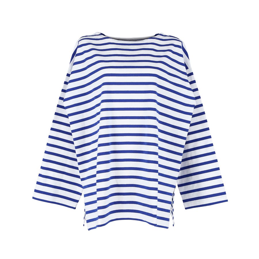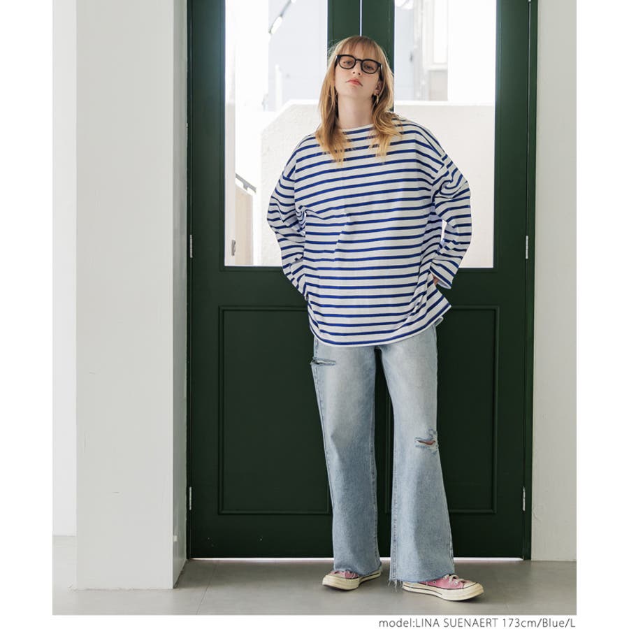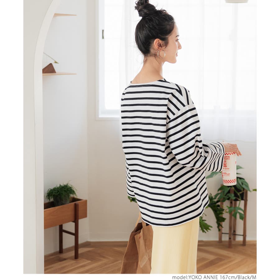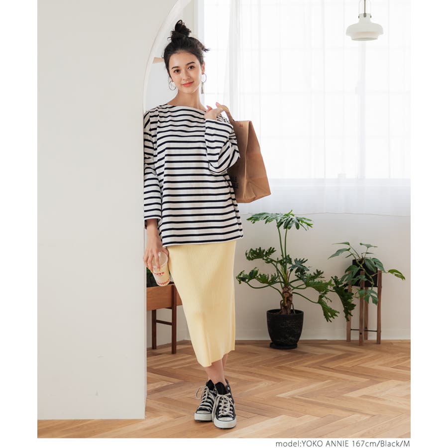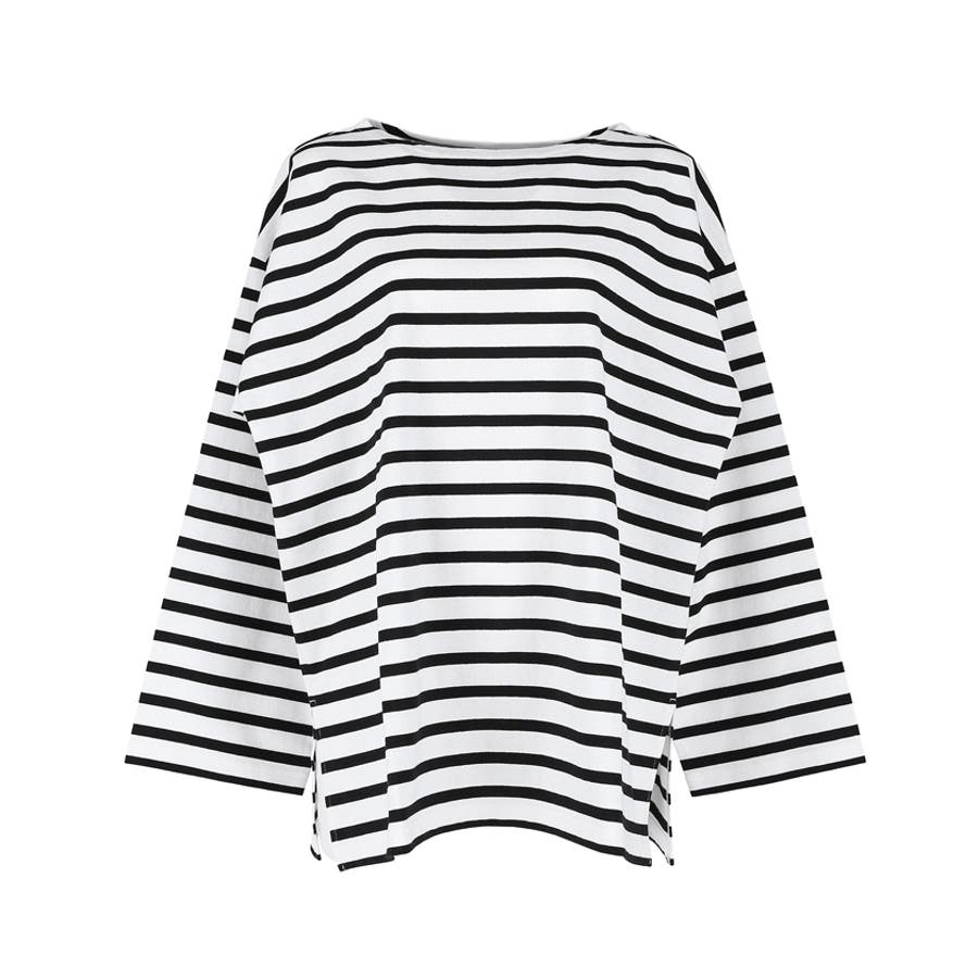Tシャツ レディース バスクシャツ ワイドスリーブ サイドスリット ボーダー 体型カバー ボートネック ミディアム丈 薄手 トップス カットソー 長袖 プルオーバー ドロップショルダー 綿混 シンプル カジュアル ゆったり すっきり コカ COCA coca COCA coca