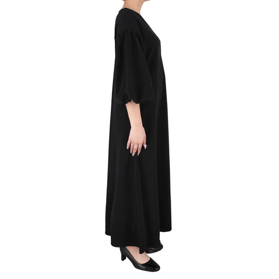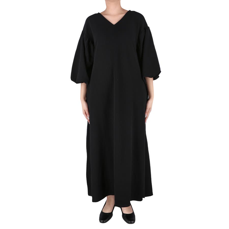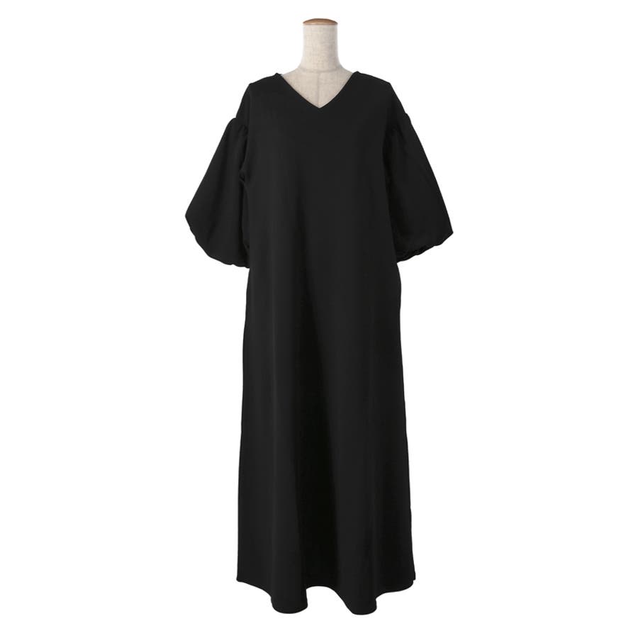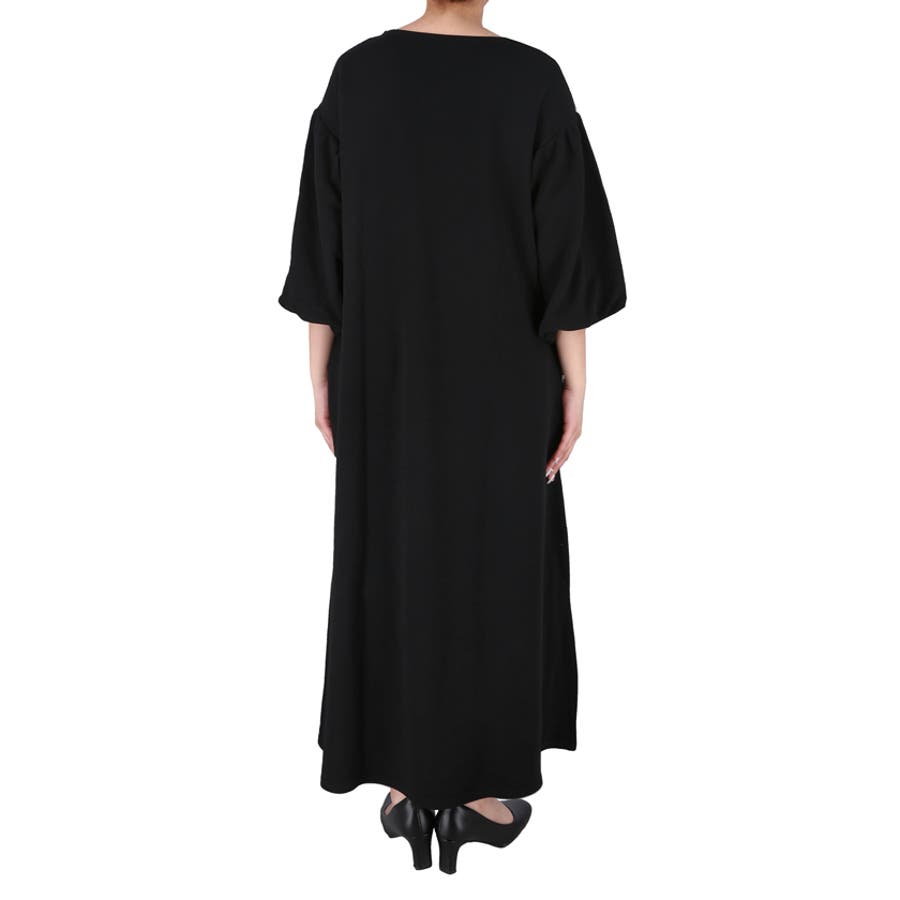ワンピース レディース エンボス イージーケア バルーンスリーブ ポケット Vネック 5分袖 ロング丈 無地 オールインワン ロングワンピ プルオーバー 凹凸 ストレート 裾フレア アンクル丈 伸縮性 ストレッチ シンプル コカ COCA coca COCA coca