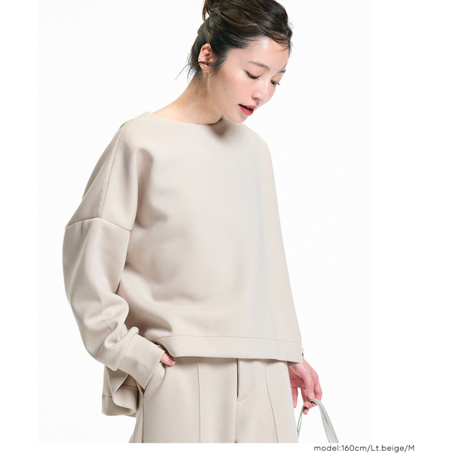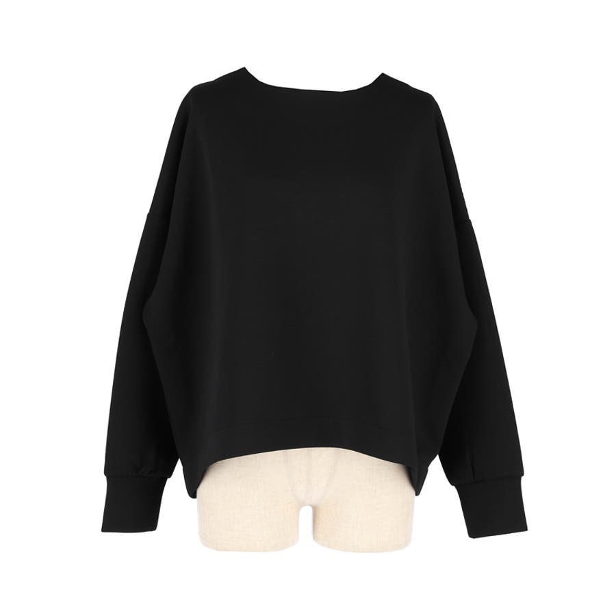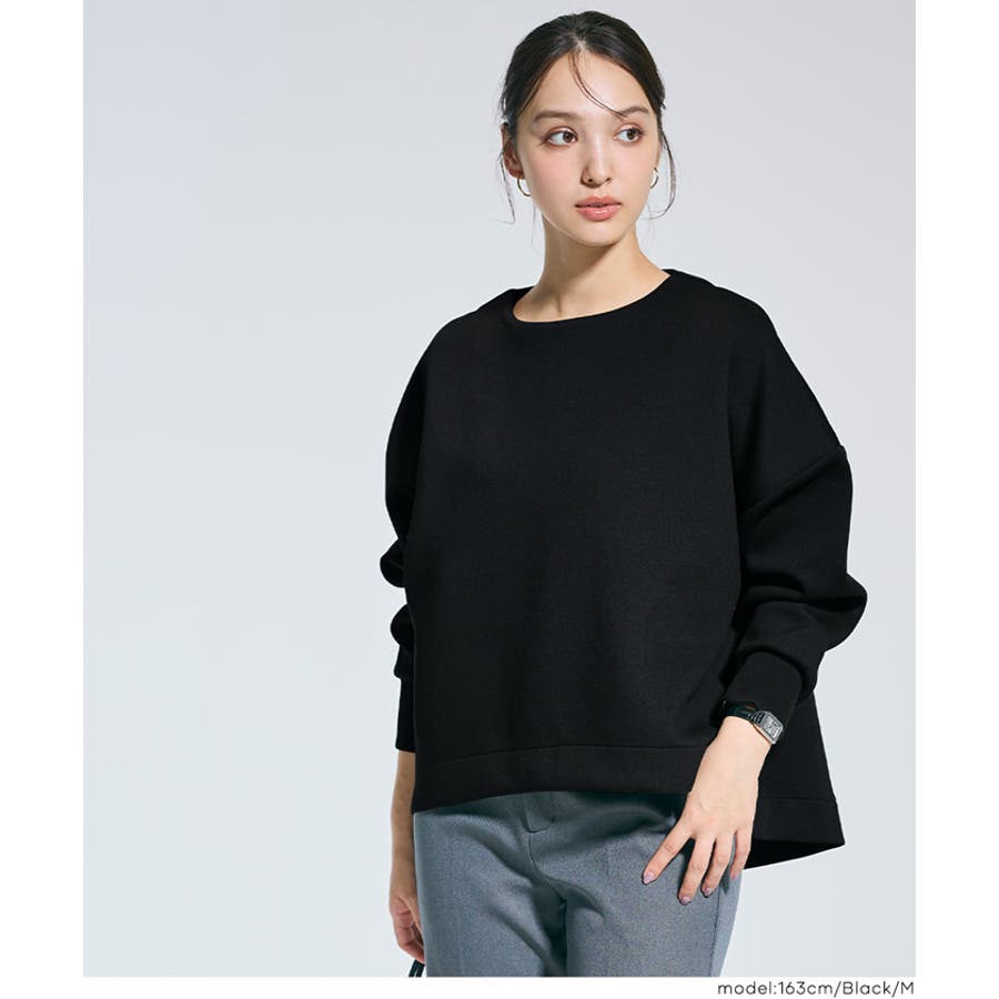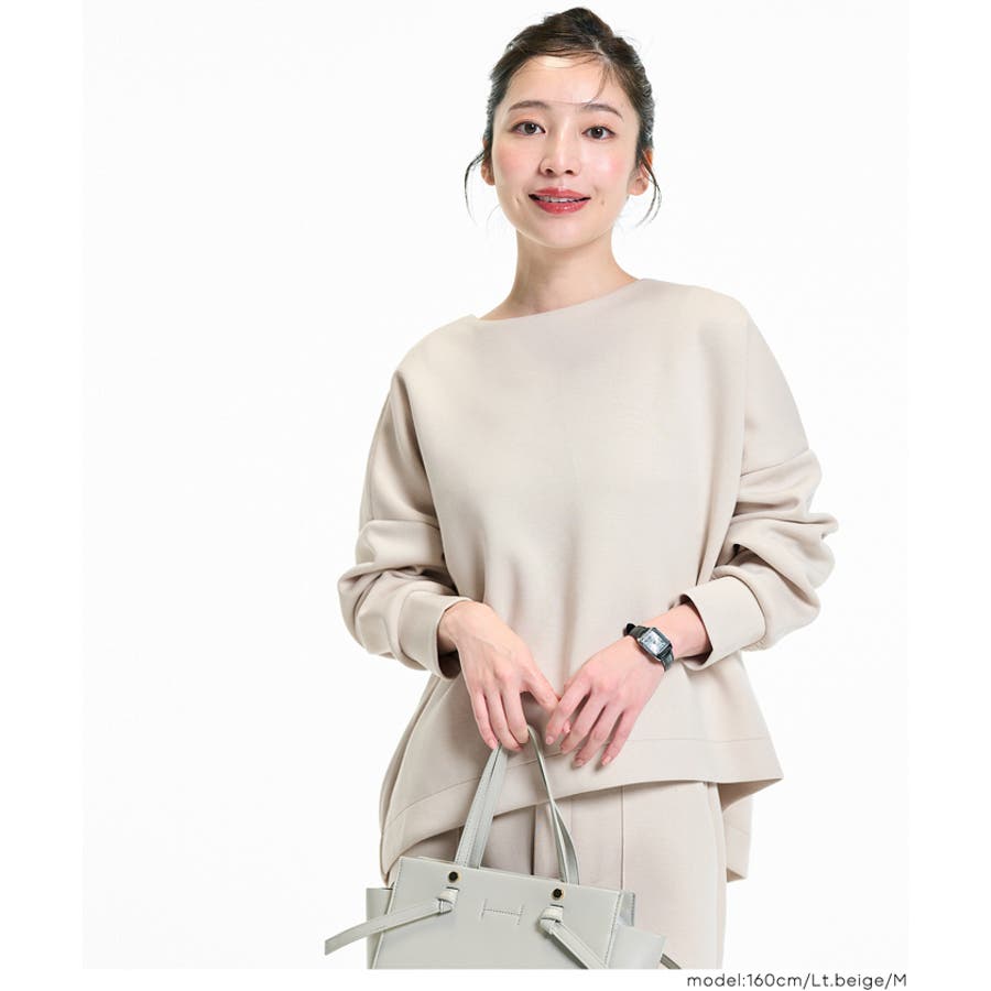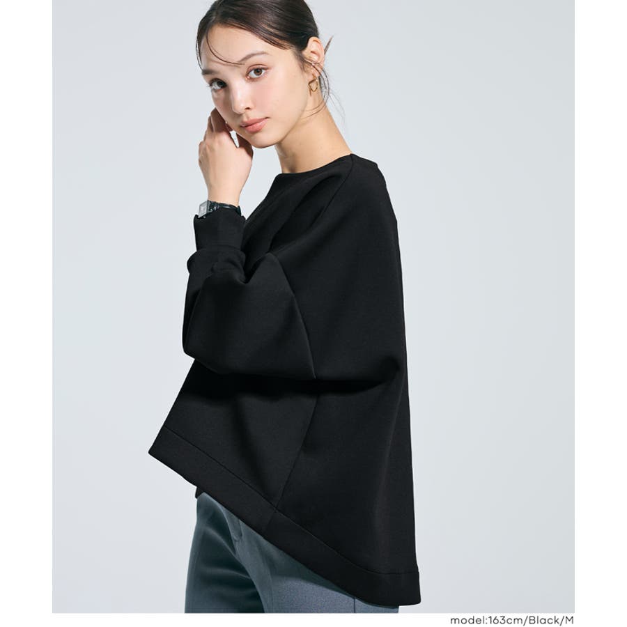 体のラインを拾いにくく、すっきりと着こなせる万能トップスです。