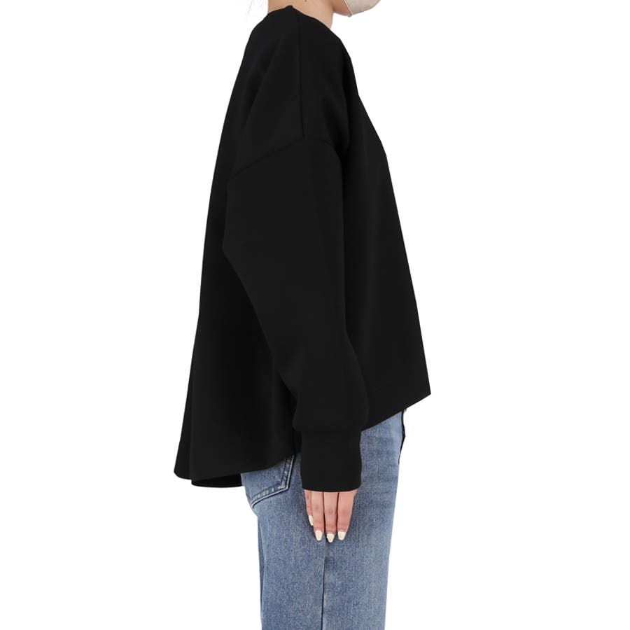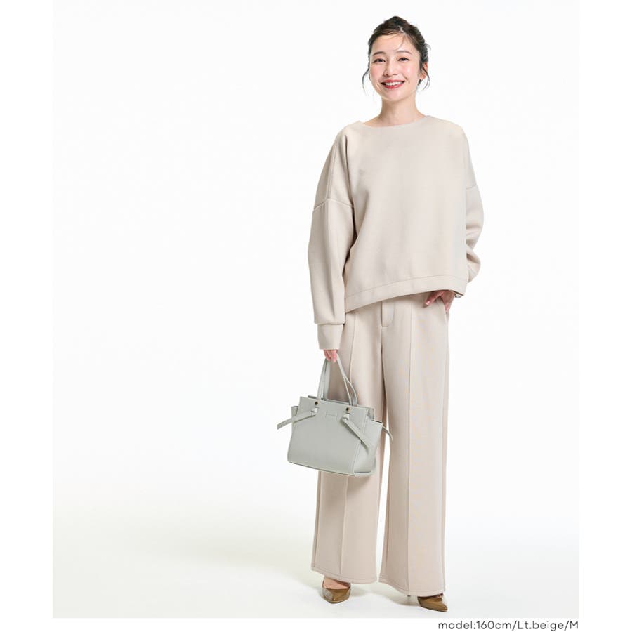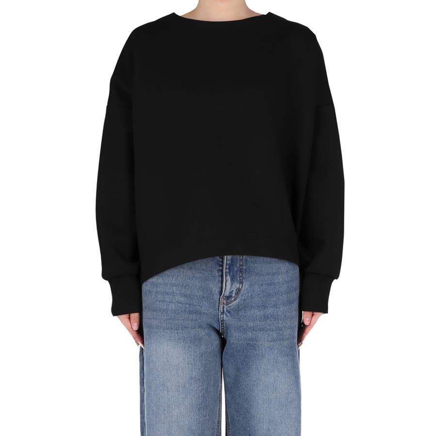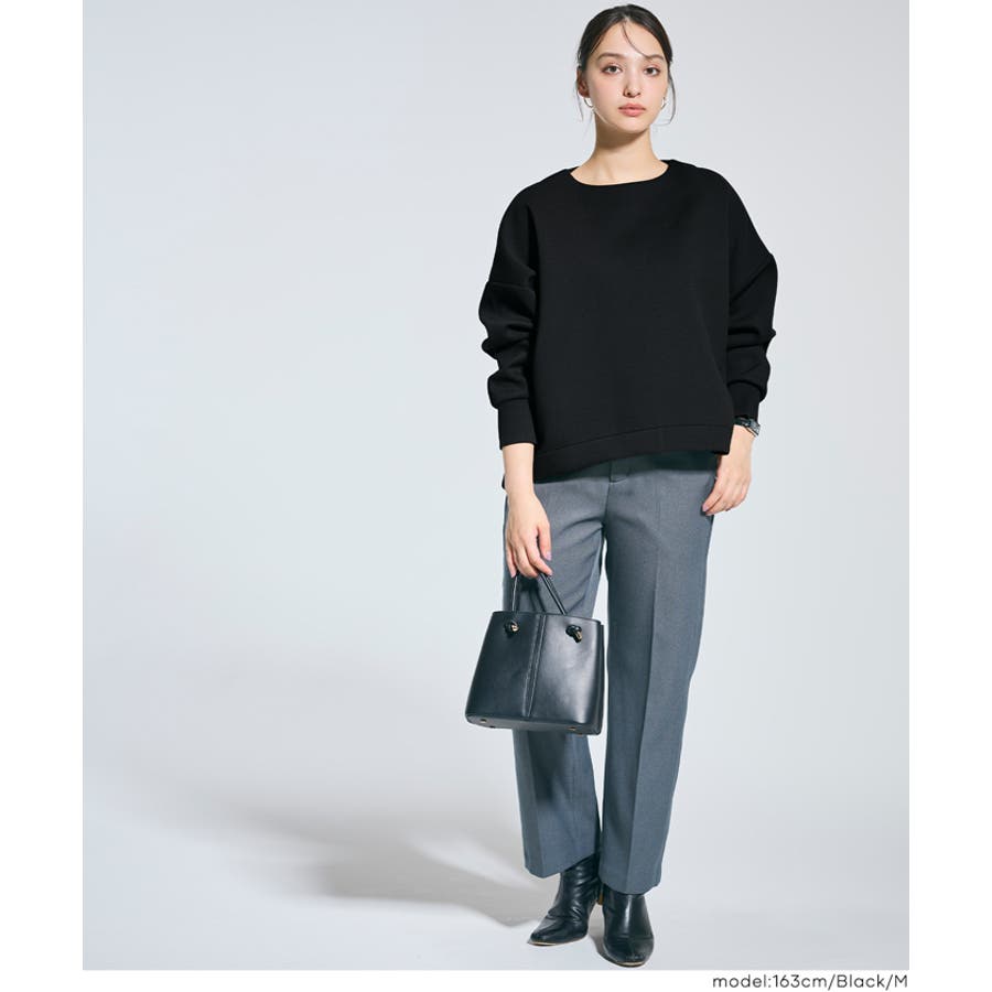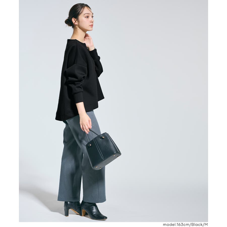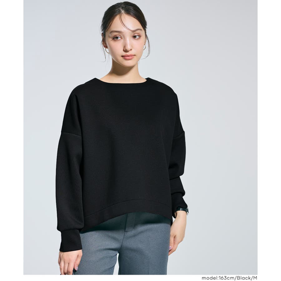 体のラインを拾いにくく、すっきりと着こなせる万能トップスです。