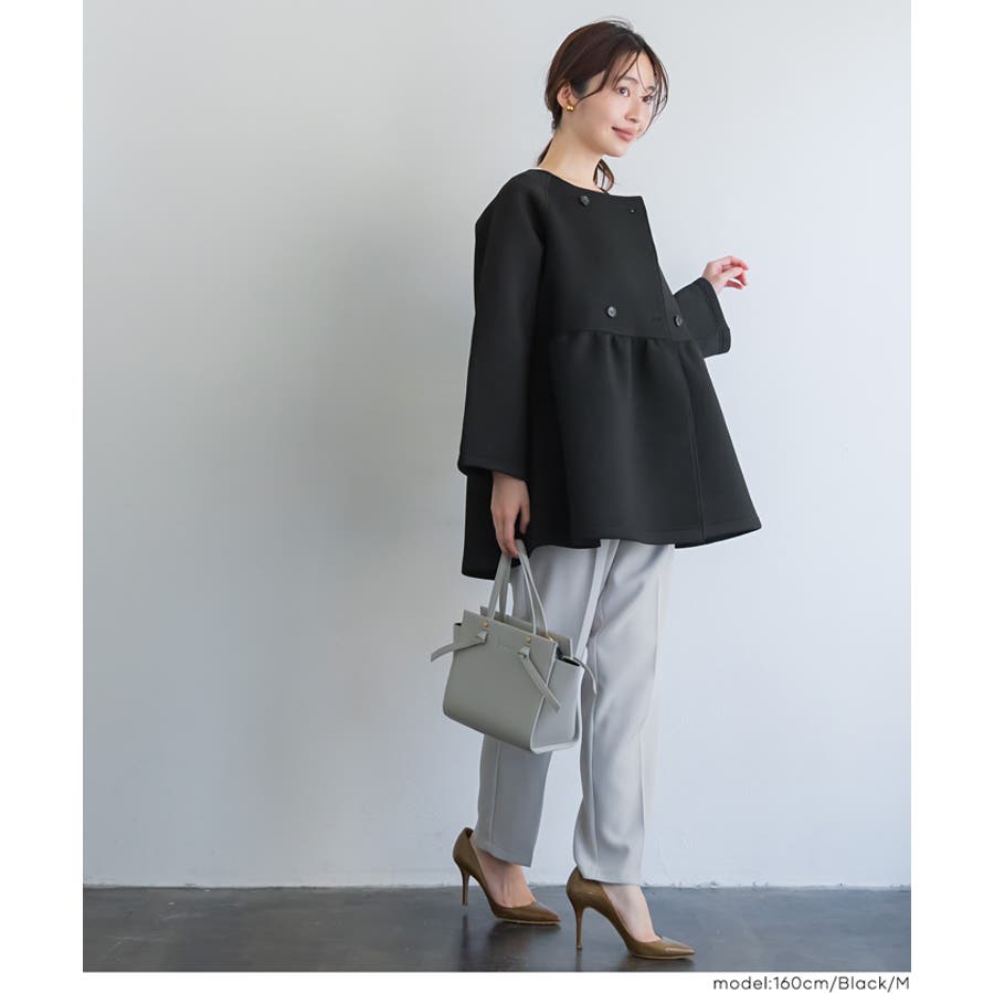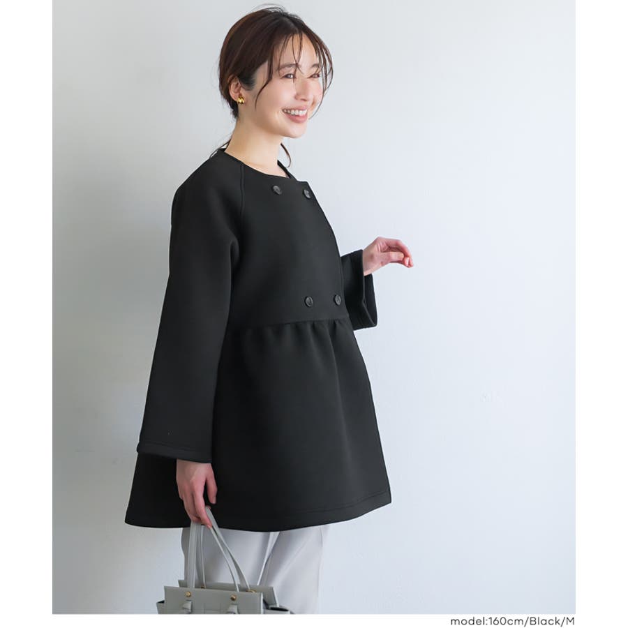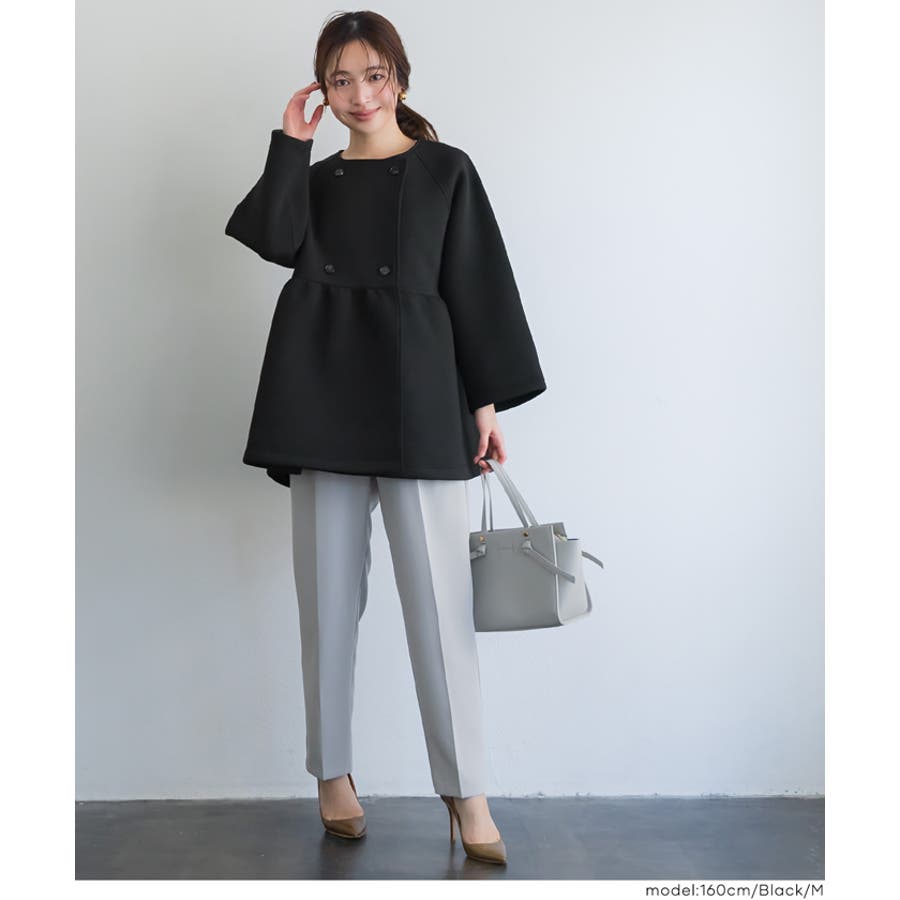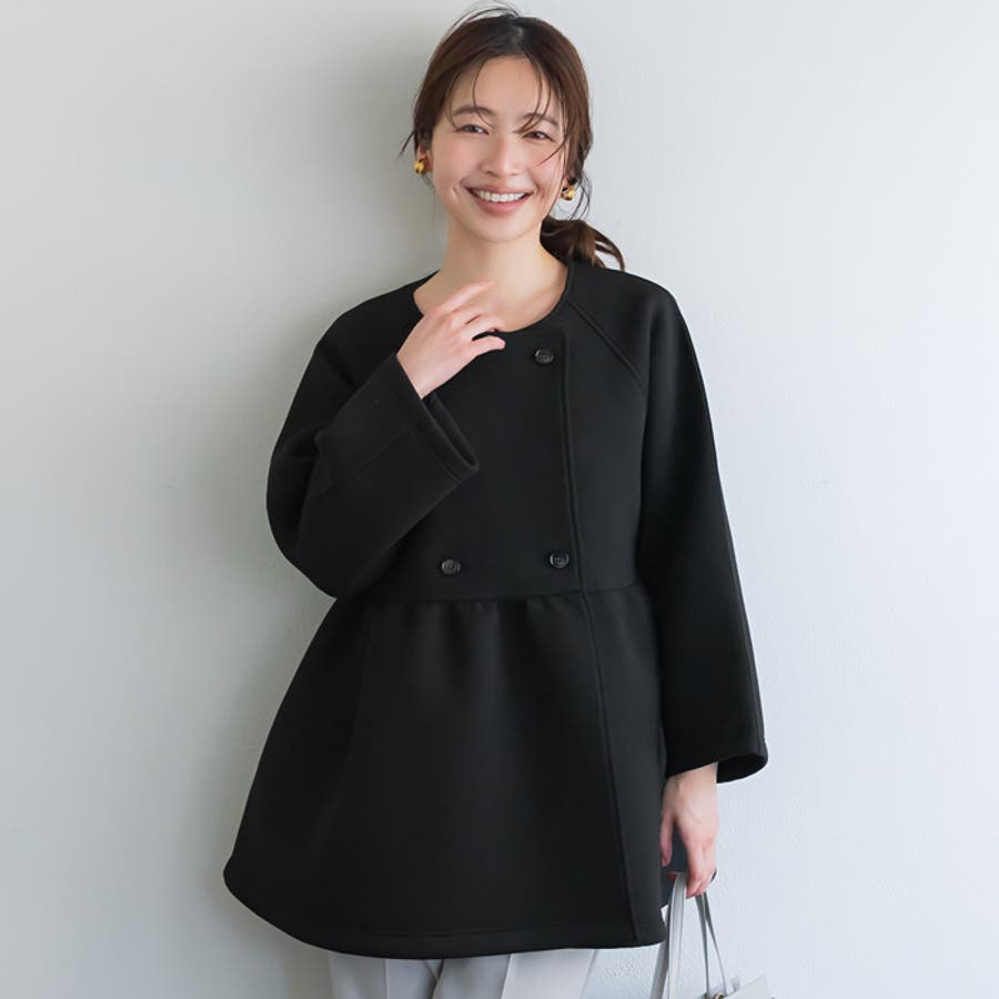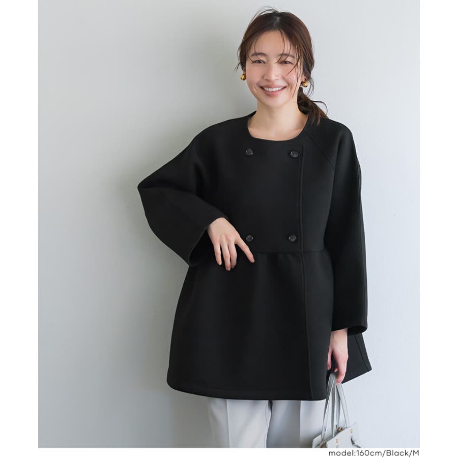 ノーカラーのすっきりとした首元に、ダブルボタンで程よいきちんと感をプラス。
