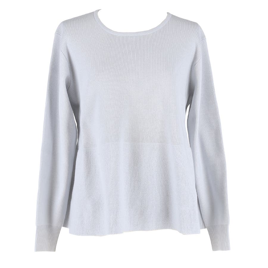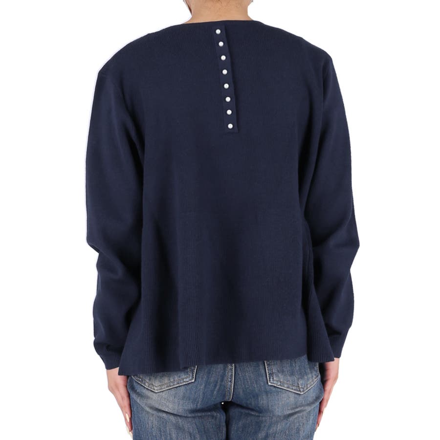 シンプルなクルーネックのフロントに対し、バックスタイルにはパールをあしらい、女性らしさをプラス。