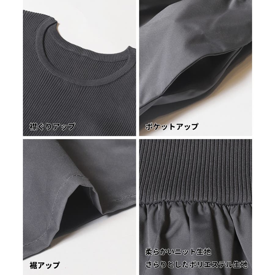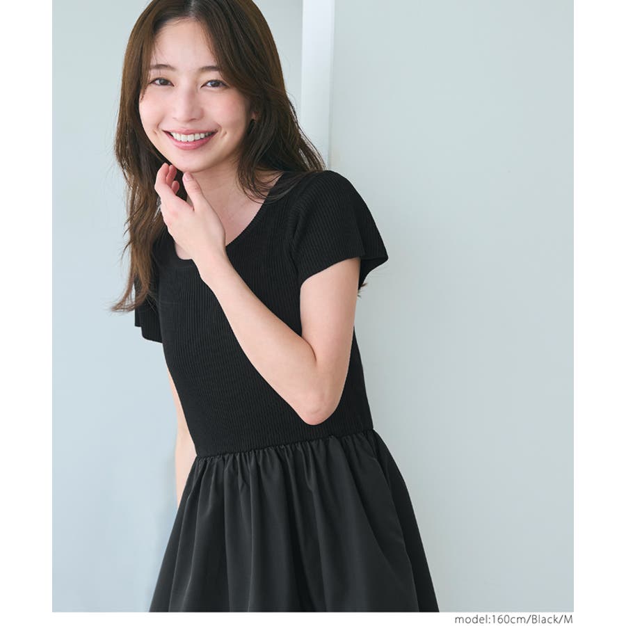 トップス部分は柔らかなニット素材、スカート部分はハリ感のあるポリエステル素材を使用し、