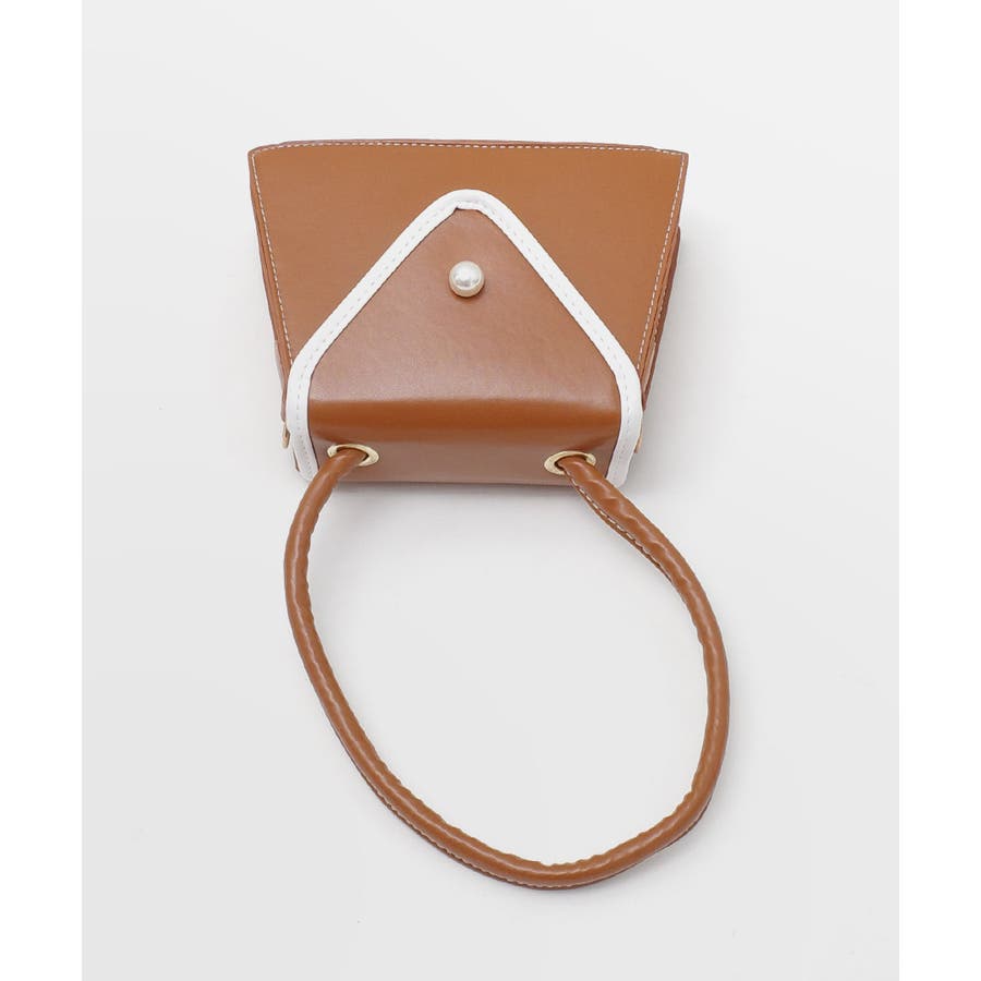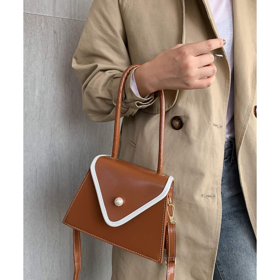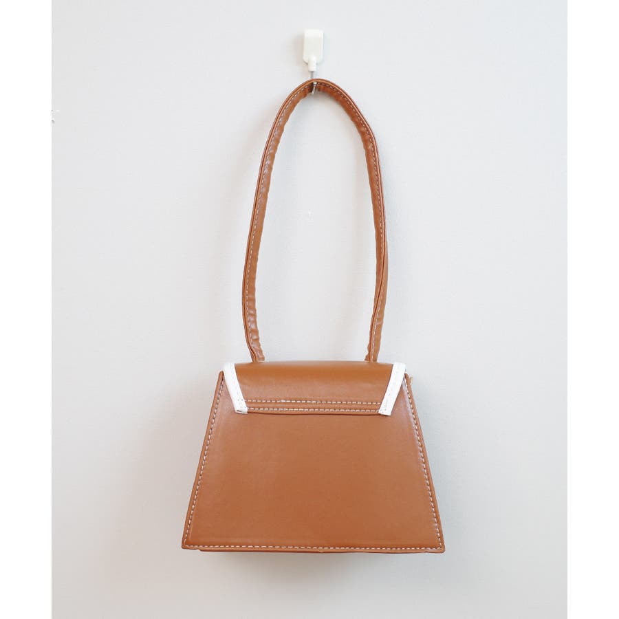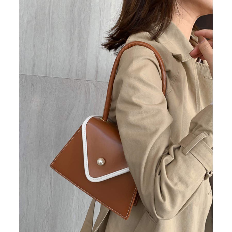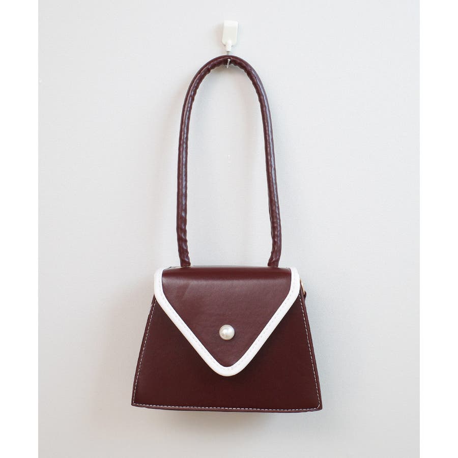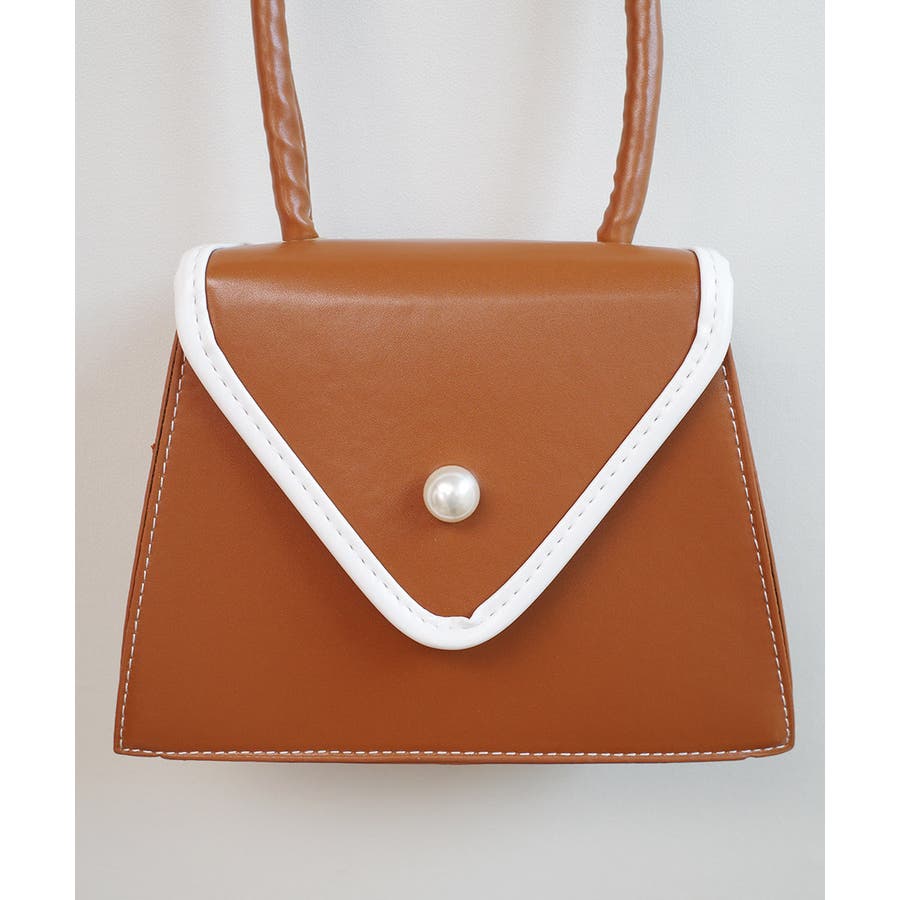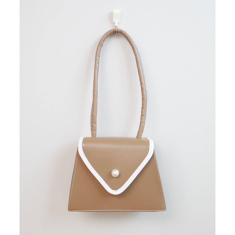 バイカラーとパールボタンが目を惹く台形バッグ。