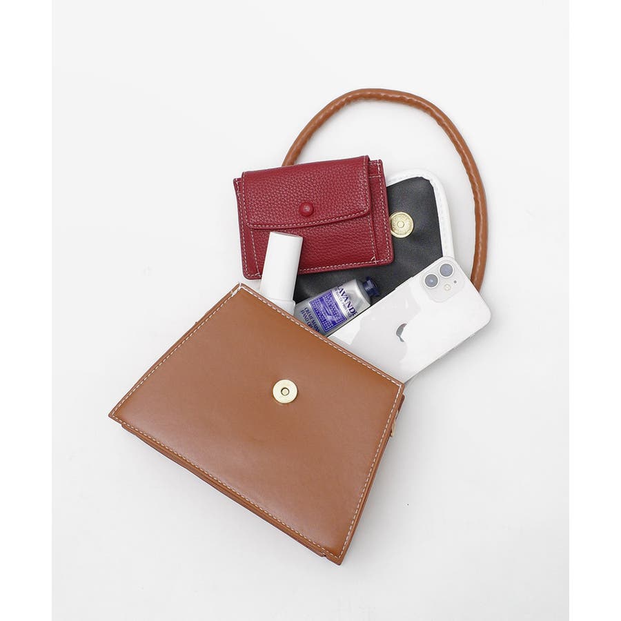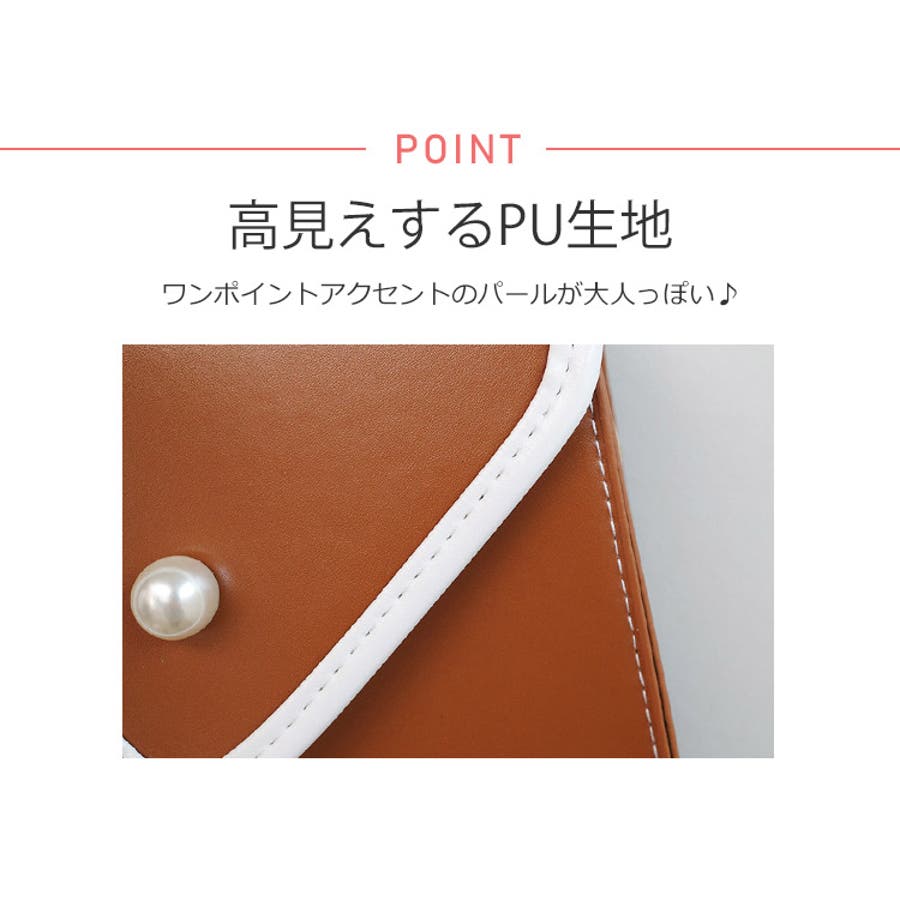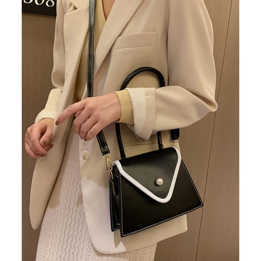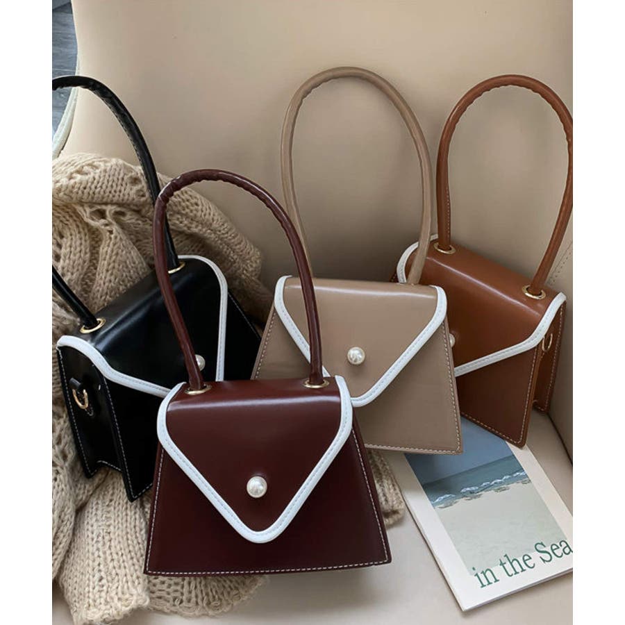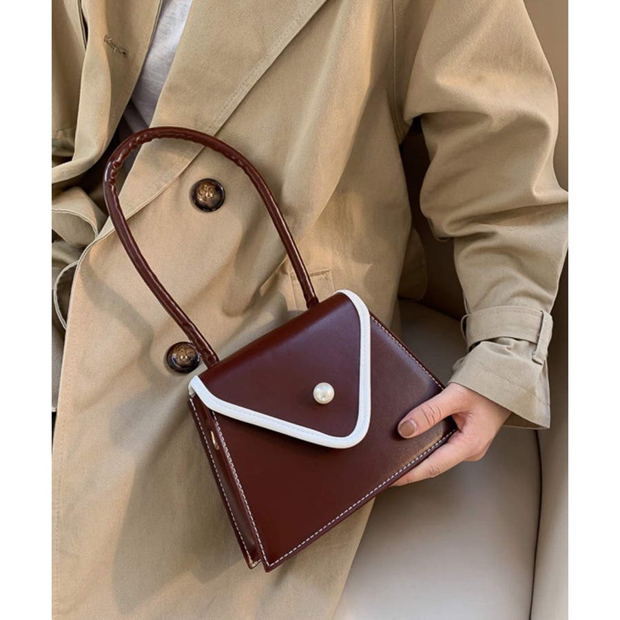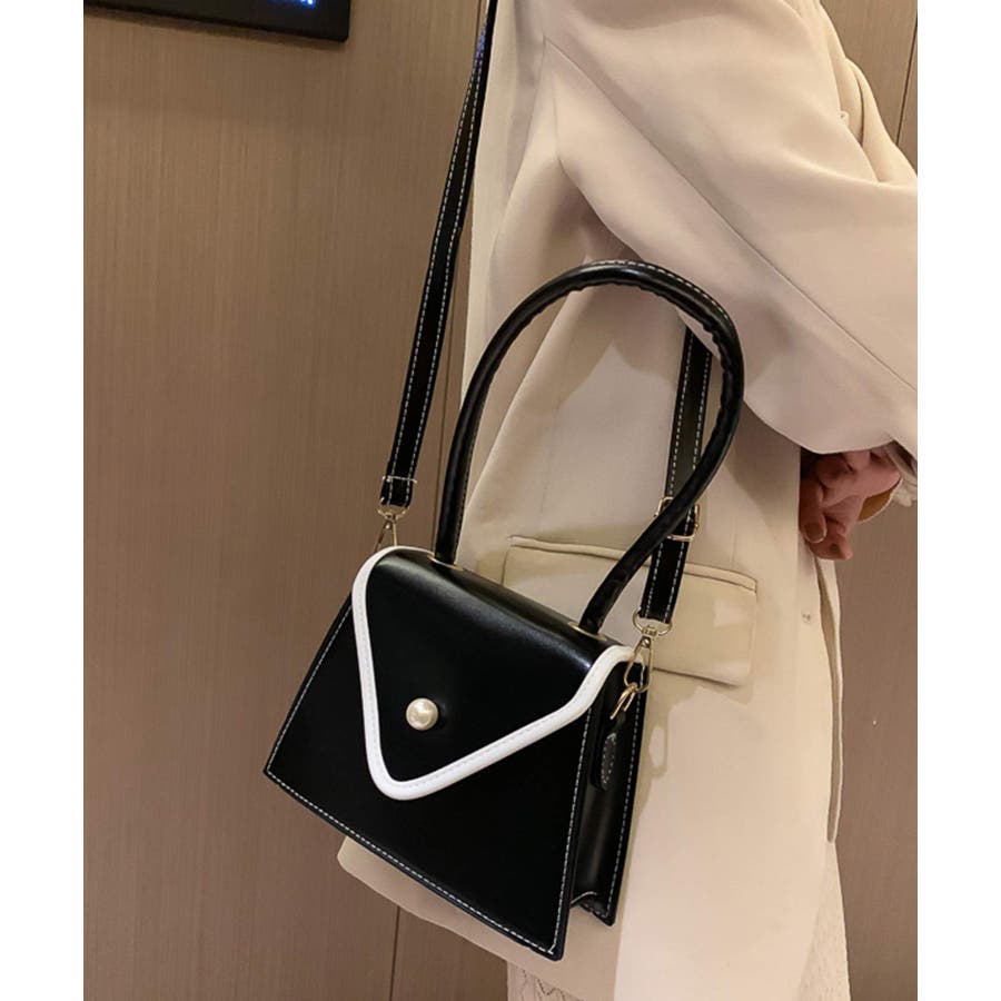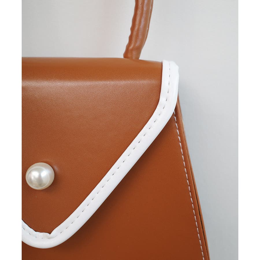 バイカラーとパールボタンが目を惹く台形バッグ。