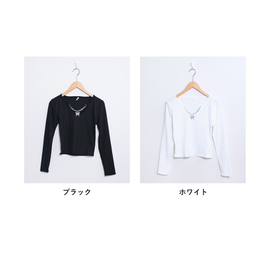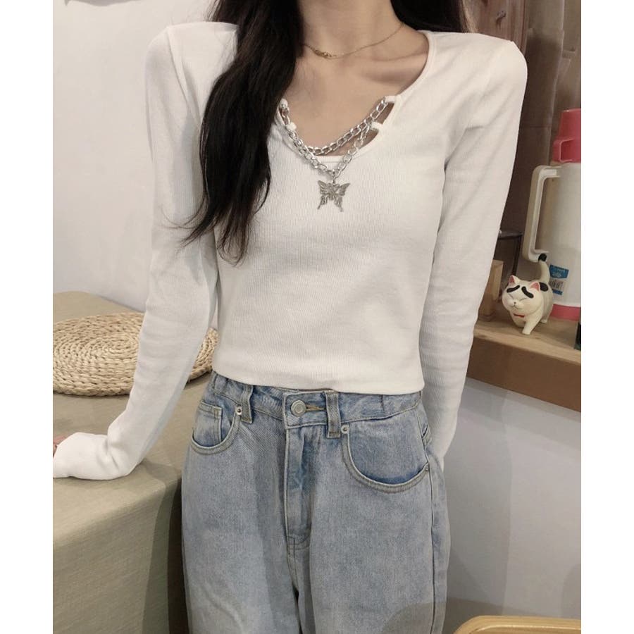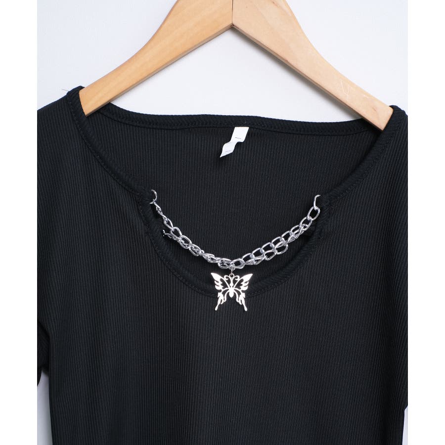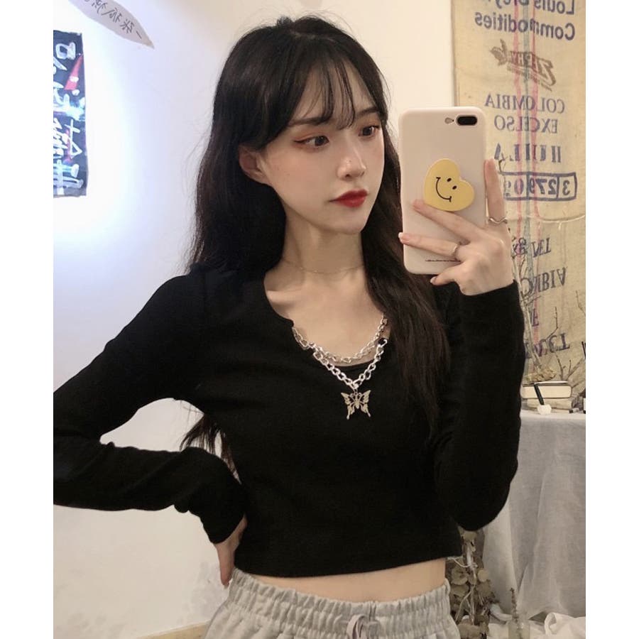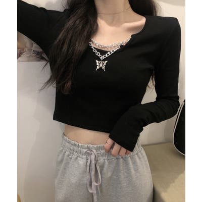 胸元に蝶々がついたインパクトのある韓国っぽロングTシャツ。