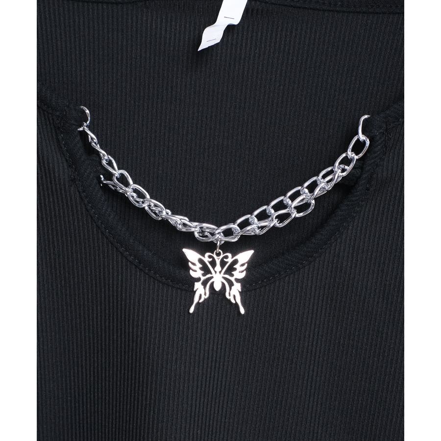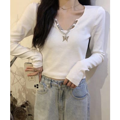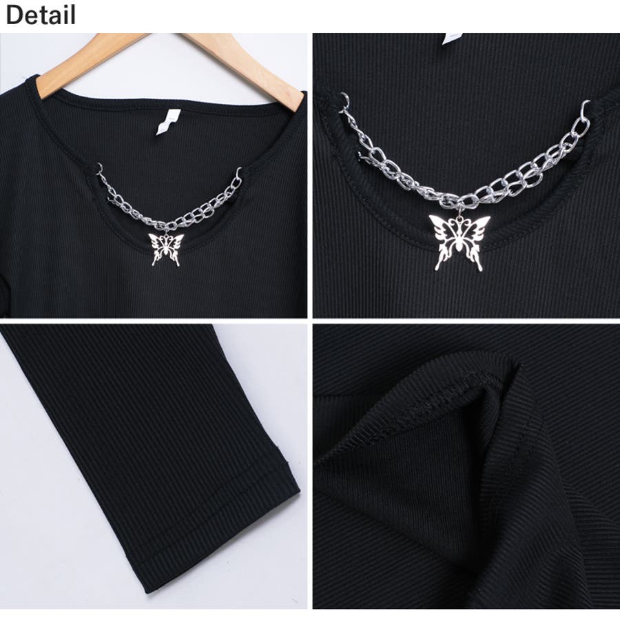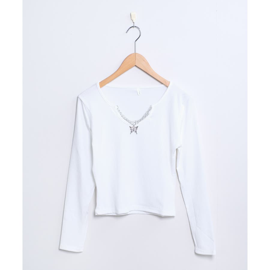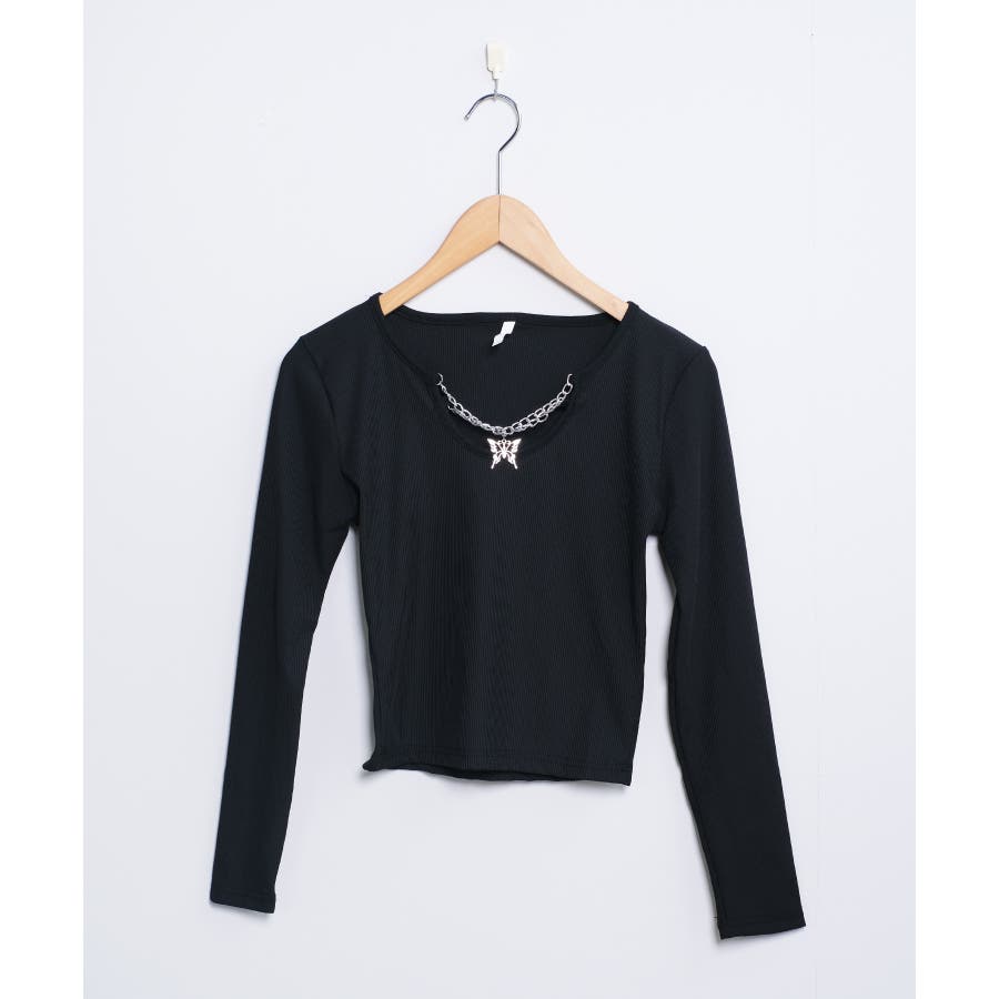 胸元に蝶々がついたインパクトのある韓国っぽロングTシャツ。