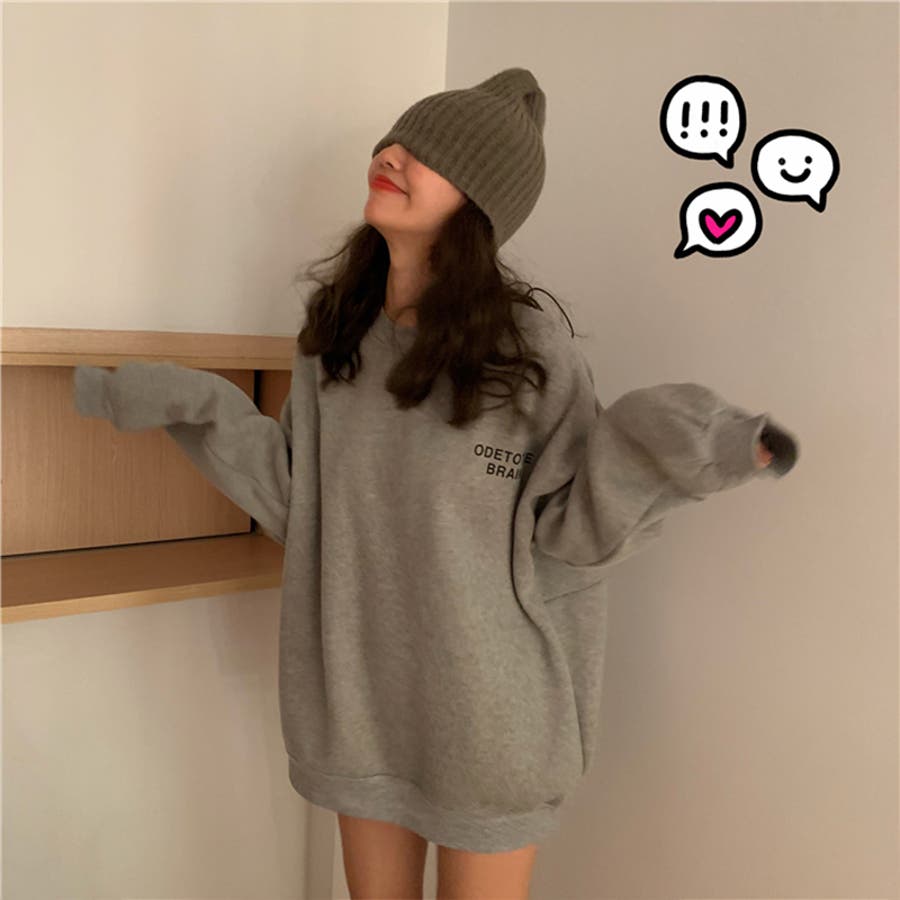 ゆるっと可愛い ロゴトレーナー。 裏起毛でふんわりあったか♪ お尻まですっぽり隠せる オーバーサイズで 体型カバーも◎ ロゴ入りで秋冬の カジュアルコーデにオススメ◎