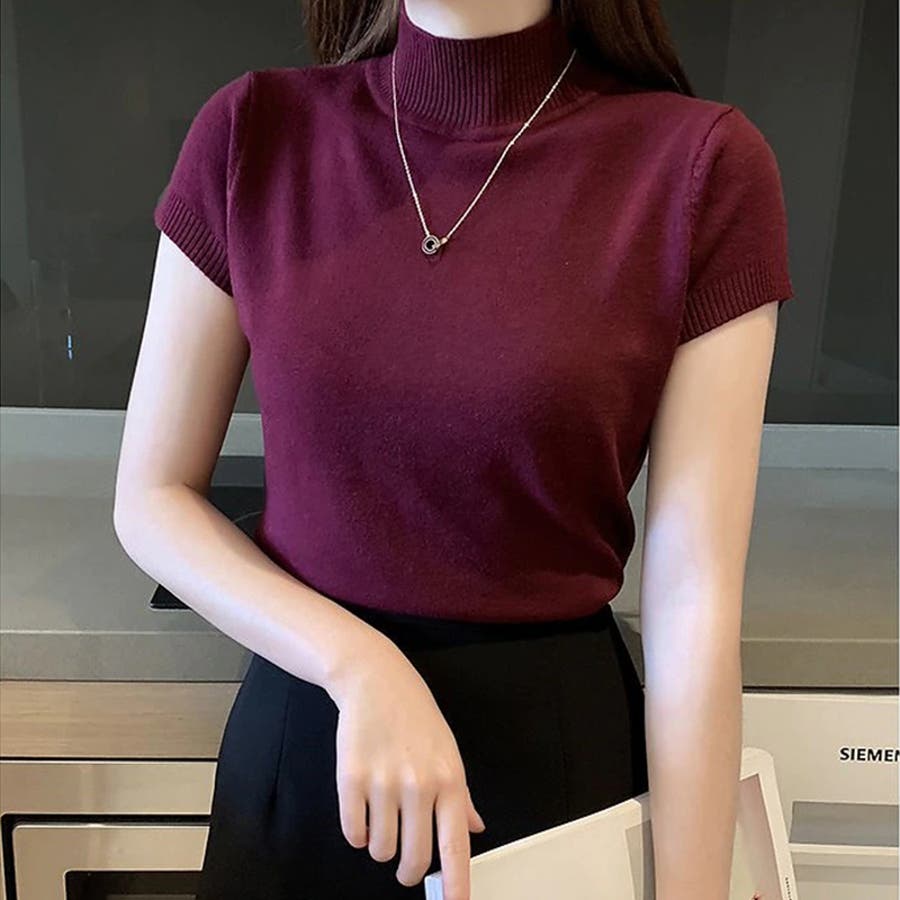 品よく決まるハイネックサマーニット 半袖ハイネックニット サマーニット