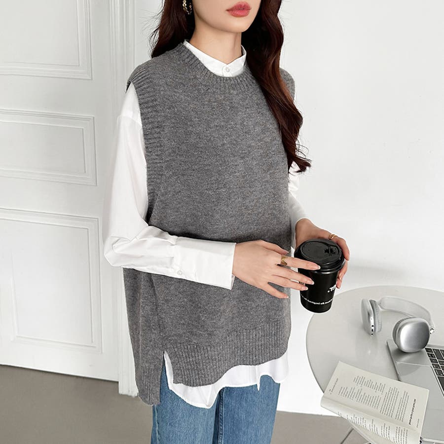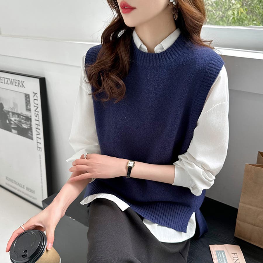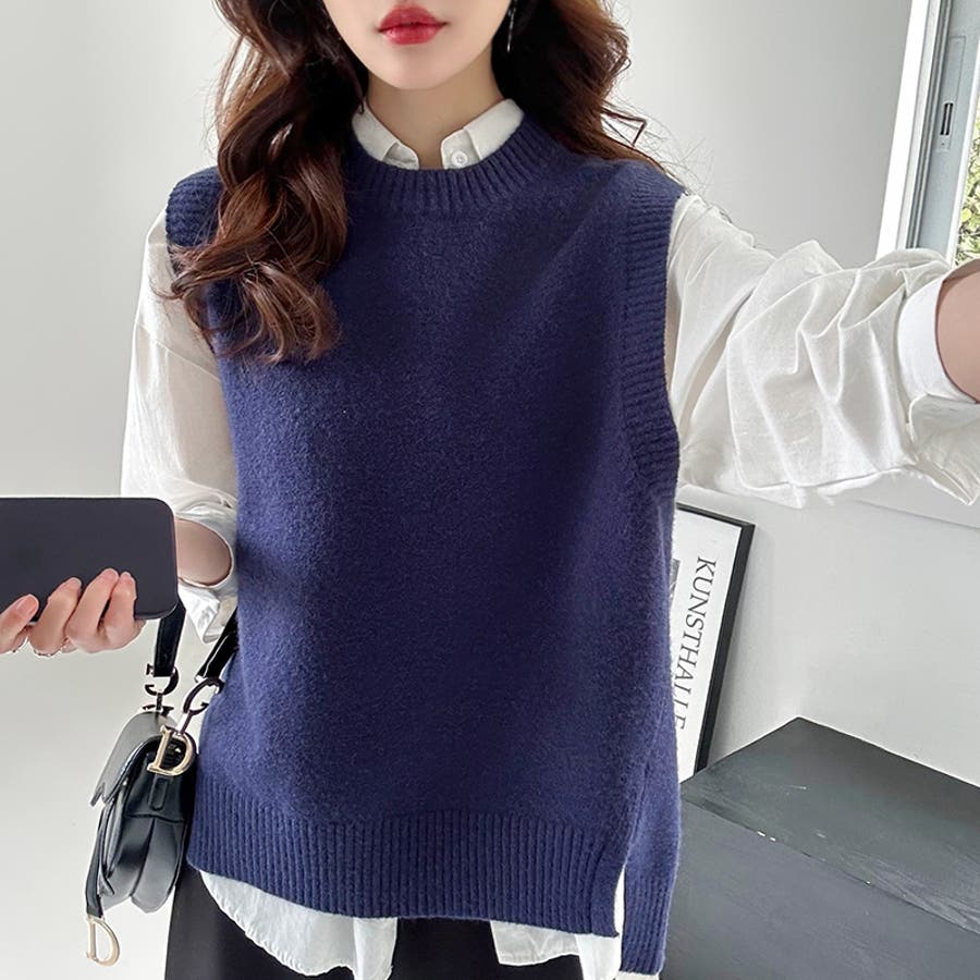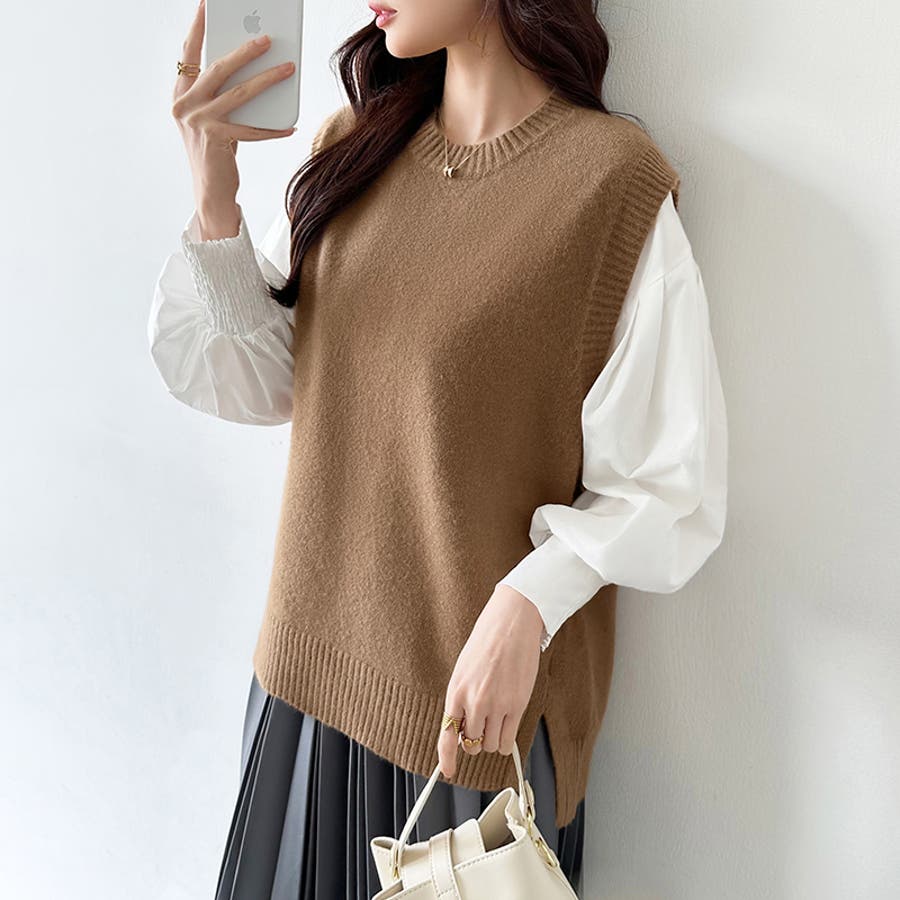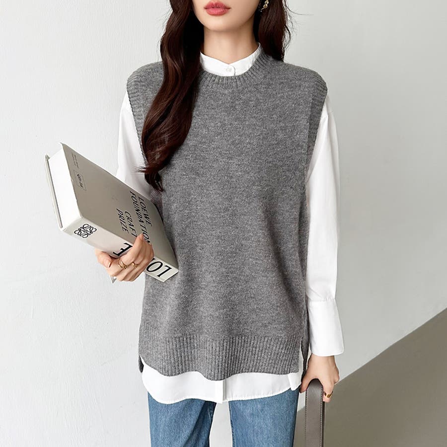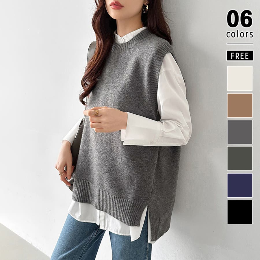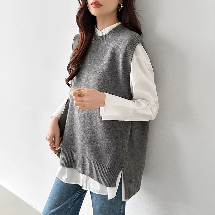 レディースニットベスト ニット ベスト セーター トップス ラウンドネック サイドスリット 可愛い カジュアル 通勤 通学