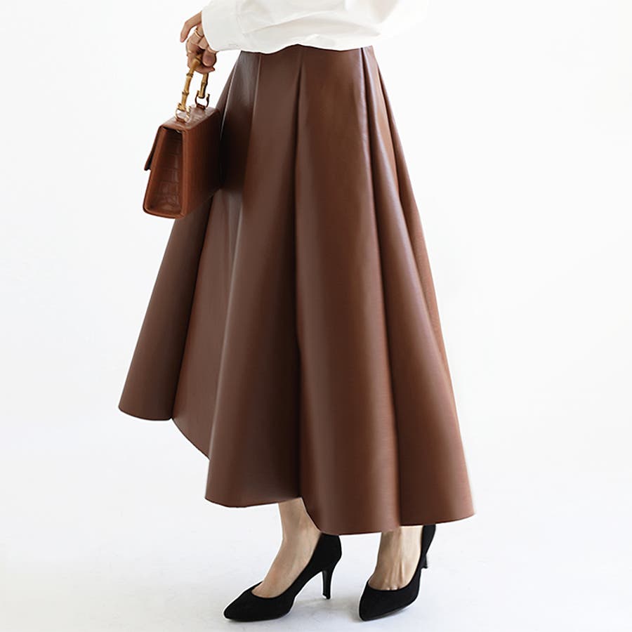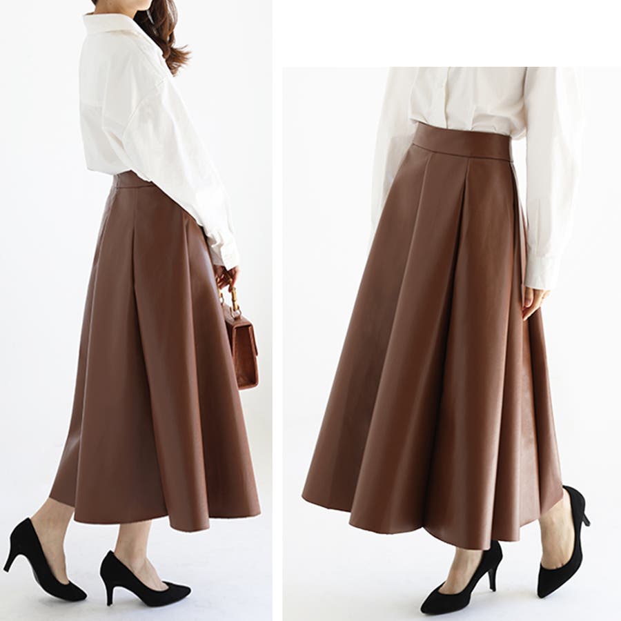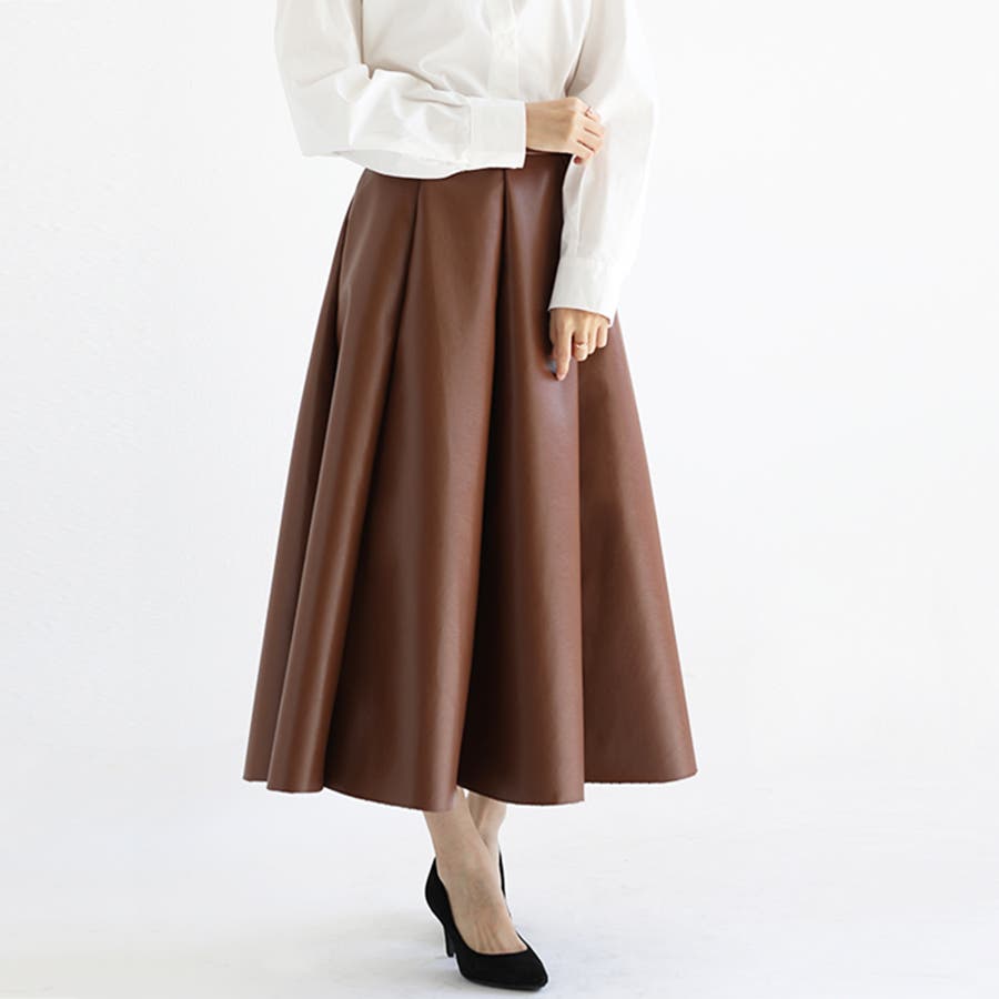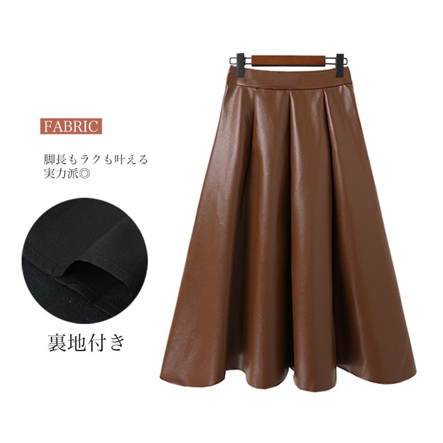 レディース ボトムス スカート フェイクレザー フレアスカート ハイウエスト ロングスカート シンプル オフィスカジュアル