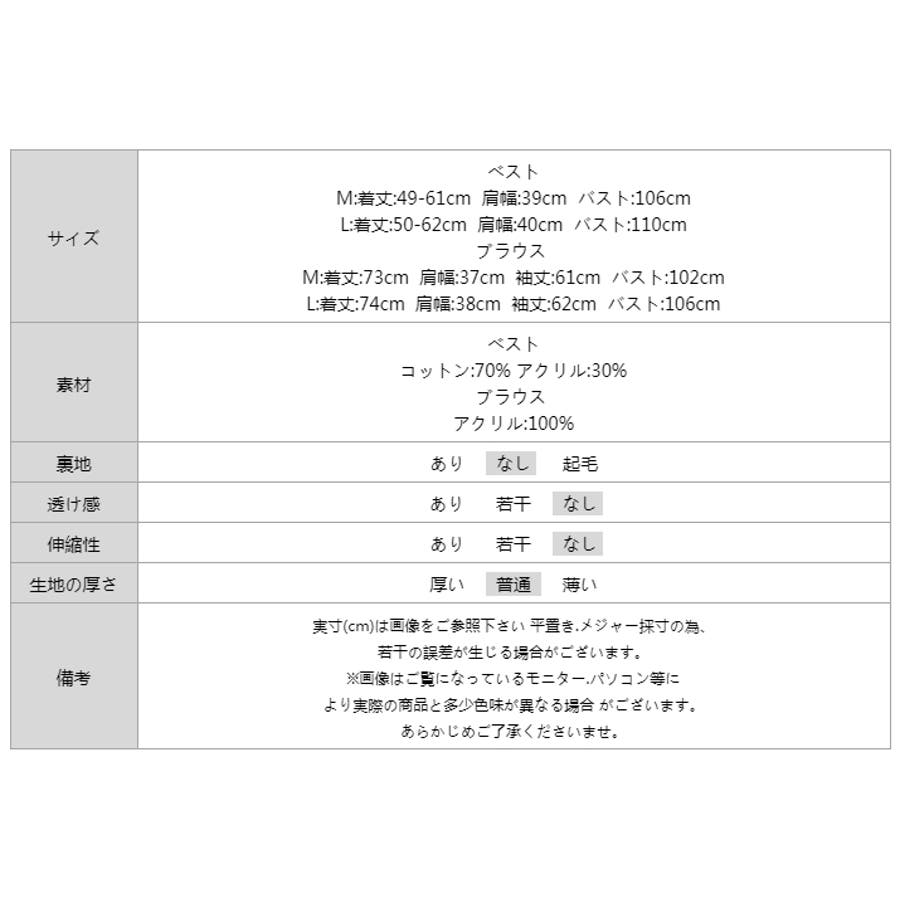 | サイズ | ベスト M: 着丈 49-61cm 肩幅 39cm バスト 106cm L: 着丈 50-62cm 肩幅 40cm バスト 110cm ブラウス M: 着丈 73cm 肩幅 37cm 袖丈 61cm バスト 102cm L: 着丈 74cm 肩幅 38cm 袖丈 62cm バスト 106cm |