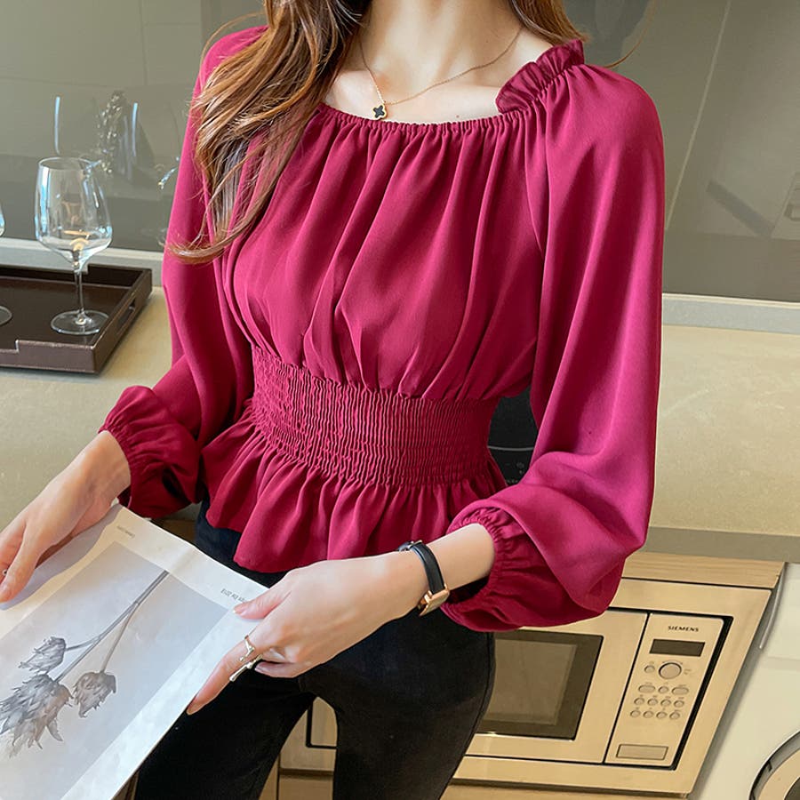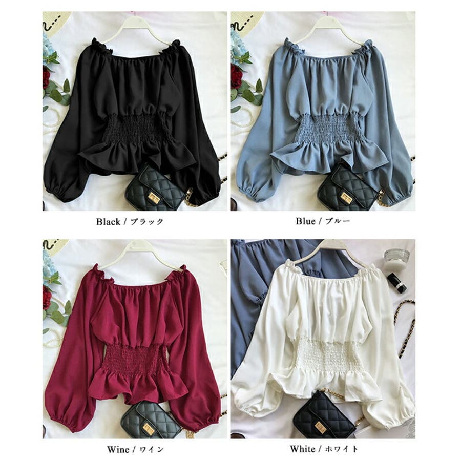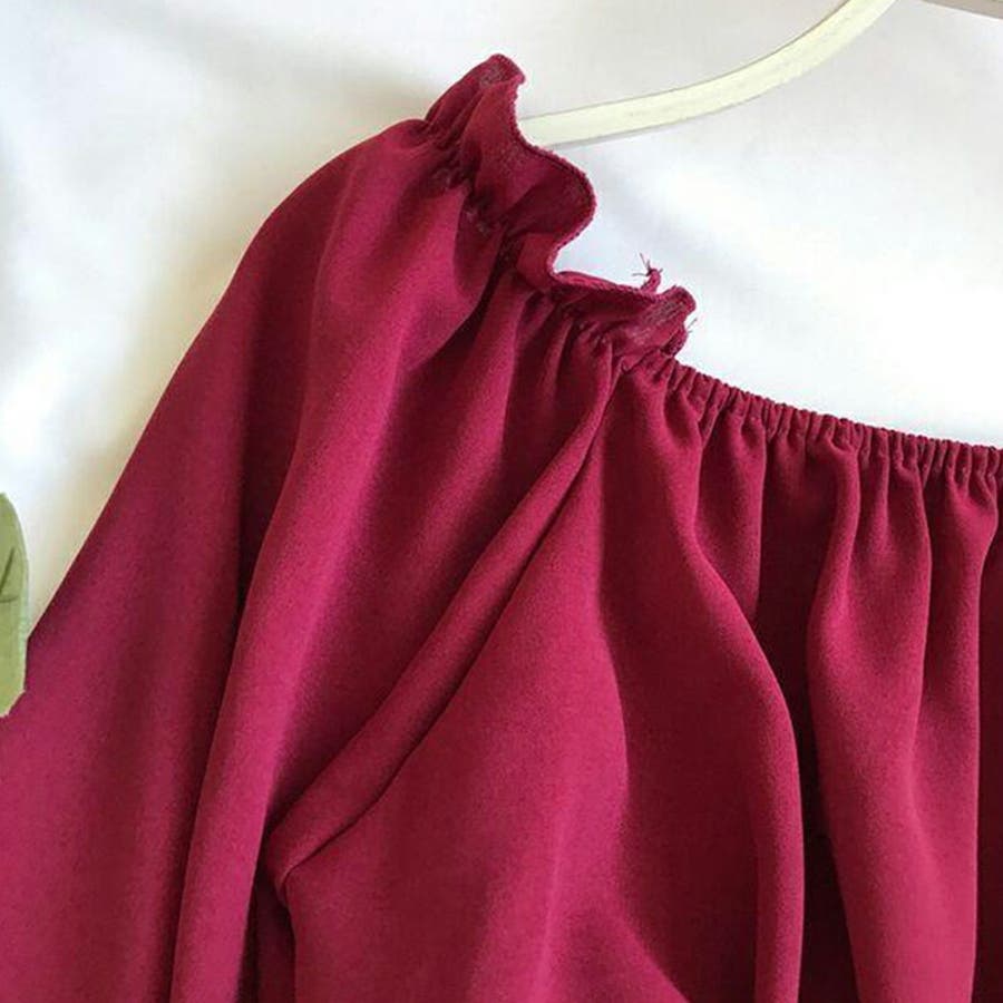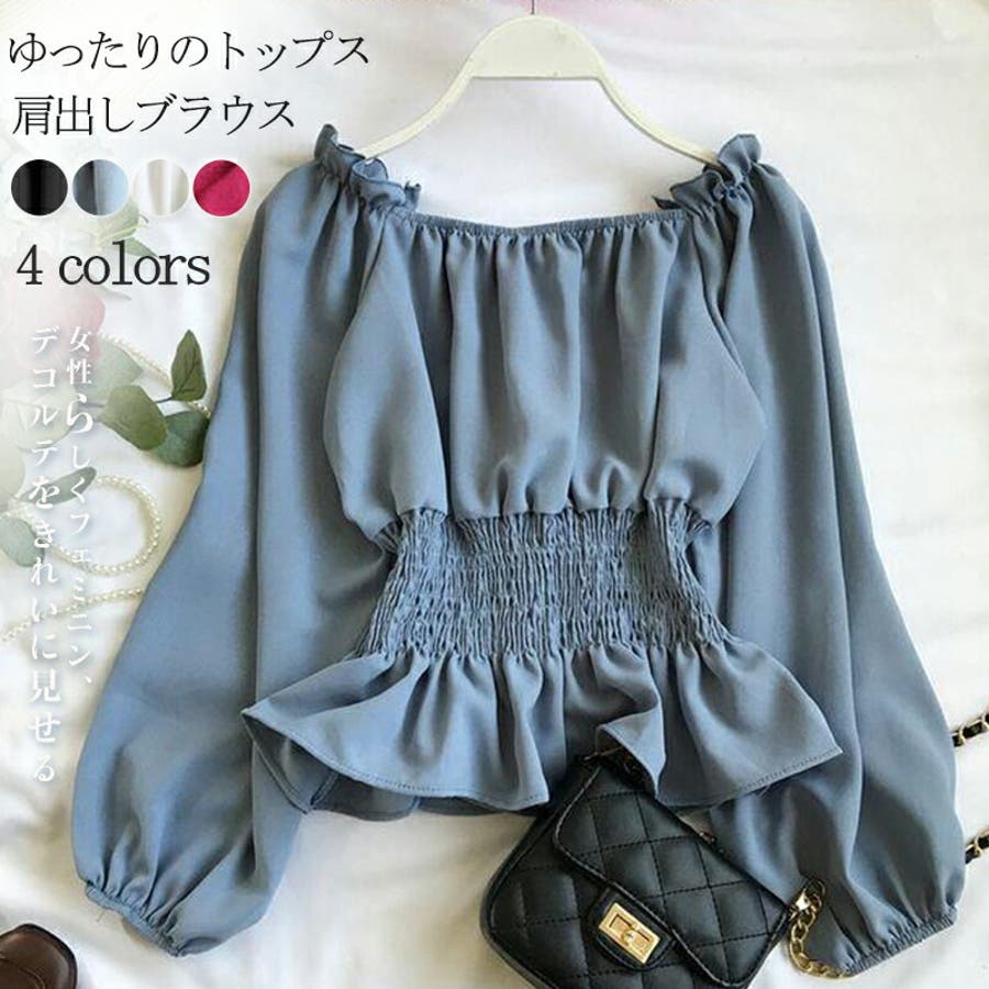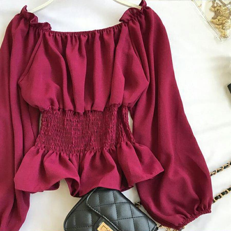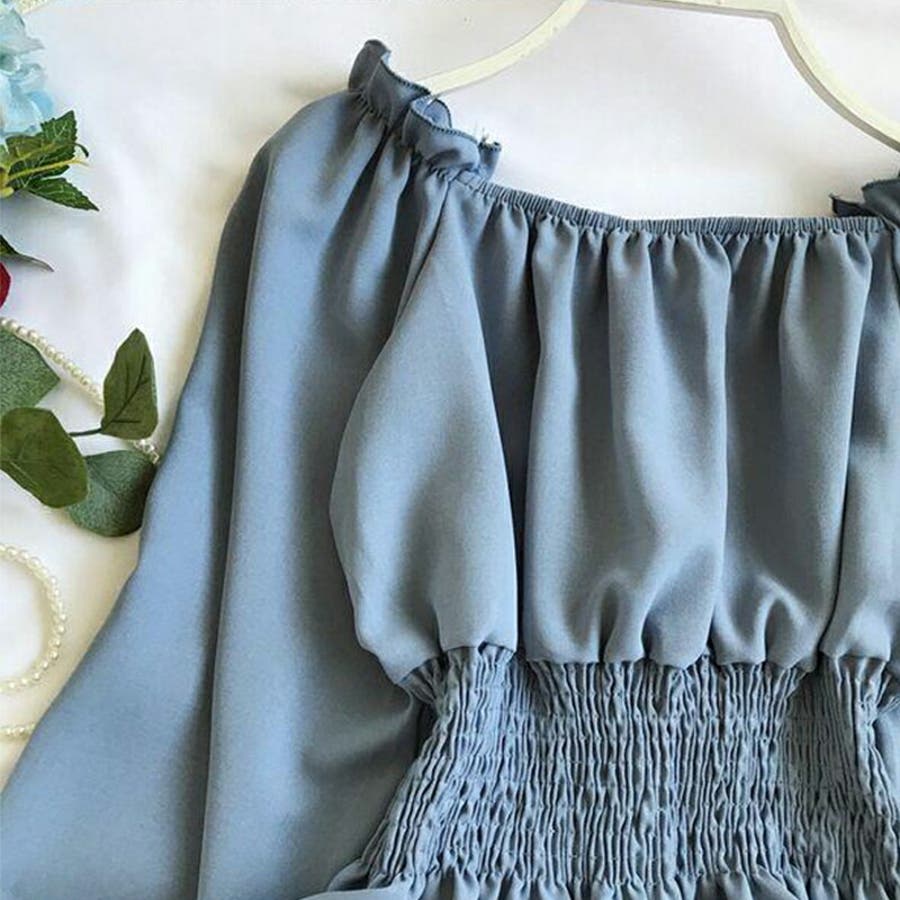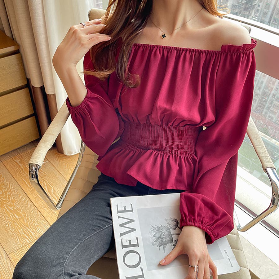 夏 夏服 セクシー ショルダー シャーリング 無地 ミドル丈 長袖 バルーンスリーブ ポリエステル 肩出し 肌見せ ギャザー 大人かわいい エレガント フェミニン ママコーデ 20代 30代 40代 韓国風 韓国ファッション 韓国