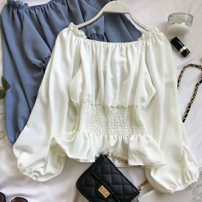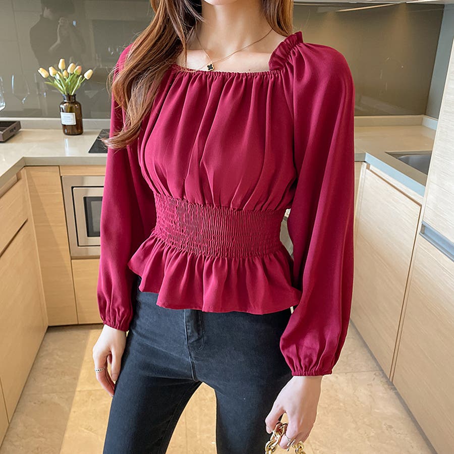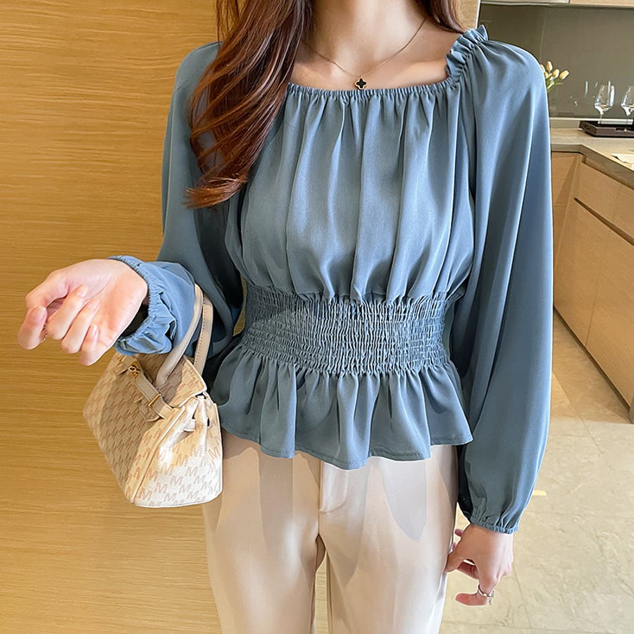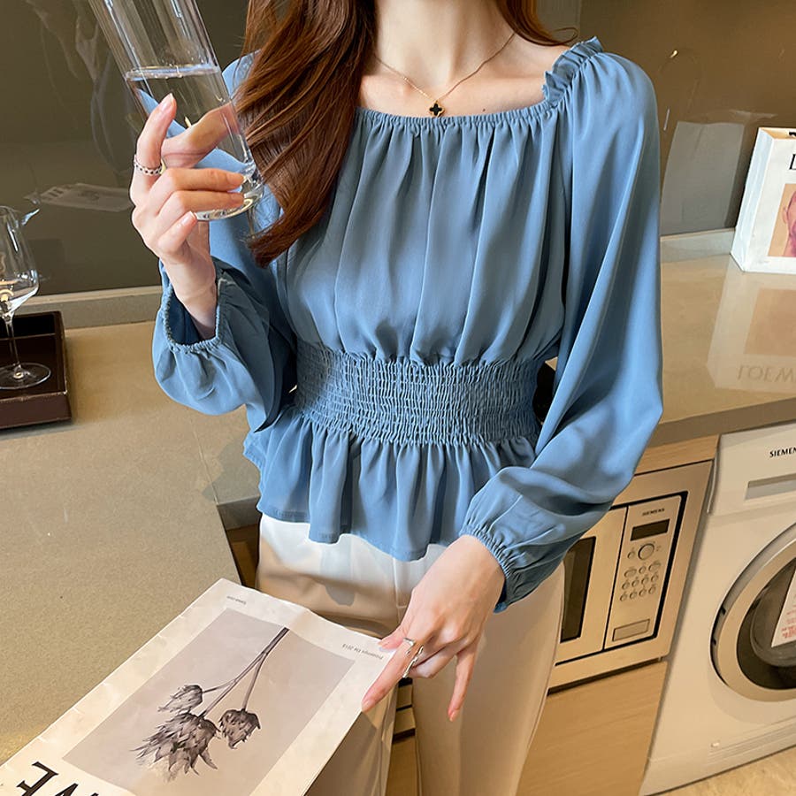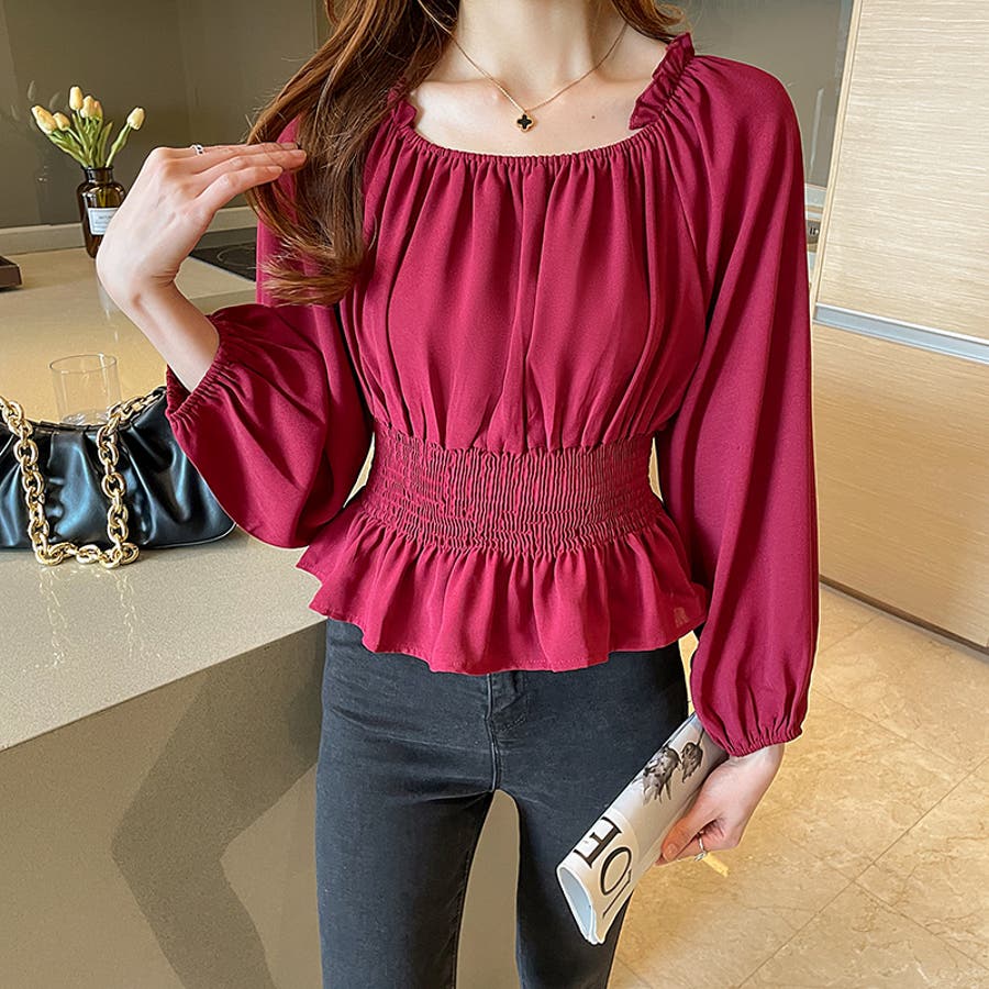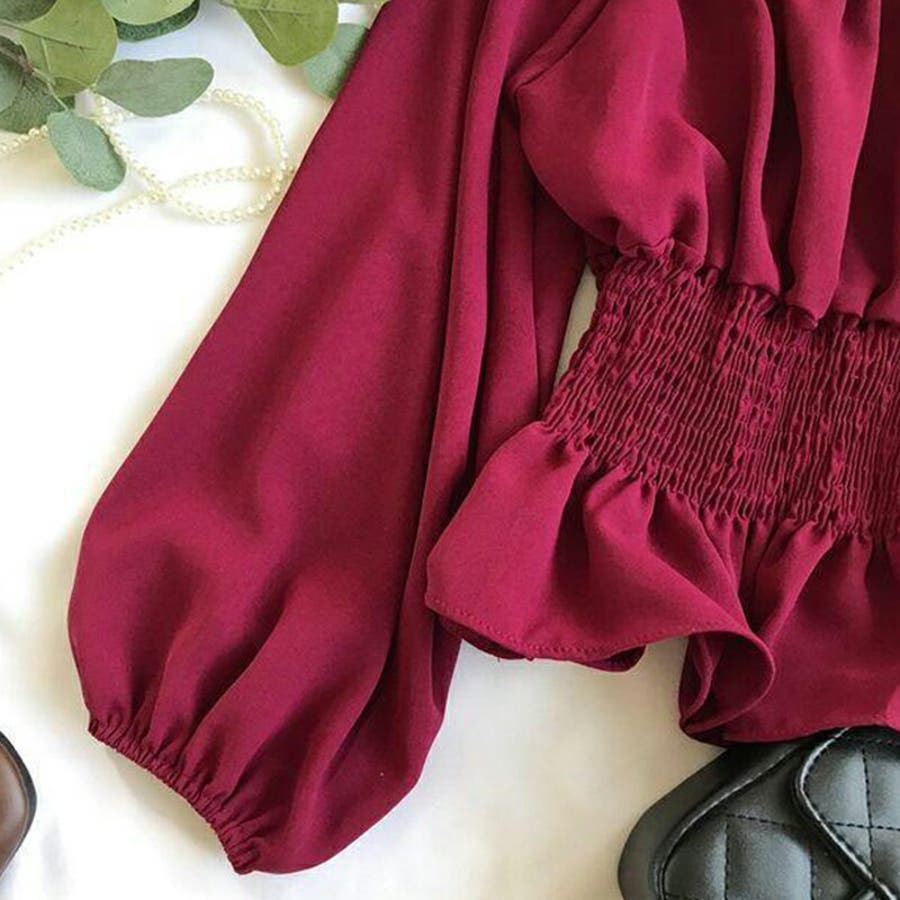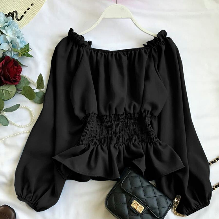 夏 夏服 セクシー ショルダー シャーリング 無地 ミドル丈 長袖 バルーンスリーブ ポリエステル 肩出し 肌見せ ギャザー 大人かわいい エレガント フェミニン ママコーデ 20代 30代 40代 韓国風 韓国ファッション 韓国