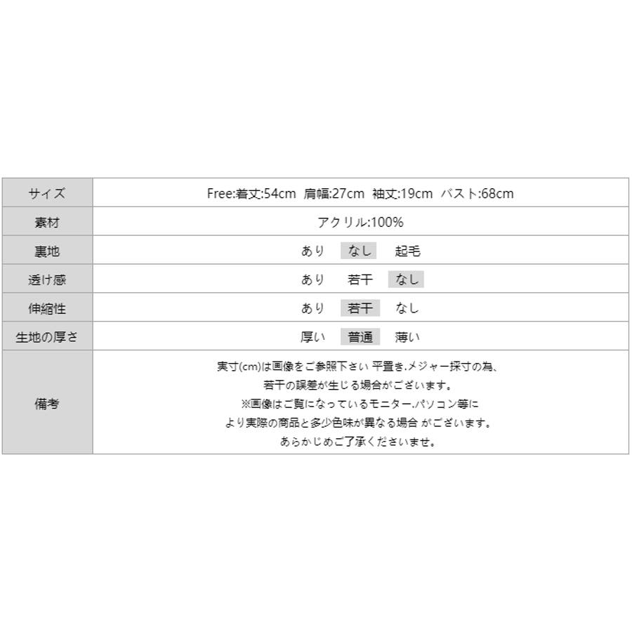 | サイズ | Free: 着丈 54cm 袖丈 19cm 肩幅 27cm バスト 68cm |