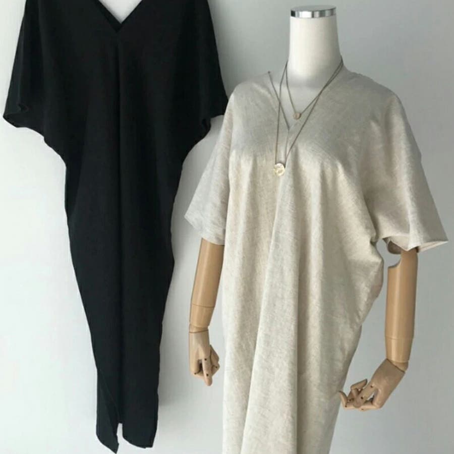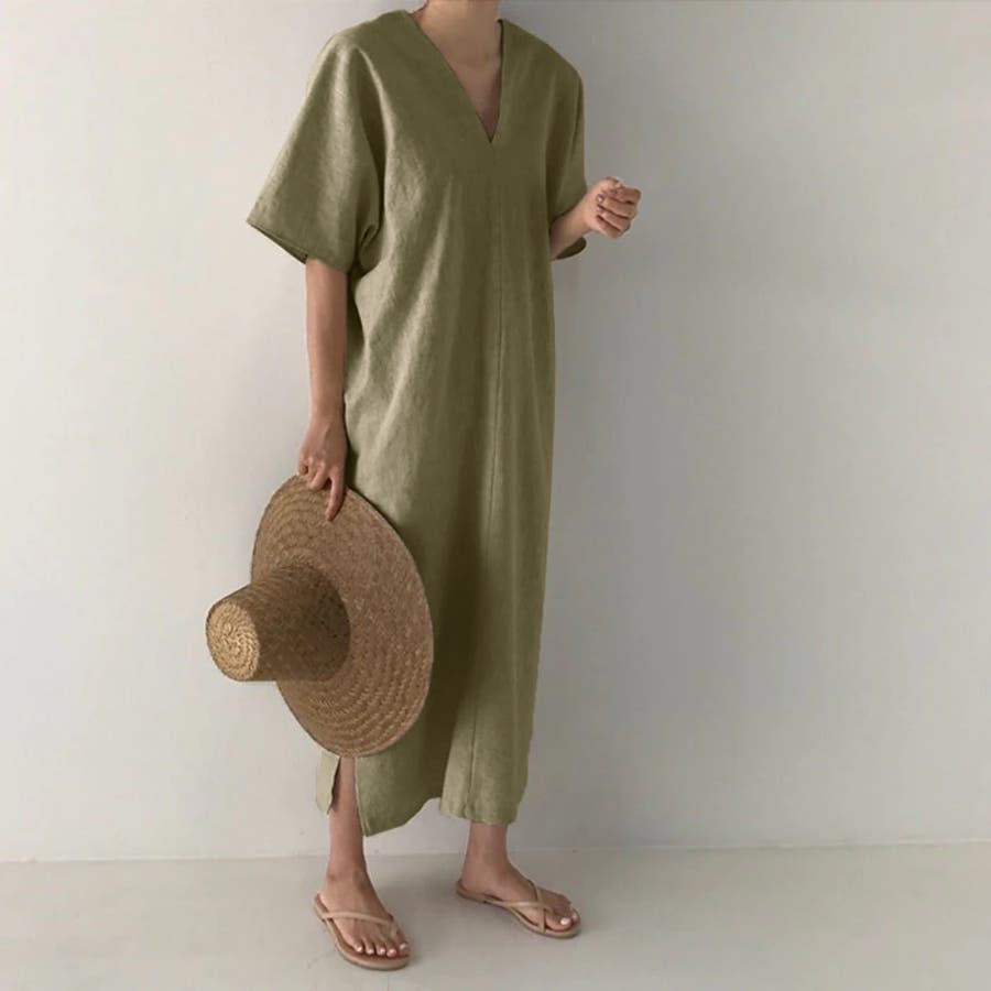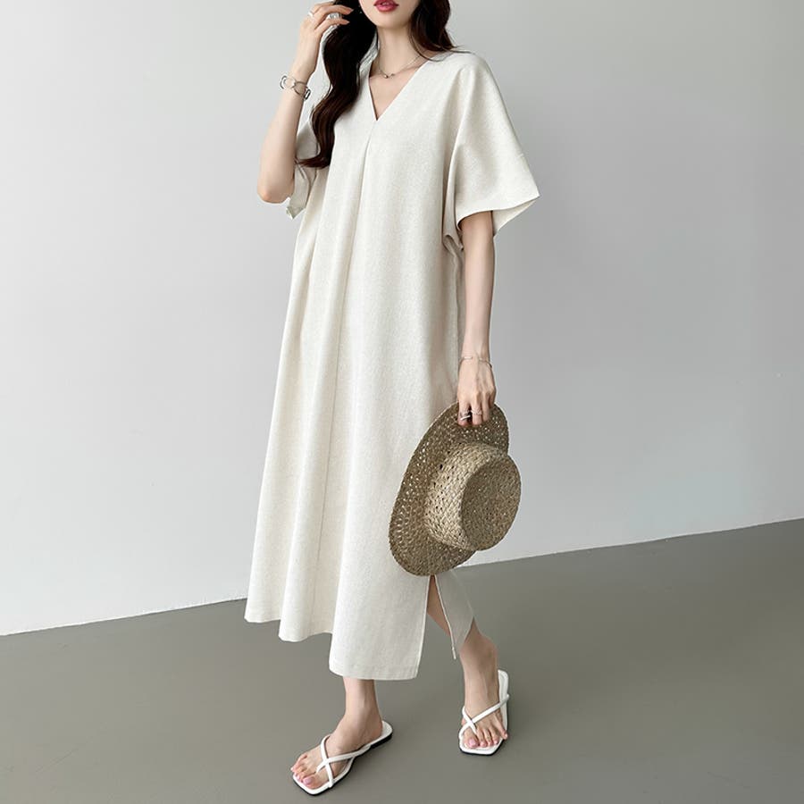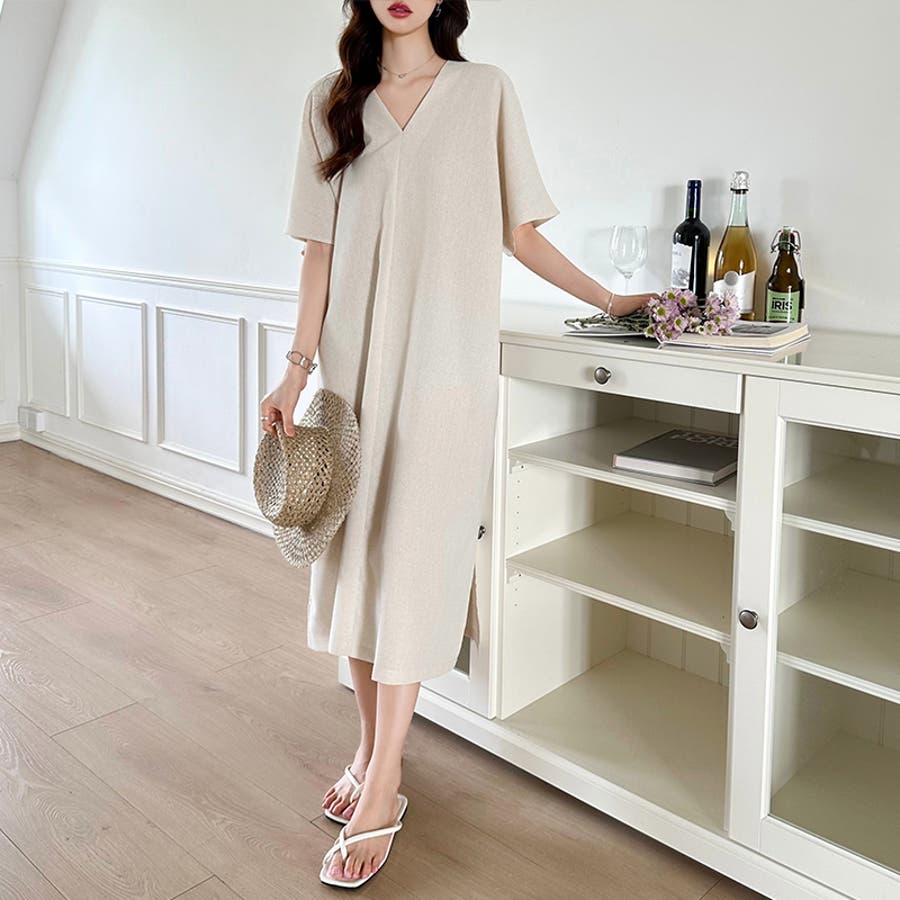 コットンリネンワンピース 夏ワンピース Vネックロングワンピース
