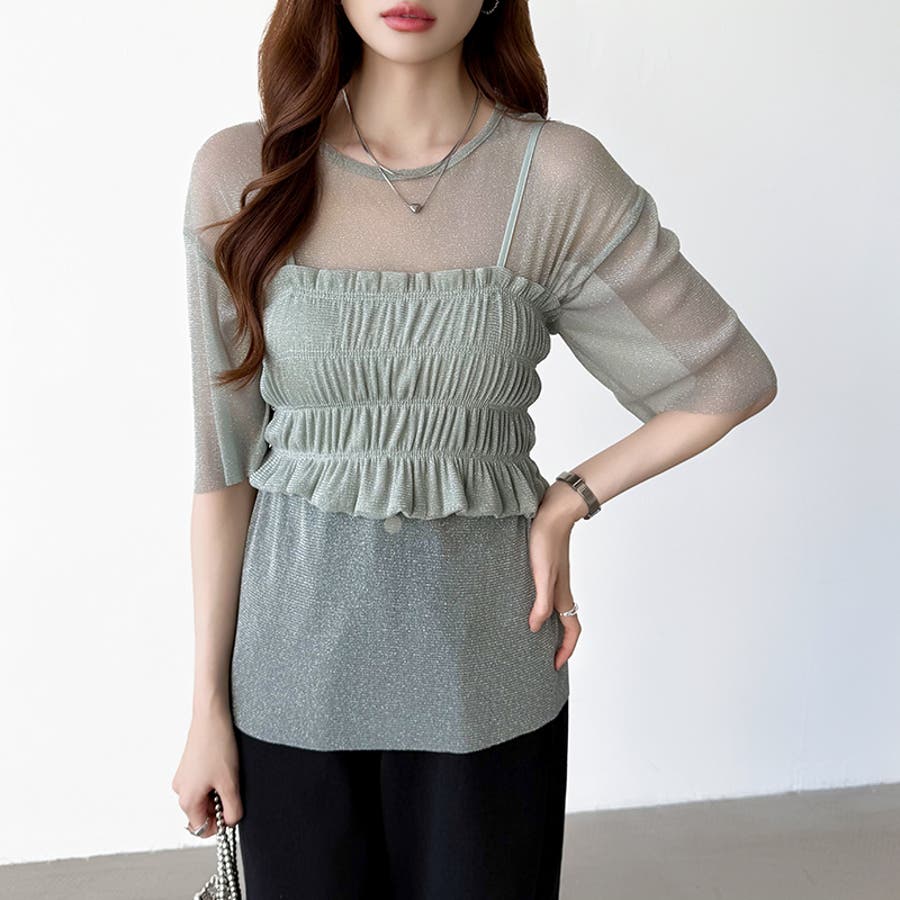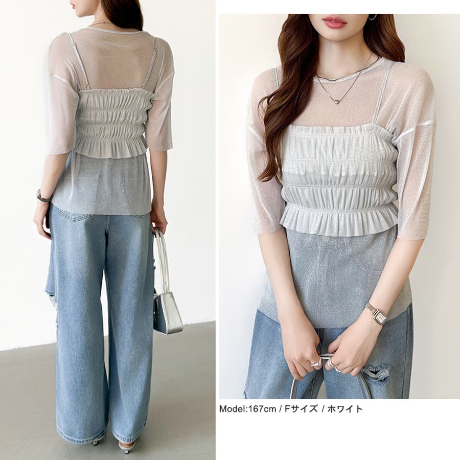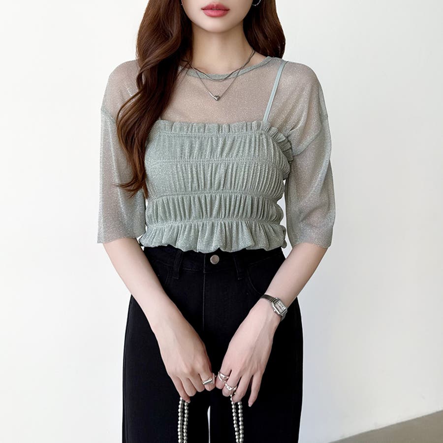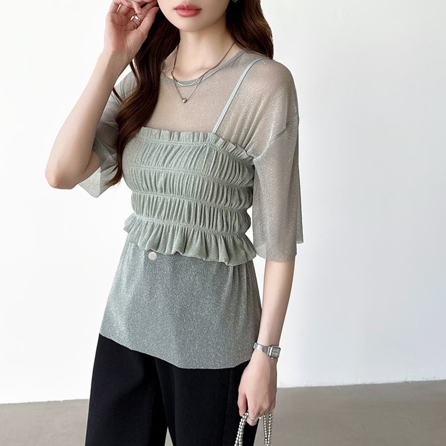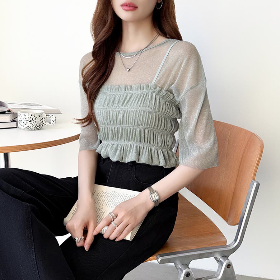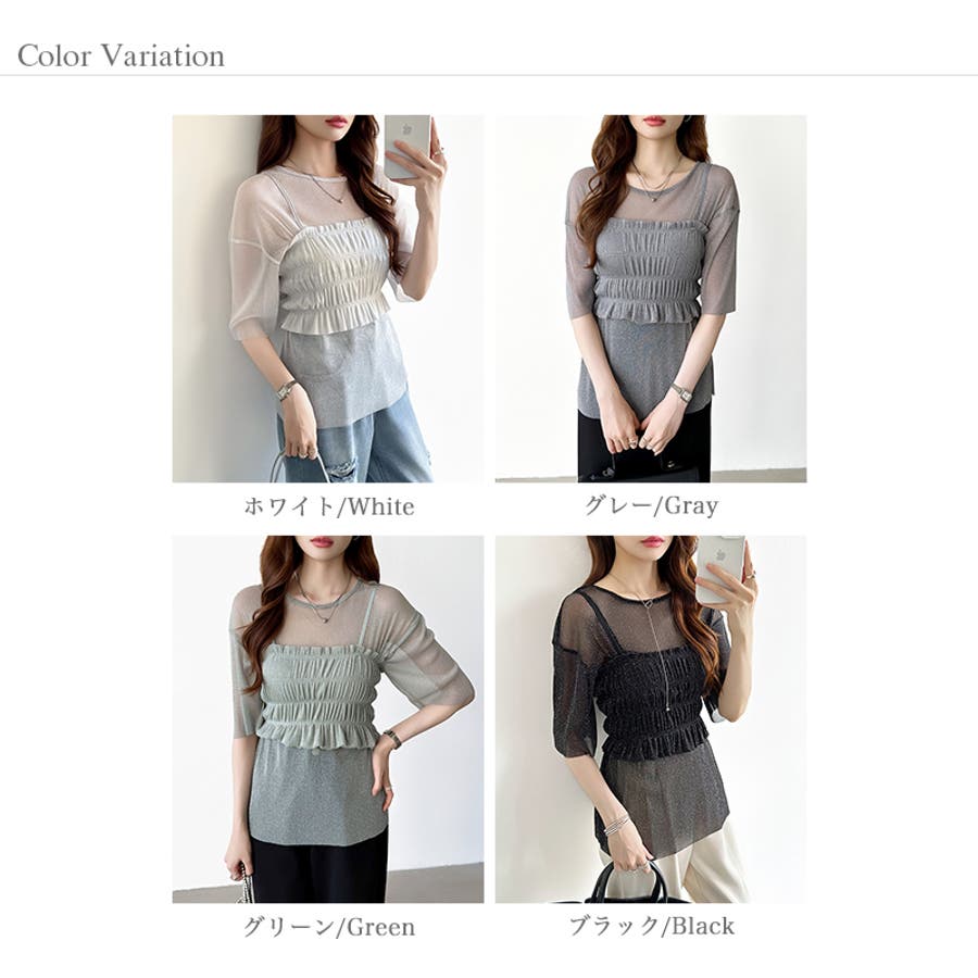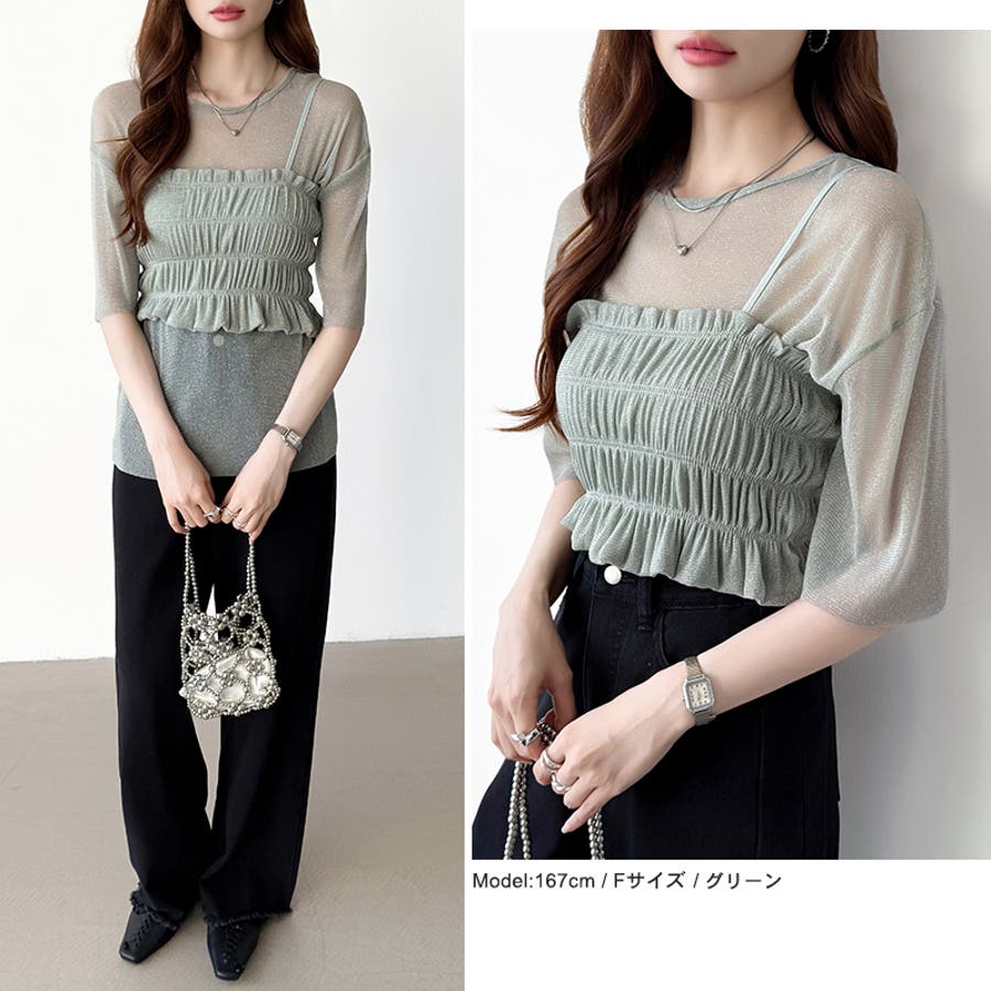 シアートップス ビスチェセット ラメシアートップス 半袖 レディース 2点セット ラメ シアー トップス カットソー ビスチェ セット キャミソール 五分袖 透け感 レイヤード 重ね着 インナー キラキラ ゆったり シースルー シアーカットソー シアーインナー キラキラトップス 2点 シャーリング ギャザー アンサンブル 伸縮性 ストレッチ 大きい 大きめ 大きいサイズ ラウンドネック クルーネック 薄手 涼しい シアートップスレディース レイヤードトップス レイヤードインナー シースルートップス 透けトップス 通気性 透け 感 薄い 透かし 透けシアー 透け感生地 プルオーバー シアー素材 重ね 着 袖 二の腕カバー 二の腕 カバー 隠し サマー tops さらさら ポリエステル ポリエステル100% さらさら 涼しい 肌見せ 露出控えめ 露出少なめ フィット 伸縮性 ストレッチ 伸びる 冷房対策 シワになりにくい 洗える 洗濯機で洗える 毛玉になりにくい 韓国風 セクシー モード カジュアル 大人 かわいい 可愛い 大人可愛い おしゃれ オシャレ ママ 母 ママコーデ プチプラ 高見え トレンド ヒット 商品 おすすめ 服 服装 ファッション コーデ コーディネート フリー サイズ フリーサイズ ホワイト 白 グレー 灰色 グリーン 緑 ブラック 黒 レディース夏物 レディース春 春トップス レディース夏 夏トップス レディース韓国 レディース夏服トップス 夏服レディース おしゃれレディース 新作 夏物 夏用 春夏 夏 夏服 韓国 韓国ファッション 10代 20代 30代 40代 50代 cocomomo ココモモ