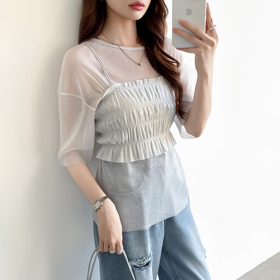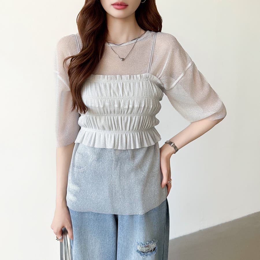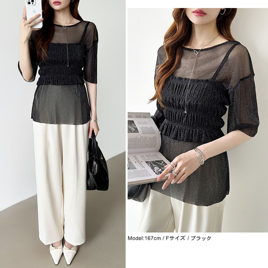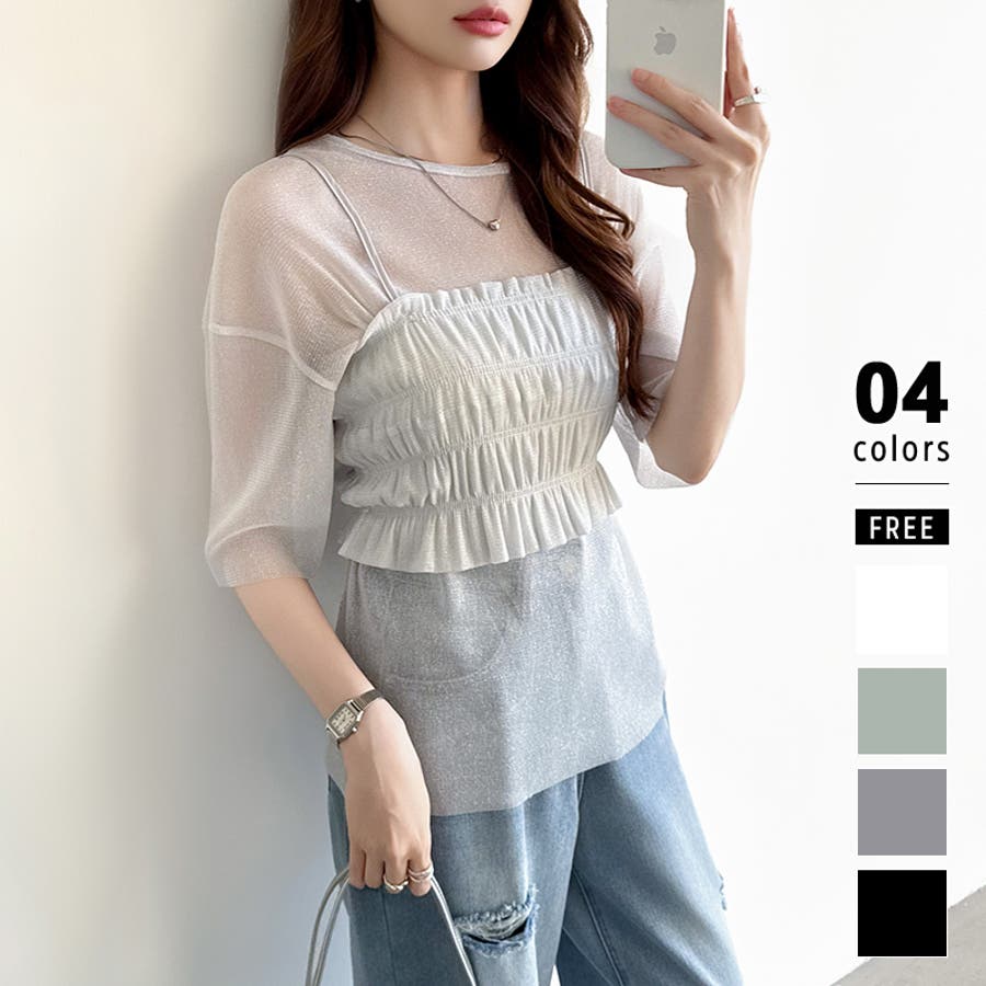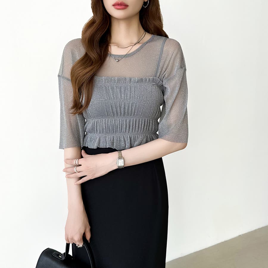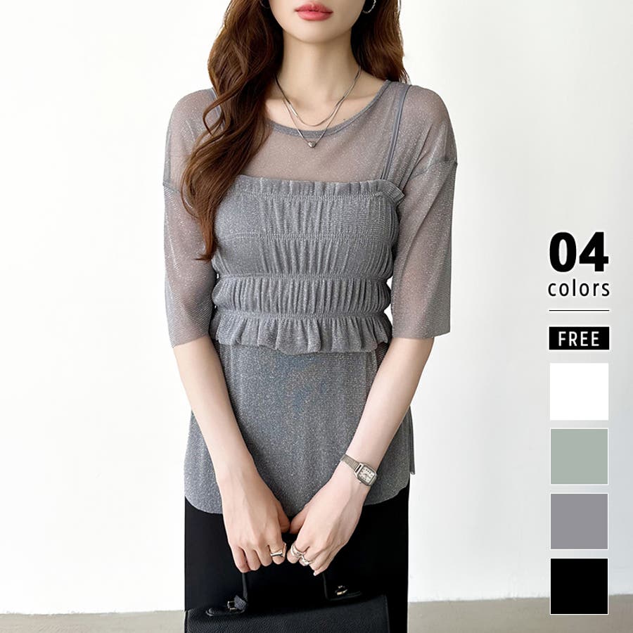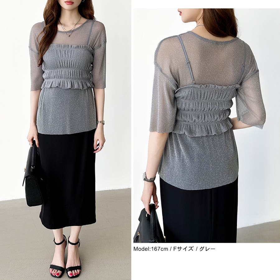 シアートップス ビスチェセット ラメシアートップス 半袖 レディース 2点セット ラメ シアー トップス カットソー ビスチェ セット キャミソール 五分袖 透け感 レイヤード 重ね着 インナー キラキラ ゆったり シースルー シアーカットソー シアーインナー キラキラトップス 2点 シャーリング ギャザー アンサンブル 伸縮性 ストレッチ 大きい 大きめ 大きいサイズ ラウンドネック クルーネック 薄手 涼しい シアートップスレディース レイヤードトップス レイヤードインナー シースルートップス 透けトップス 通気性 透け 感 薄い 透かし 透けシアー 透け感生地 プルオーバー シアー素材 重ね 着 袖 二の腕カバー 二の腕 カバー 隠し サマー tops さらさら ポリエステル ポリエステル100% さらさら 涼しい 肌見せ 露出控えめ 露出少なめ フィット 伸縮性 ストレッチ 伸びる 冷房対策 シワになりにくい 洗える 洗濯機で洗える 毛玉になりにくい 韓国風 セクシー モード カジュアル 大人 かわいい 可愛い 大人可愛い おしゃれ オシャレ ママ 母 ママコーデ プチプラ 高見え トレンド ヒット 商品 おすすめ 服 服装 ファッション コーデ コーディネート フリー サイズ フリーサイズ ホワイト 白 グレー 灰色 グリーン 緑 ブラック 黒 レディース夏物 レディース春 春トップス レディース夏 夏トップス レディース韓国 レディース夏服トップス 夏服レディース おしゃれレディース 新作 夏物 夏用 春夏 夏 夏服 韓国 韓国ファッション 10代 20代 30代 40代 50代 cocomomo ココモモ