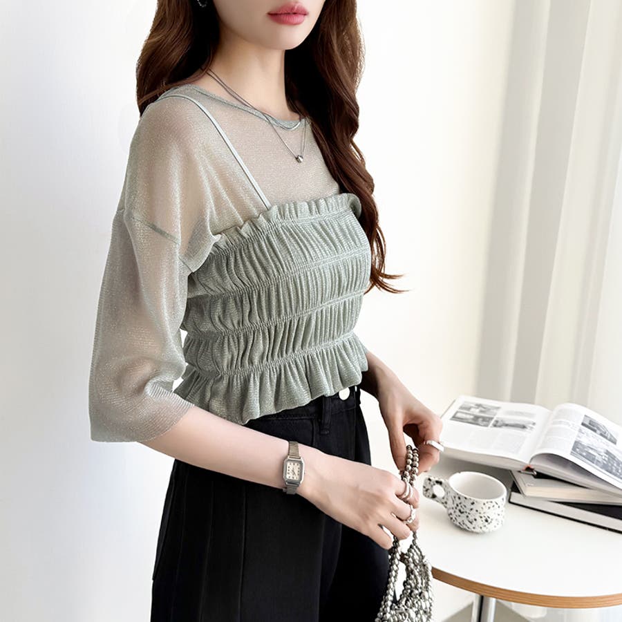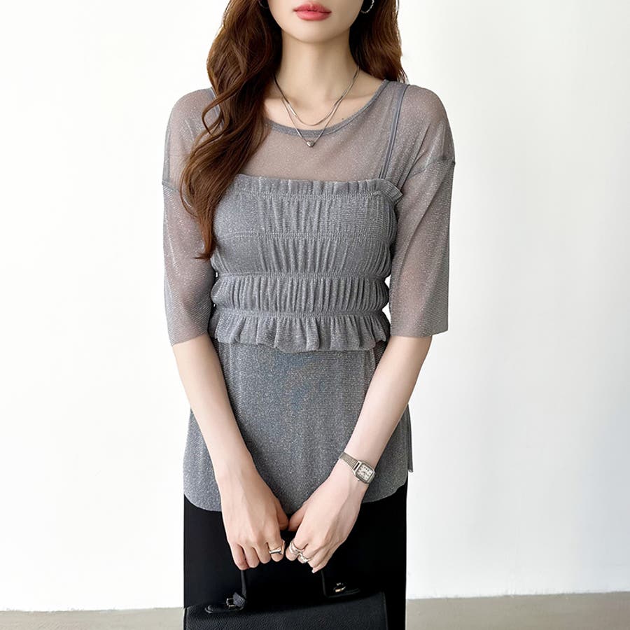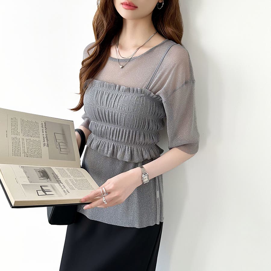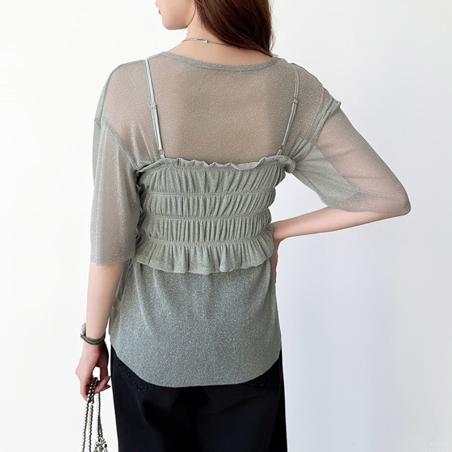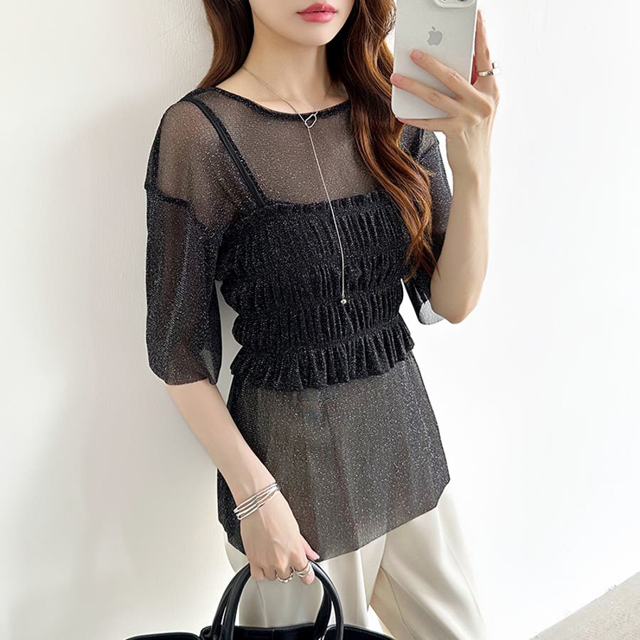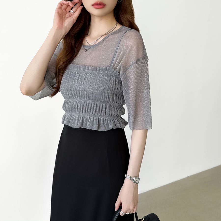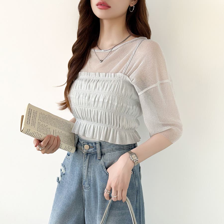 シアートップス ビスチェセット ラメシアートップス 半袖 レディース 2点セット ラメ シアー トップス カットソー ビスチェ セット キャミソール 五分袖 透け感 レイヤード 重ね着 インナー キラキラ ゆったり シースルー シアーカットソー シアーインナー キラキラトップス 2点 シャーリング ギャザー アンサンブル 伸縮性 ストレッチ 大きい 大きめ 大きいサイズ ラウンドネック クルーネック 薄手 涼しい シアートップスレディース レイヤードトップス レイヤードインナー シースルートップス 透けトップス 通気性 透け 感 薄い 透かし 透けシアー 透け感生地 プルオーバー シアー素材 重ね 着 袖 二の腕カバー 二の腕 カバー 隠し サマー tops さらさら ポリエステル ポリエステル100% さらさら 涼しい 肌見せ 露出控えめ 露出少なめ フィット 伸縮性 ストレッチ 伸びる 冷房対策 シワになりにくい 洗える 洗濯機で洗える 毛玉になりにくい 韓国風 セクシー モード カジュアル 大人 かわいい 可愛い 大人可愛い おしゃれ オシャレ ママ 母 ママコーデ プチプラ 高見え トレンド ヒット 商品 おすすめ 服 服装 ファッション コーデ コーディネート フリー サイズ フリーサイズ ホワイト 白 グレー 灰色 グリーン 緑 ブラック 黒 レディース夏物 レディース春 春トップス レディース夏 夏トップス レディース韓国 レディース夏服トップス 夏服レディース おしゃれレディース 新作 夏物 夏用 春夏 夏 夏服 韓国 韓国ファッション 10代 20代 30代 40代 50代 cocomomo ココモモ