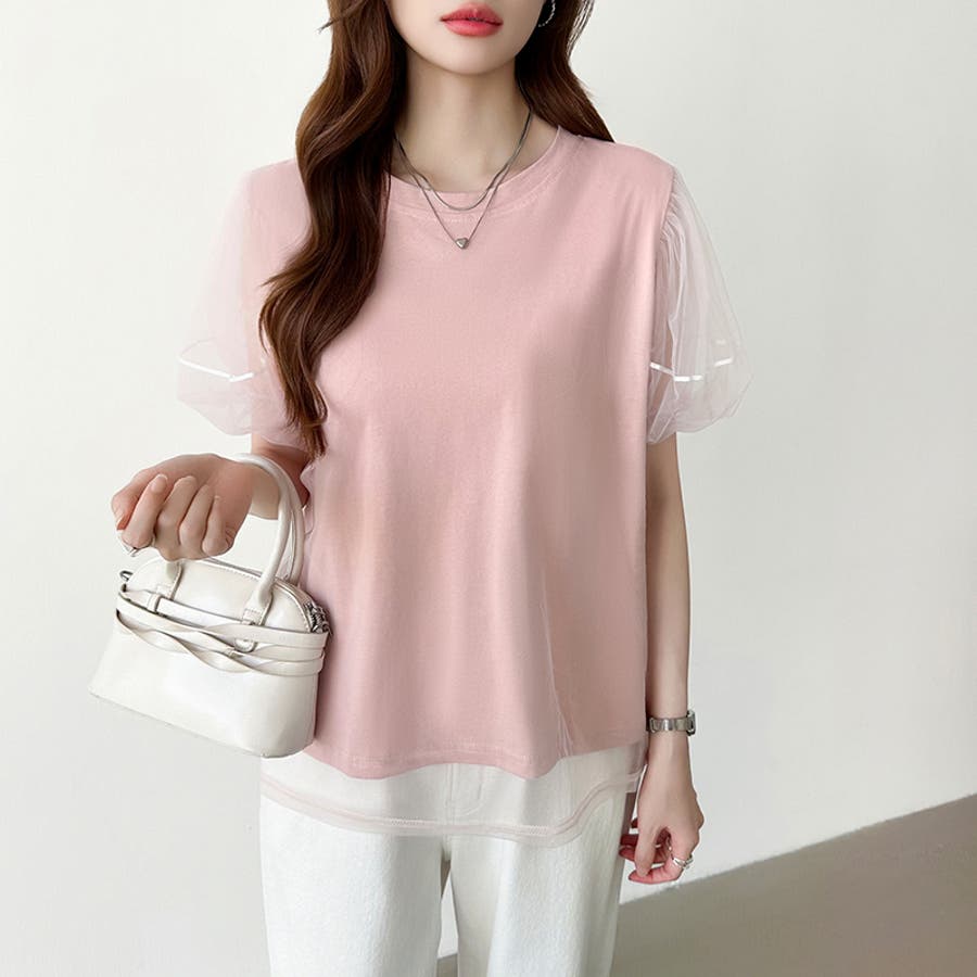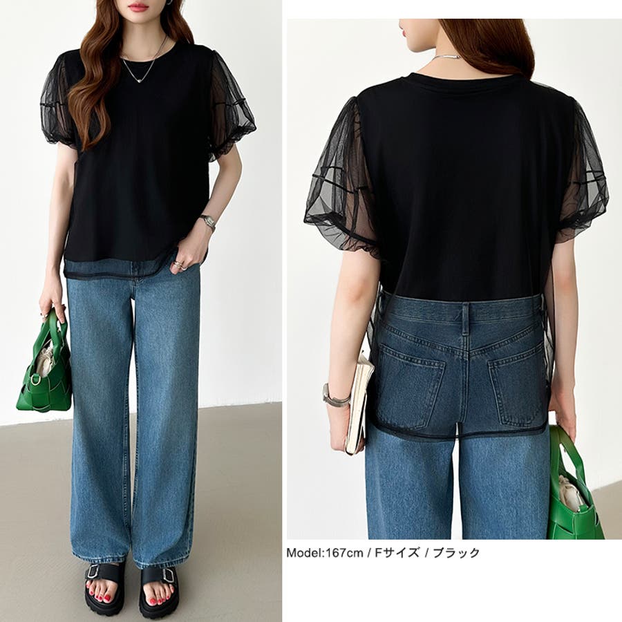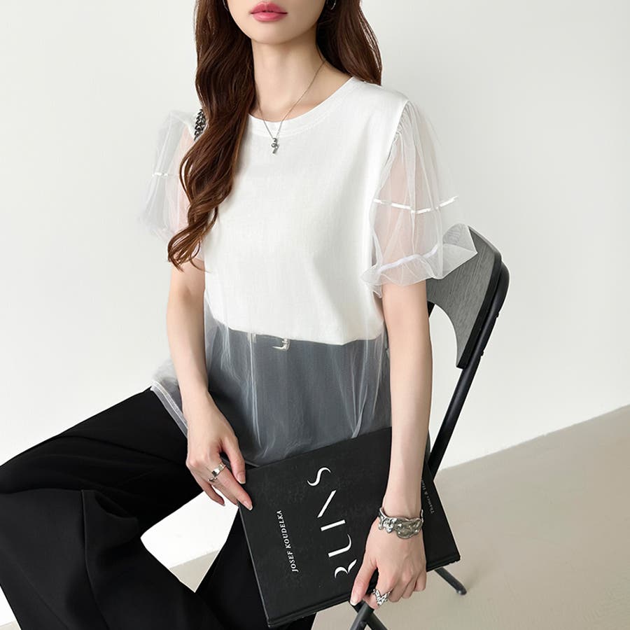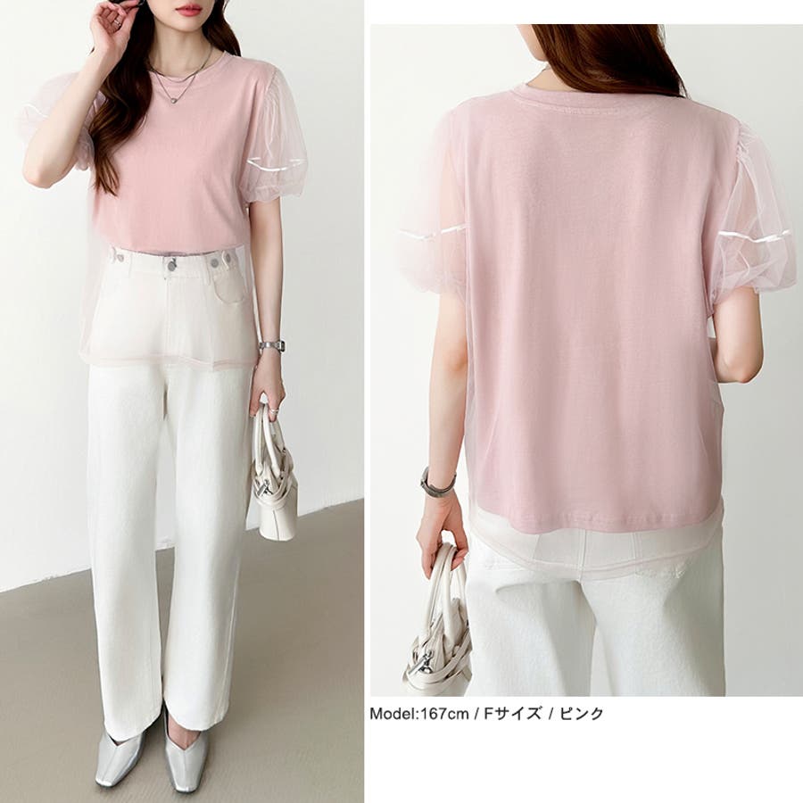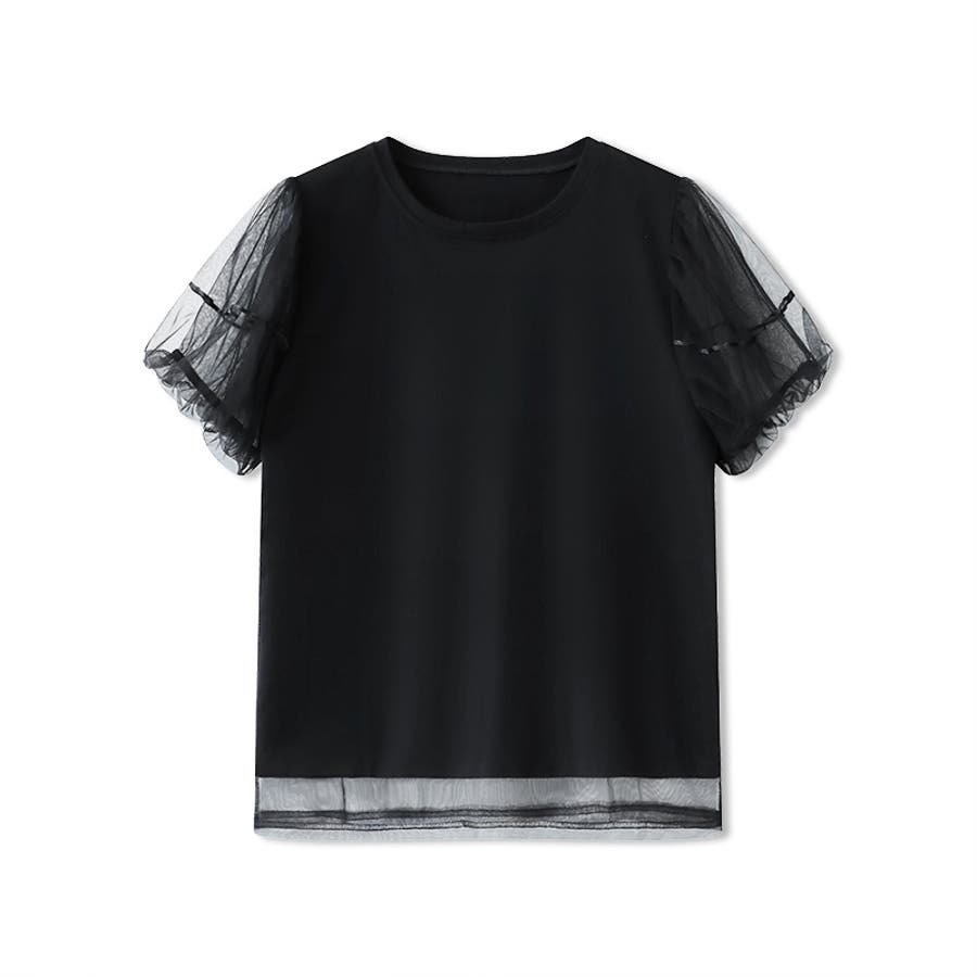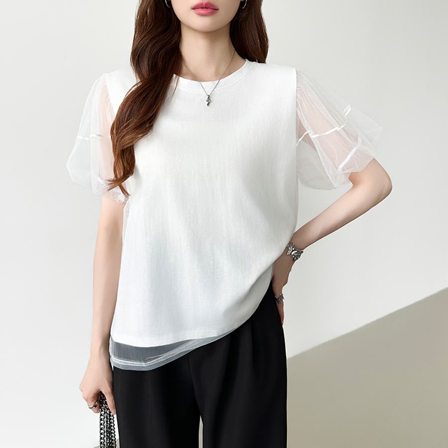 チュールレイヤードtシャツ パフスリーブ 半袖カットソー