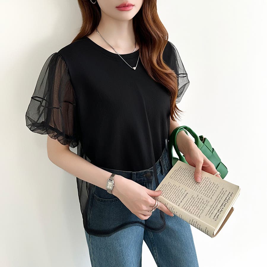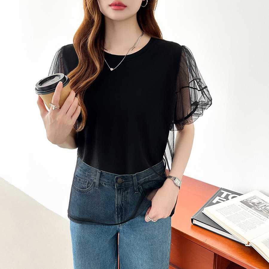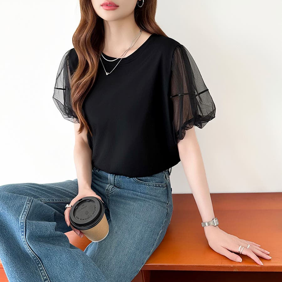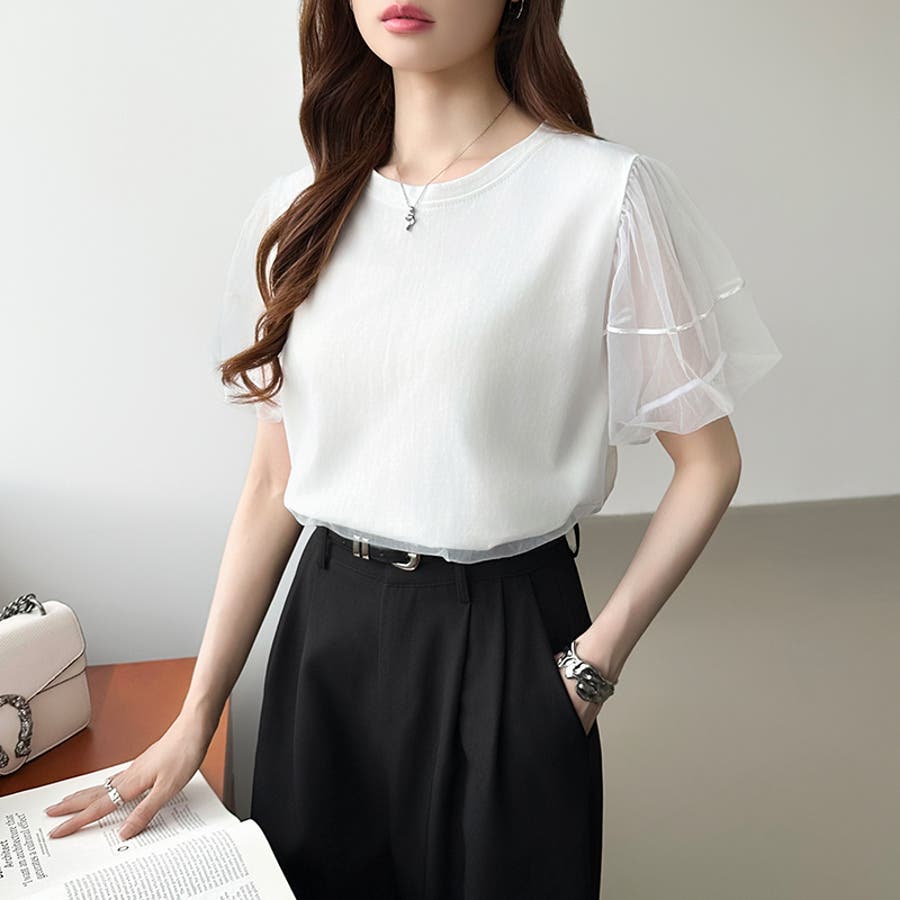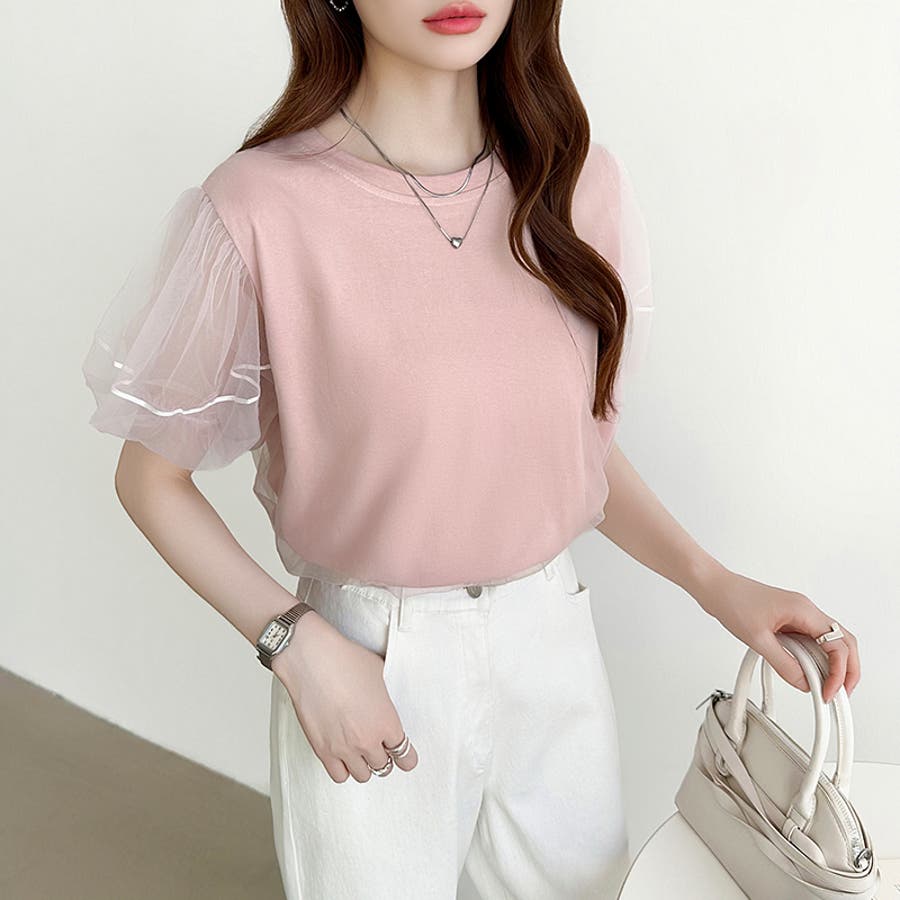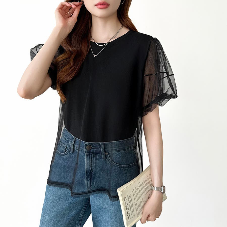 チュールレイヤードtシャツ パフスリーブ 半袖カットソー
