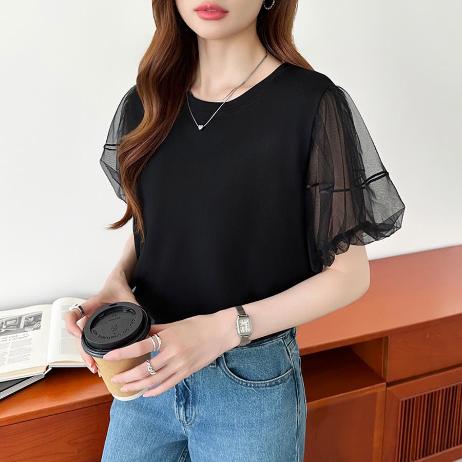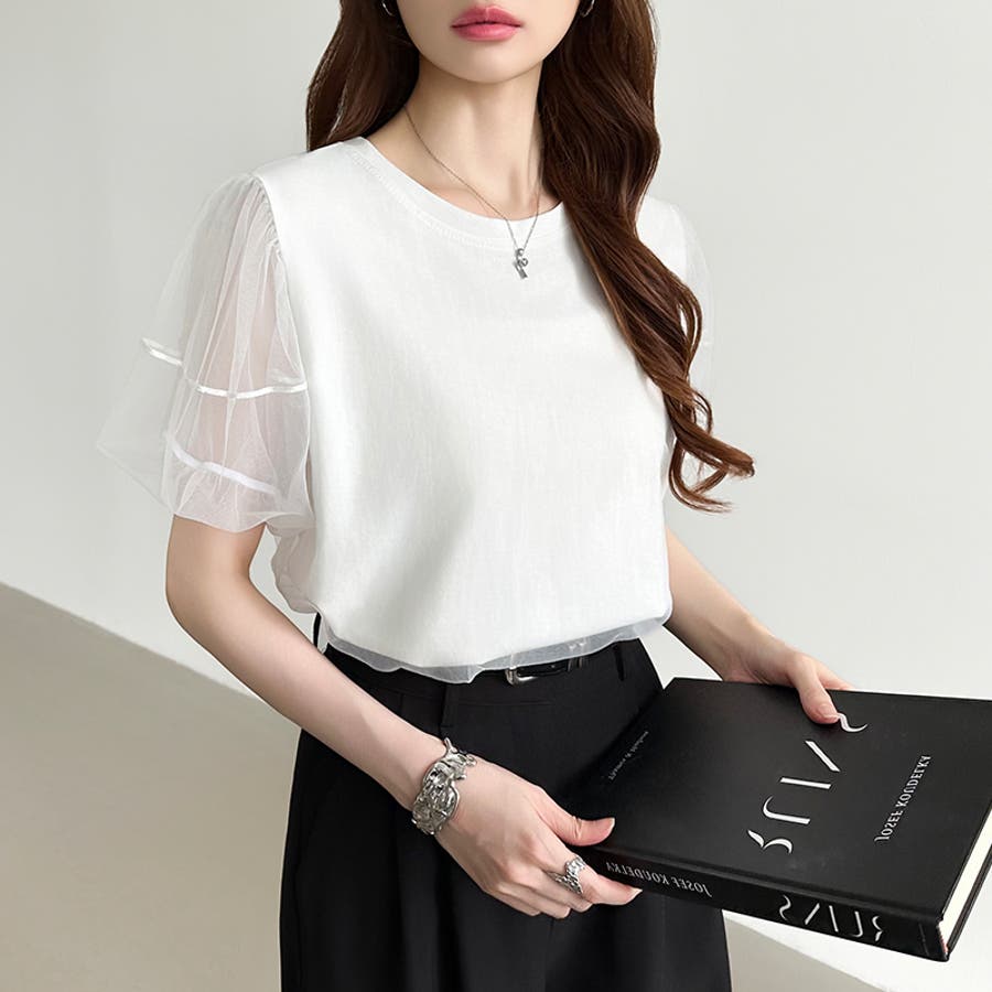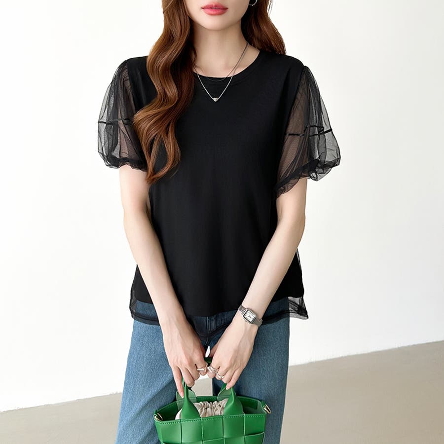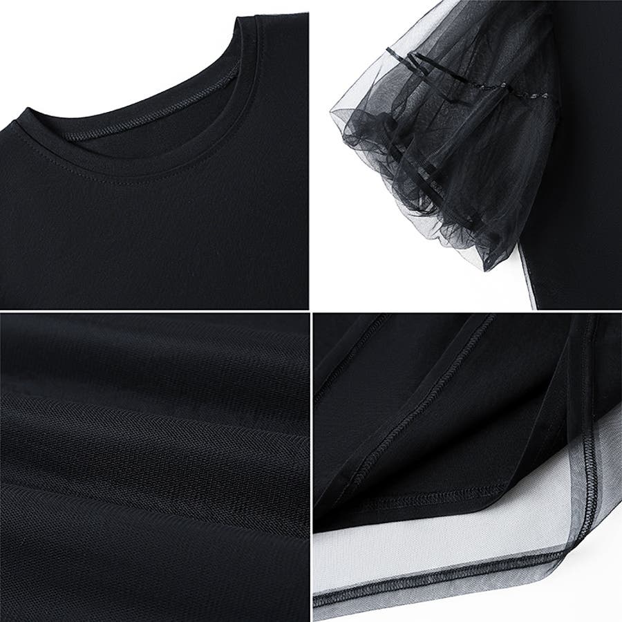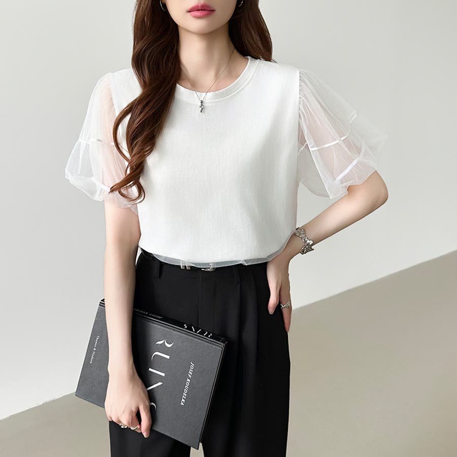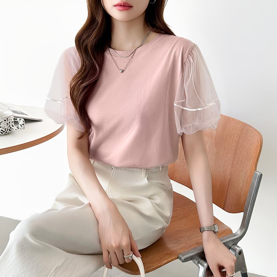 チュールレイヤードtシャツ パフスリーブ 半袖カットソー