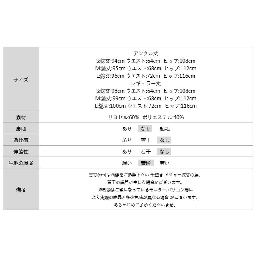| サイズ | アンクル丈 S: 総丈 94cm ウエスト 64cm ヒップ 108cm M: 総丈 95cm ウエスト 68cm ヒップ 112cm L: 総丈 96cm ウエスト 72cm ヒップ 116cm レギュラー丈 S: 総丈 98cm ウエスト 64cm ヒップ 108cm M: 総丈 99cm ウエスト 68cm ヒップ 112cm L: 総丈 100cm ウエスト 72cm ヒップ 116cm |