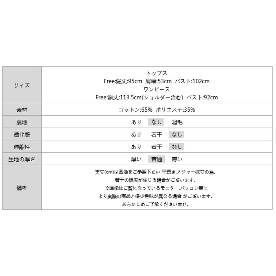 | サイズ | トップス Free: 総丈 95cm 肩幅 53cm バスト 102cm ワンピース Free: 総丈 113.5cm(ショルダー含む) バスト 92cm |