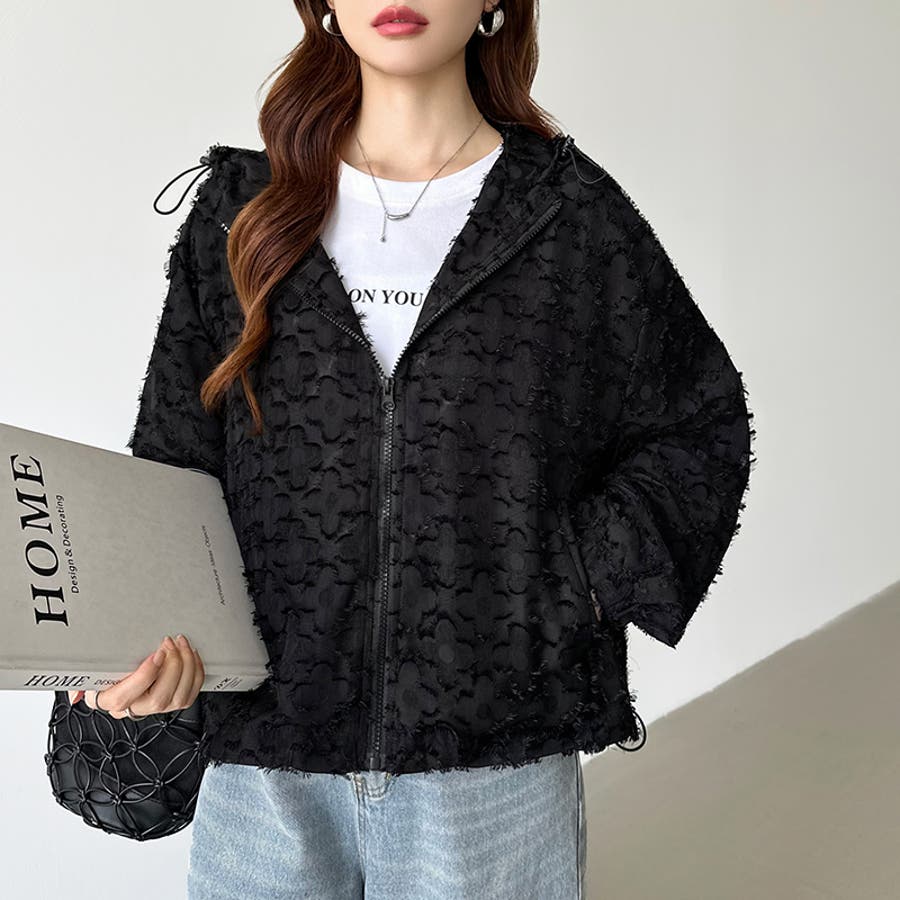 フラワーカットジャガードブルゾン パーカーブルゾン ドロスト付き