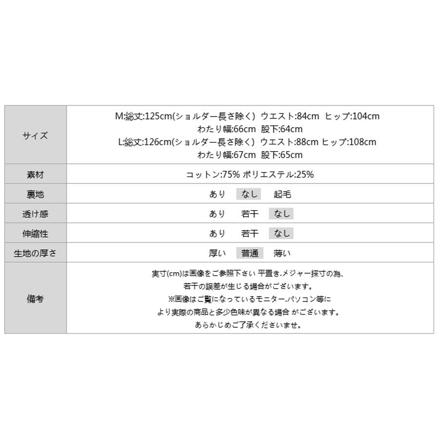 | サイズ | M: 総丈 125cm(ショルダー長さ除く) ウエスト 84cm ヒップ 104cm わたり幅 66cm 股下 64cm L: 総丈 126cm(ショルダー長さ除く) ウエスト 88cm ヒップ 108cm わたり幅 67cm 股下 65cm |