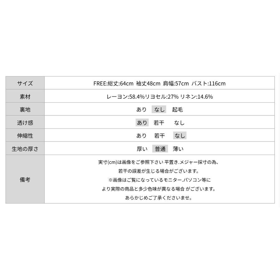| サイズ | Free: 総丈 64cm 袖丈 48cm 肩幅 57cm バスト 116cm |