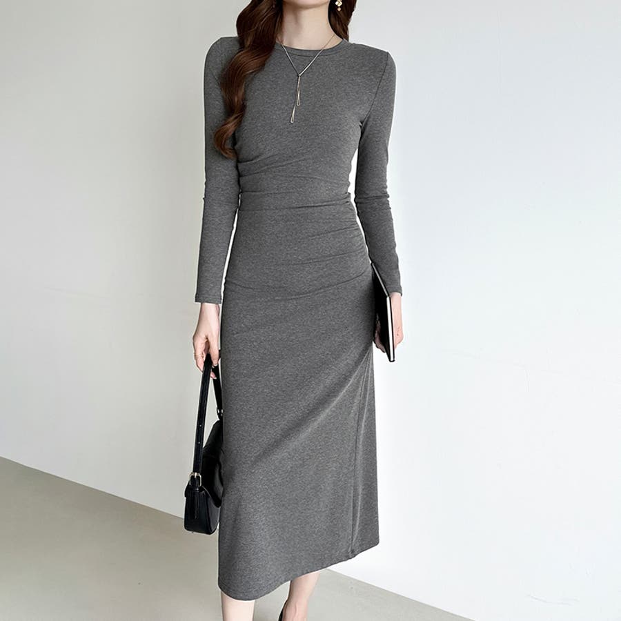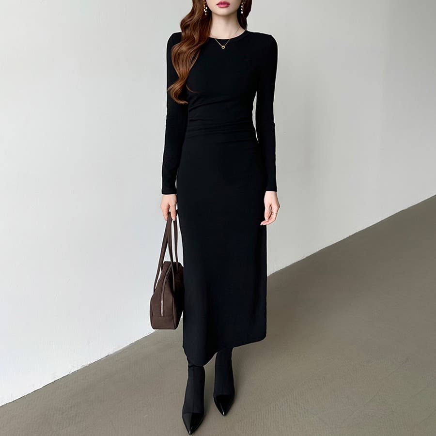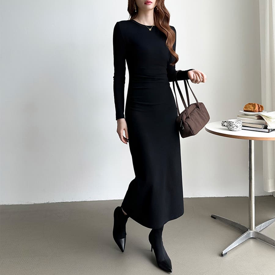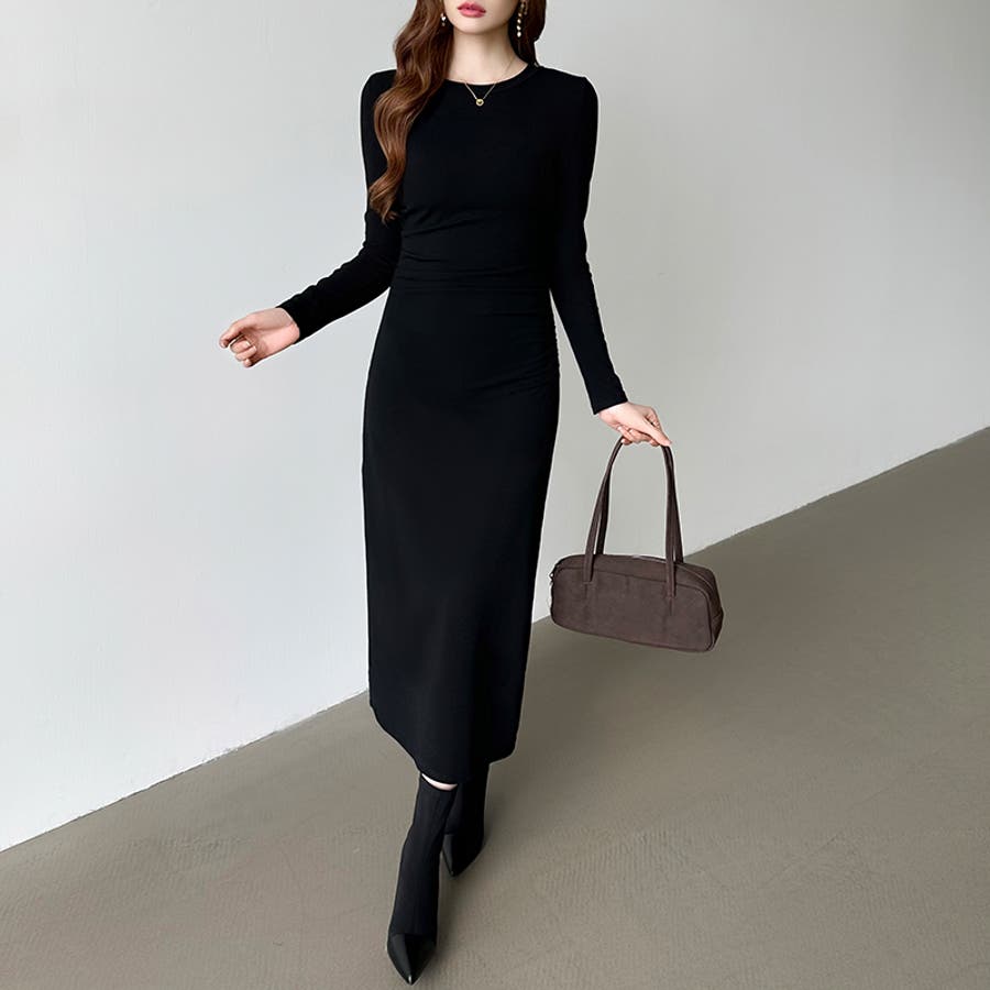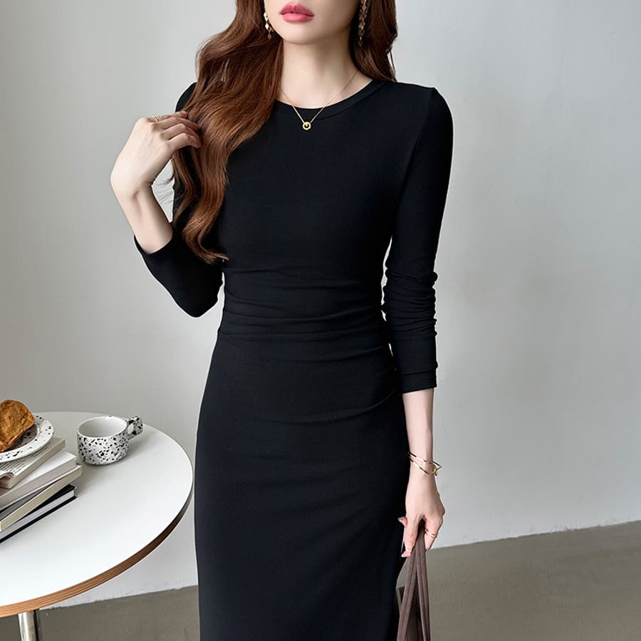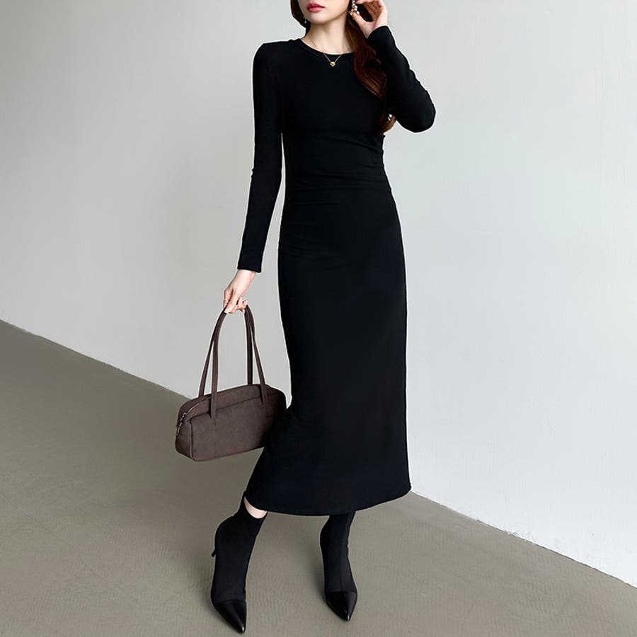 美シルエットウエストギャザーワンピース タイトワンピース 長袖ワンピース
