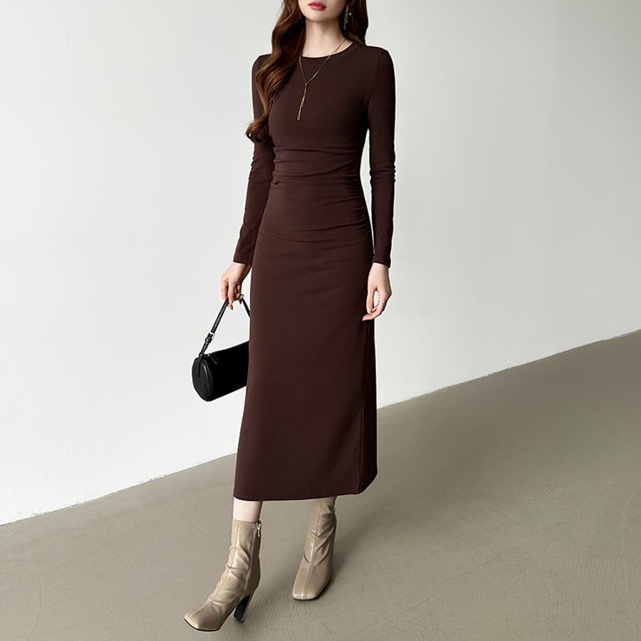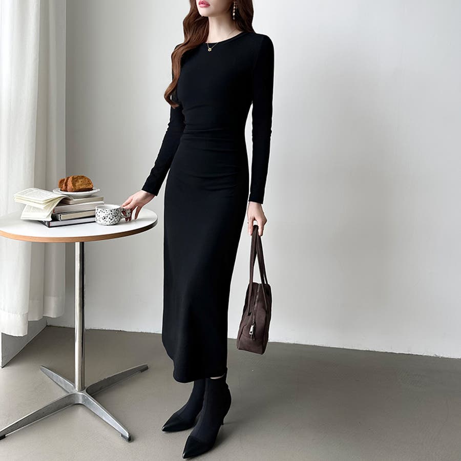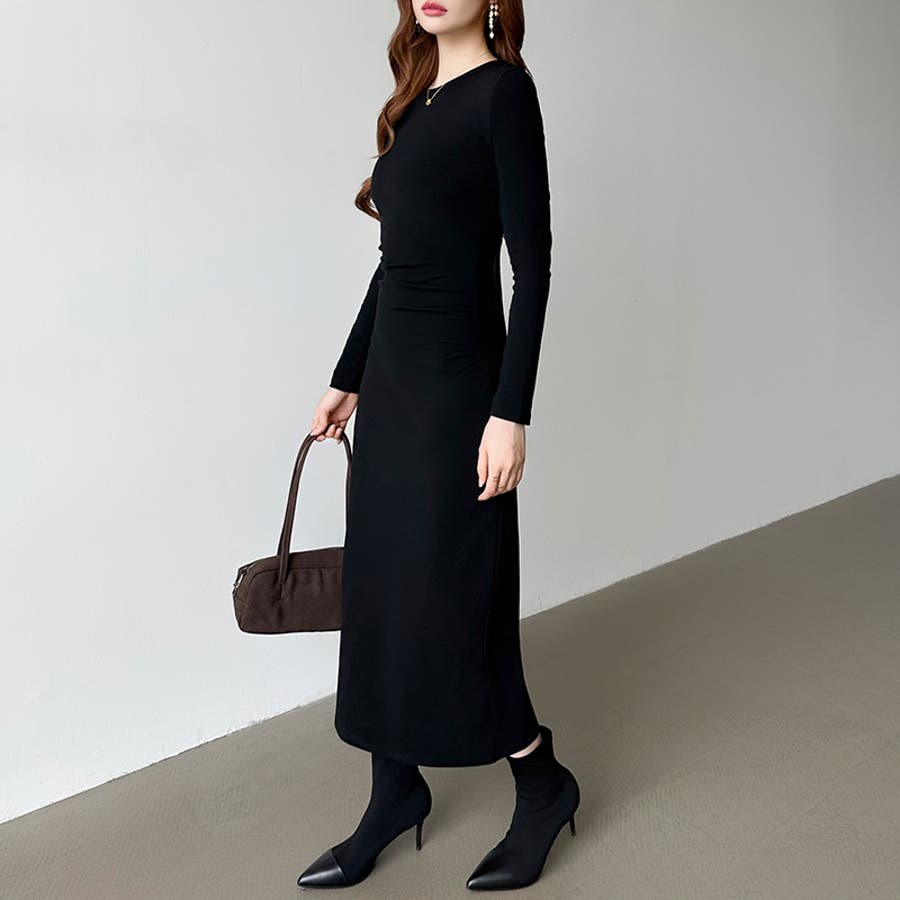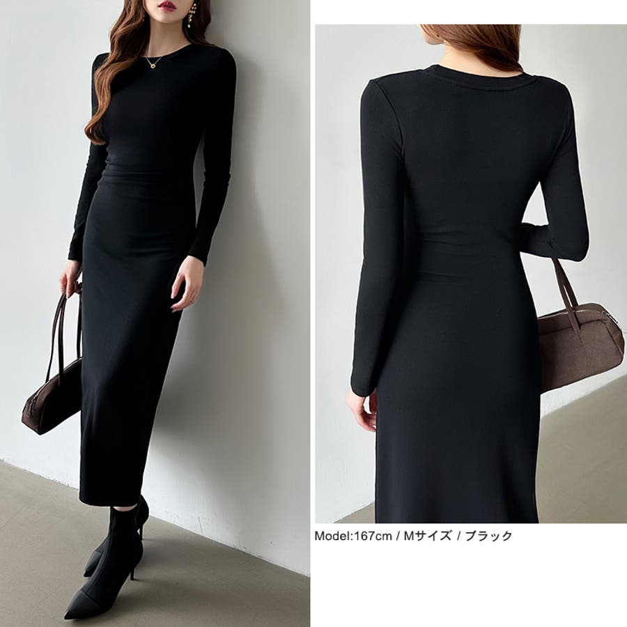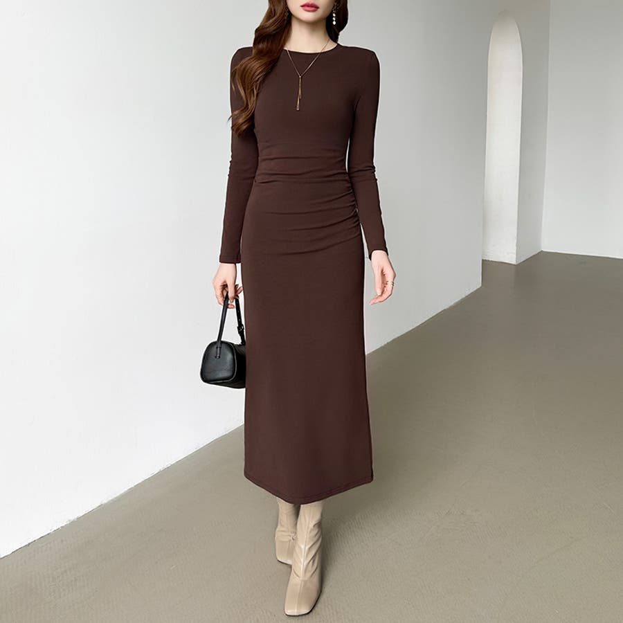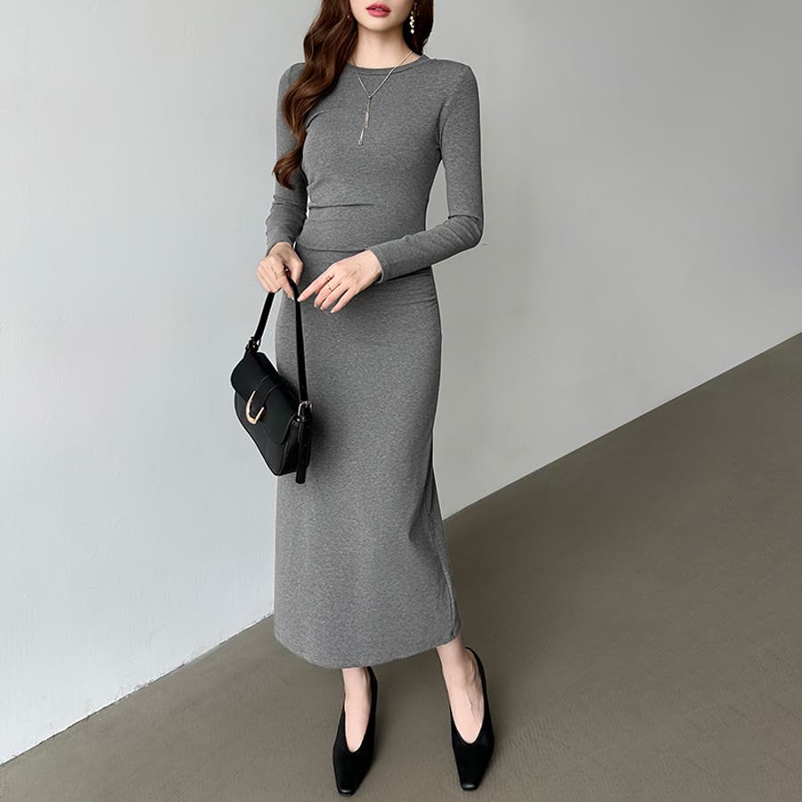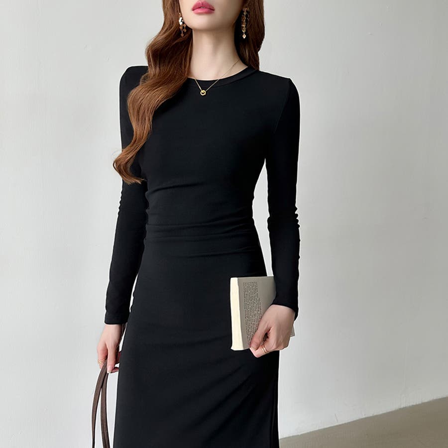 美シルエットウエストギャザーワンピース タイトワンピース 長袖ワンピース