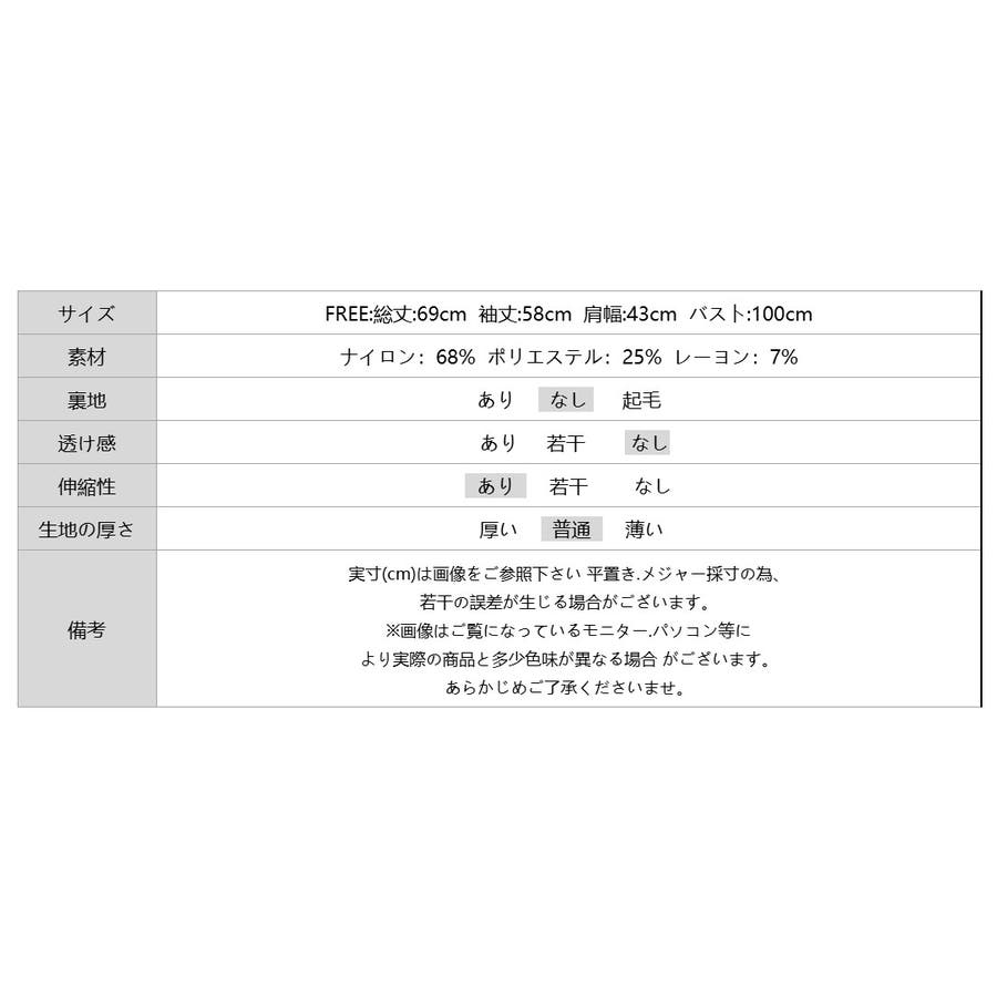 | サイズ | Free: 総丈 69cm 袖丈58cm 肩幅 43cm バスト 100cm |