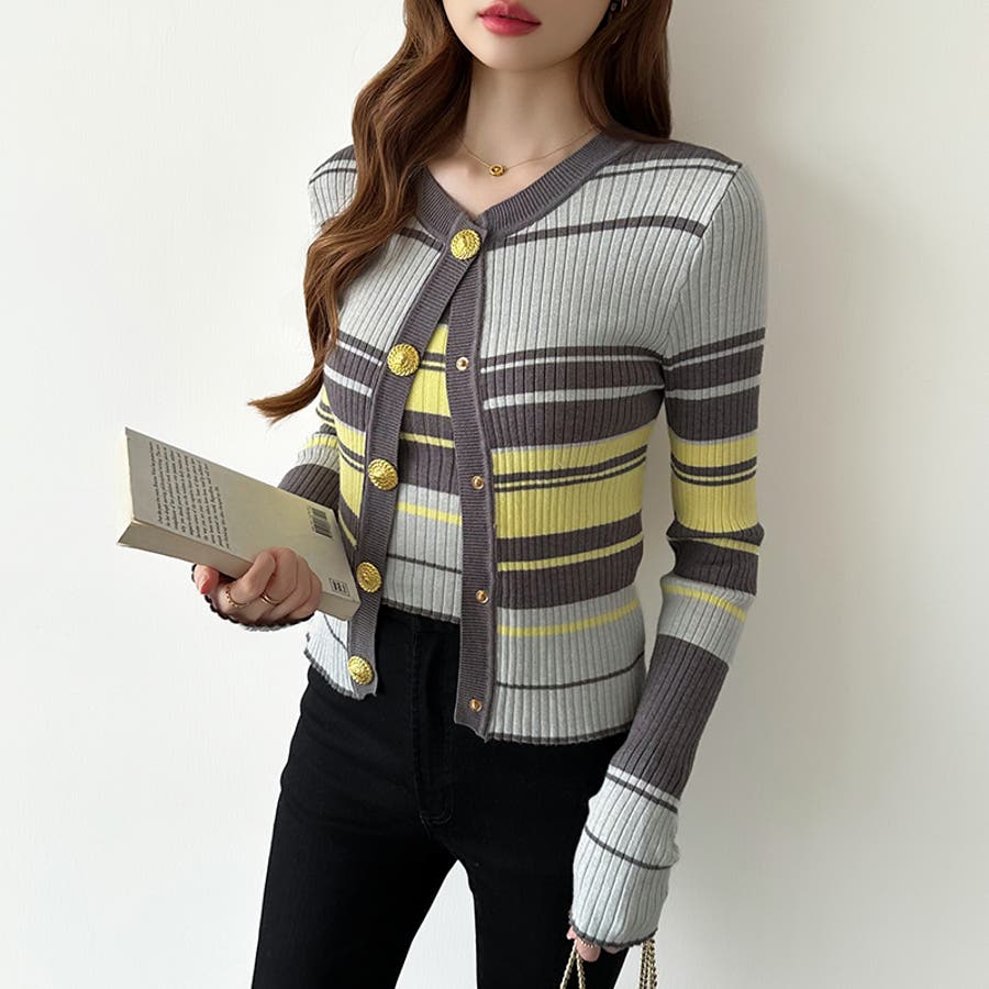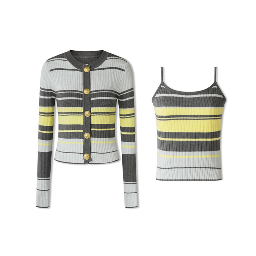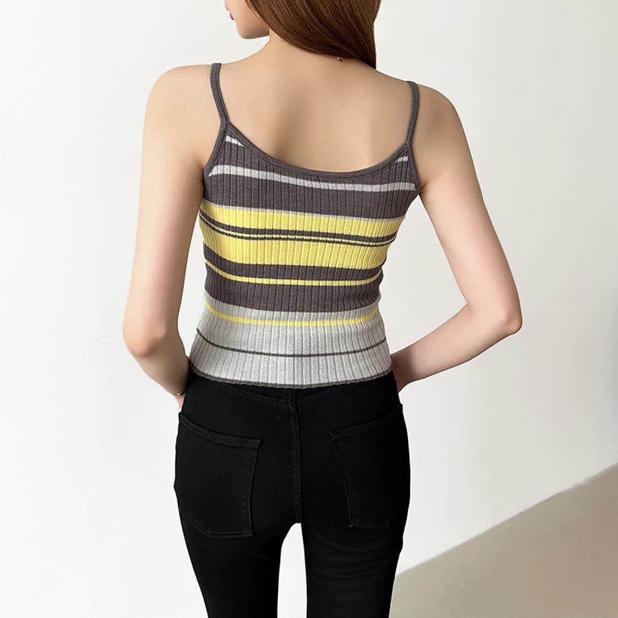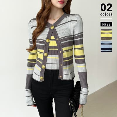 カーディガンとキャミソールの アンサンブルニット。 マルチボーダー柄が上品に映え ショート丈がすっきりとした シルエットに。 金ボタンがアクセントになり カジュアルながらも大人の 華やかさをプラス。カジュアルにも フェミニンにも寄り添うアイテム。