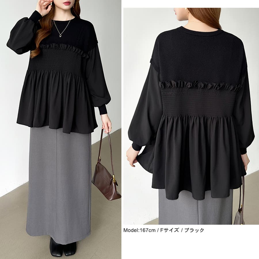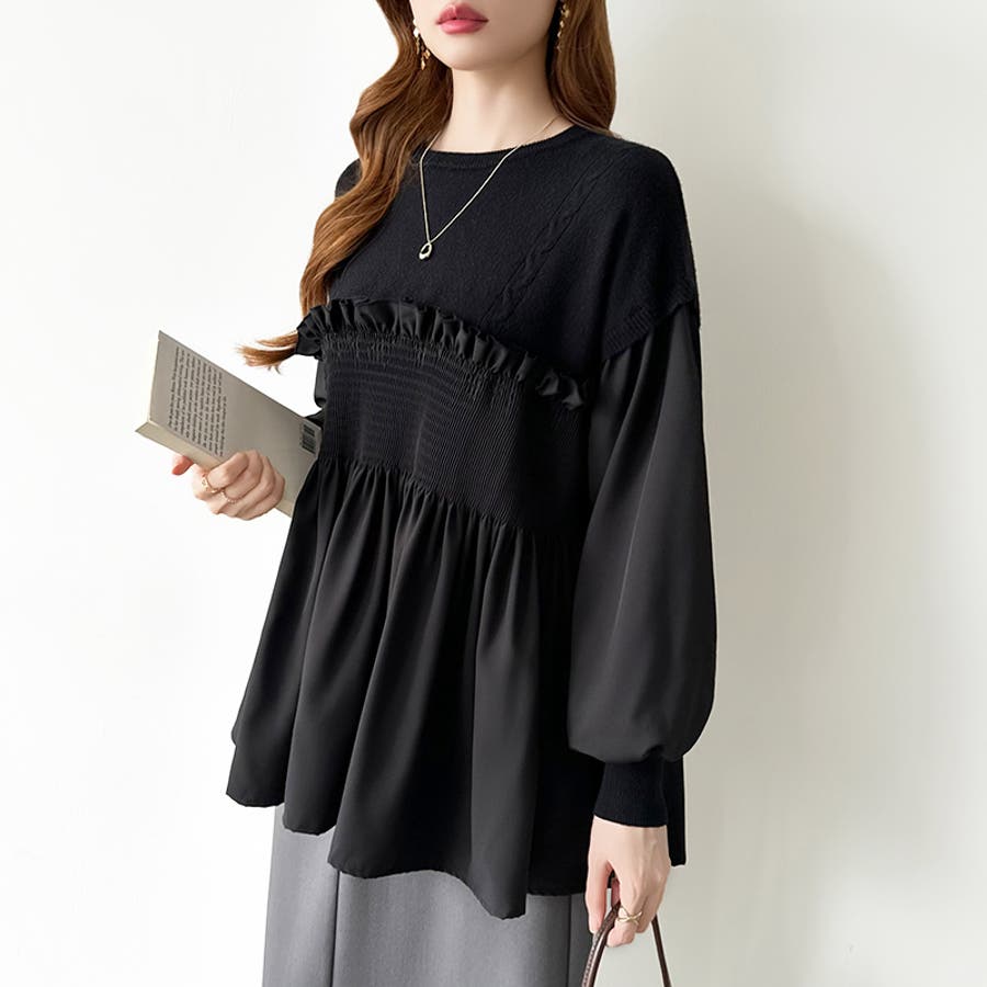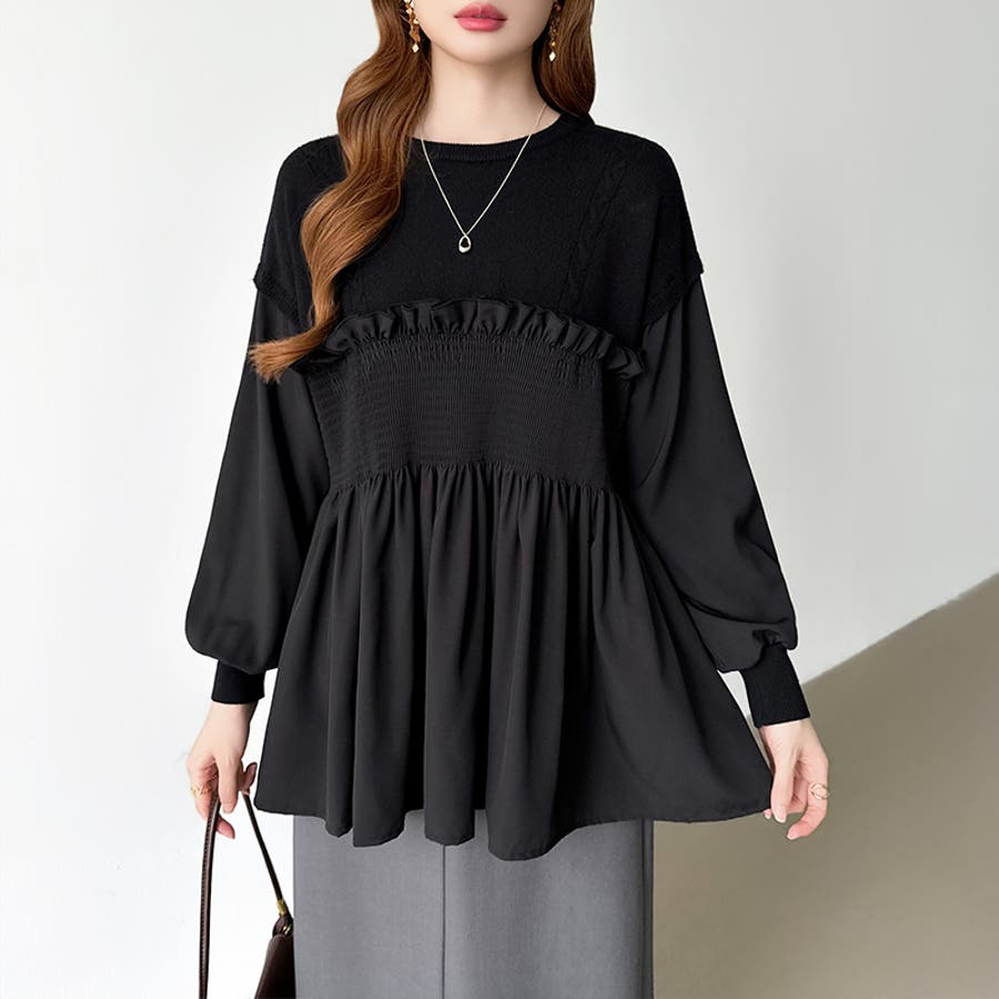 ニットと軽やかなブラウス素材を ドッキングし、立体感のある シルエットに仕上げた ドッキングペプラムトップス。 ふんわりと広がるデザインで気になる 腰まわりをさりげなくカバー。 ゆったりとしたチュニック丈で お尻も隠れる安心感も魅力です。