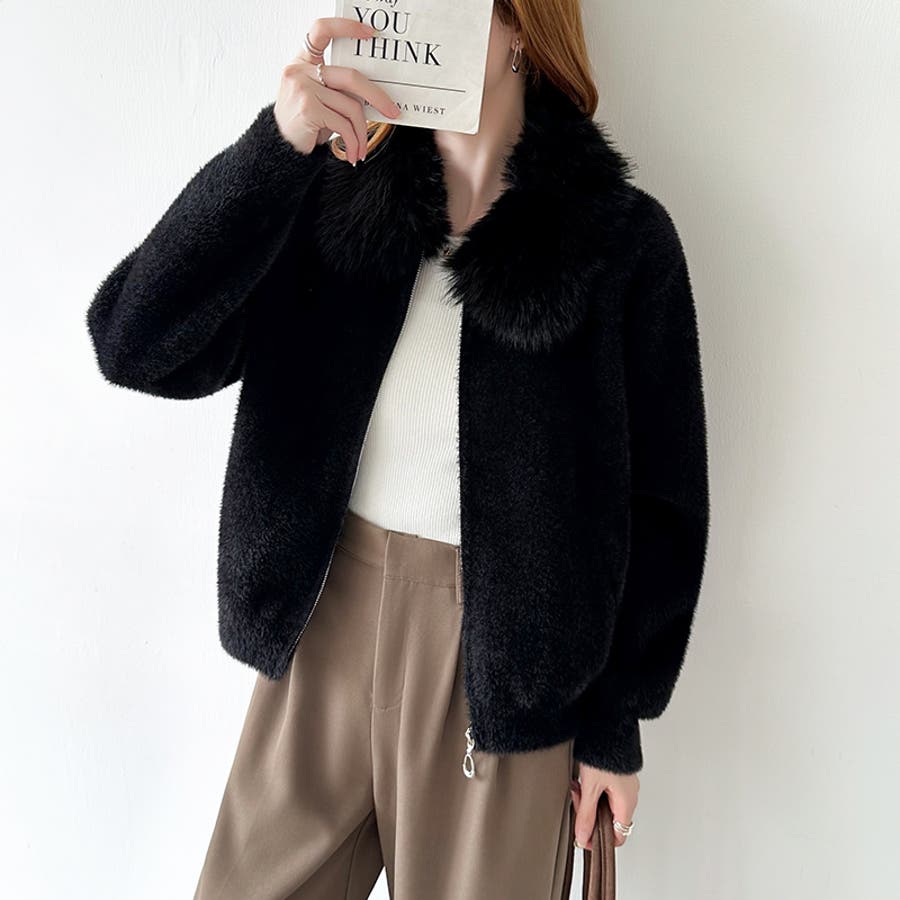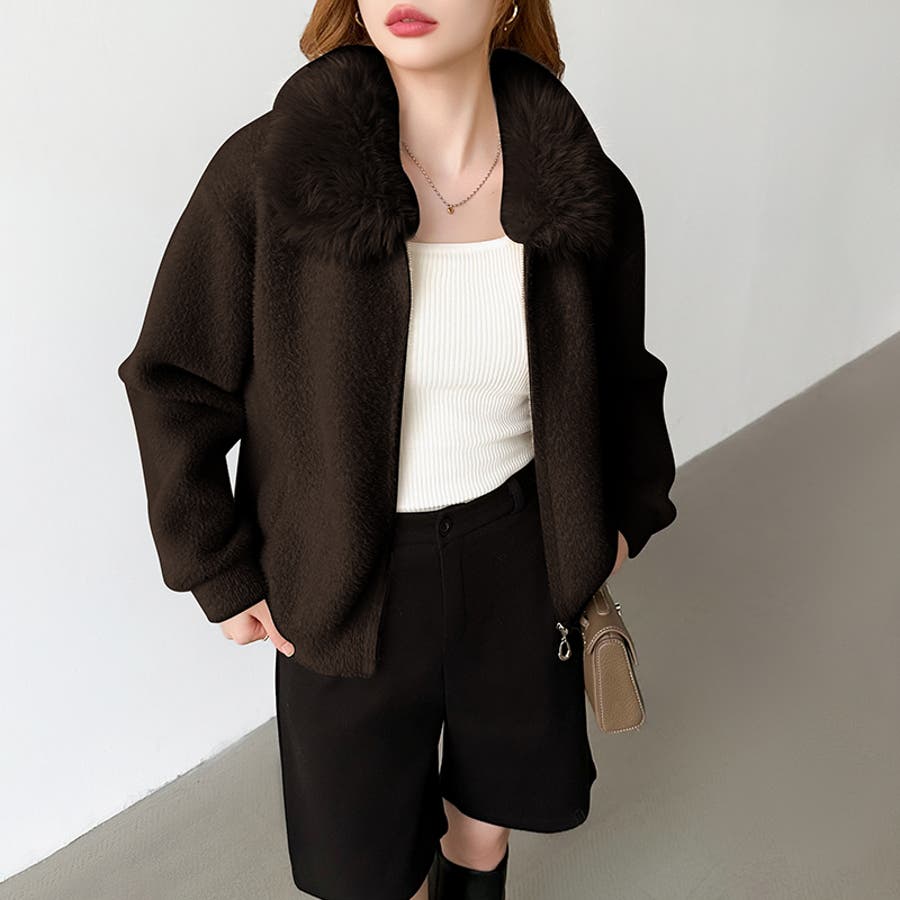 襟元のフェイクファーが華やぐ ファー付きシャギーブルゾン。 ふわふわのファー襟に、柔らかな シャギー生地で程よい厚みがあり、 羽織るだけで女性らしい立体感と あたたかみをプラスします。 フロントはジップアップ仕様で、 気負わずデイリーに取り入れやすい デザイン。 華やかさと上品さを両立した、 大人フェミニン派にぴったり一枚です。