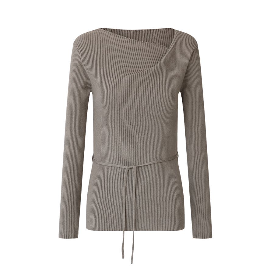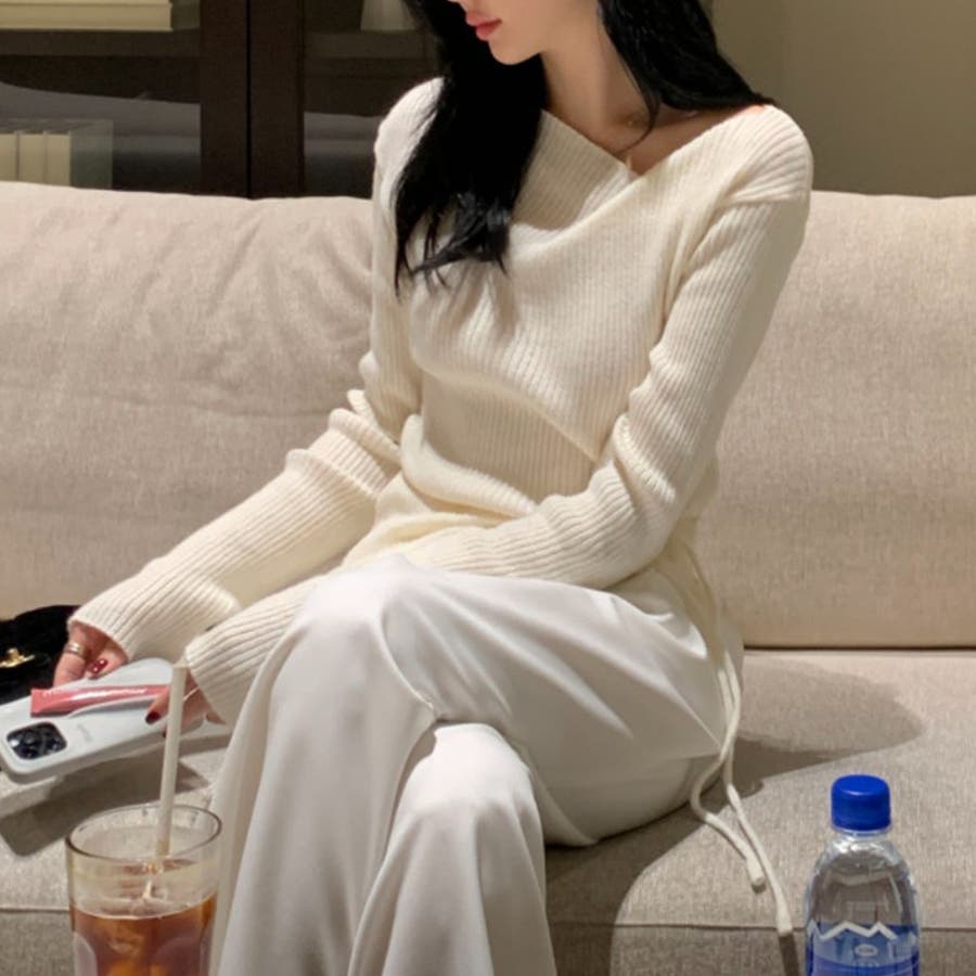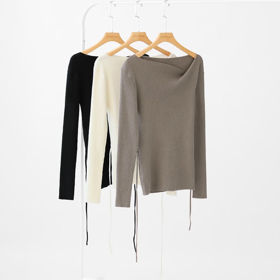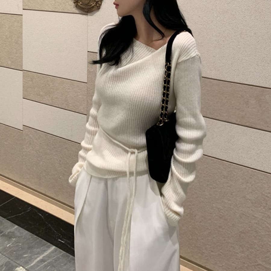 女性らしい抜け感と程よくモードな イレギュラーネックニット。 アシンメトリーに開いた ネックラインがデコルテを美しく 引き立て、女性らしい印象に。 ウエスト部分にはリボン紐付きで 軽やかなメリハリをプラス。 しなやかなニット地で肌に馴染む ソフトな着心地です。