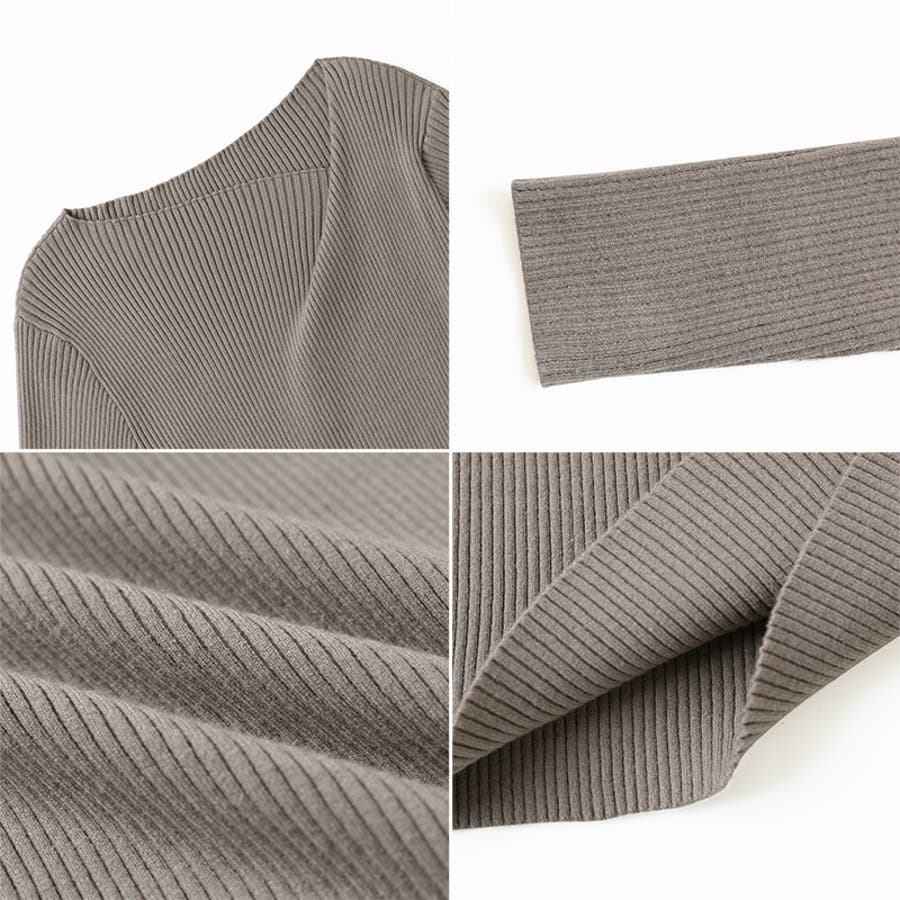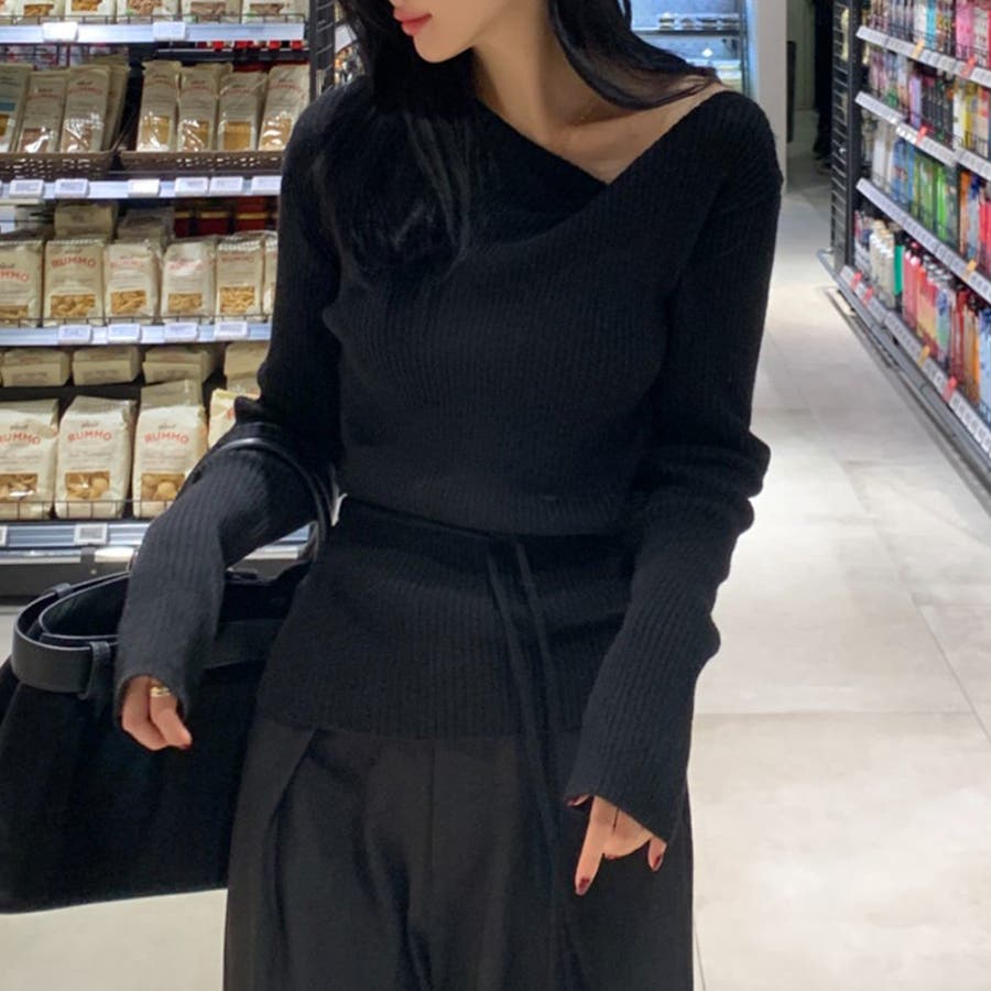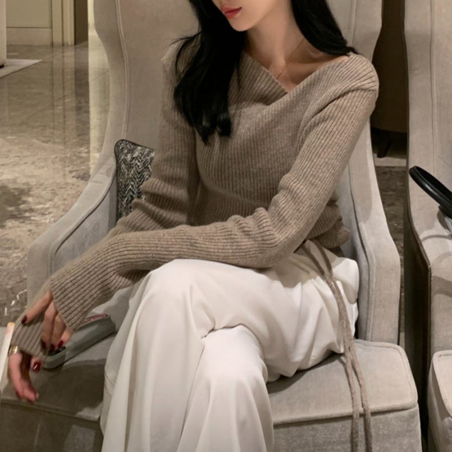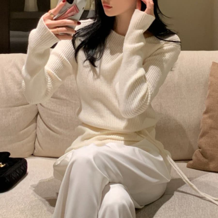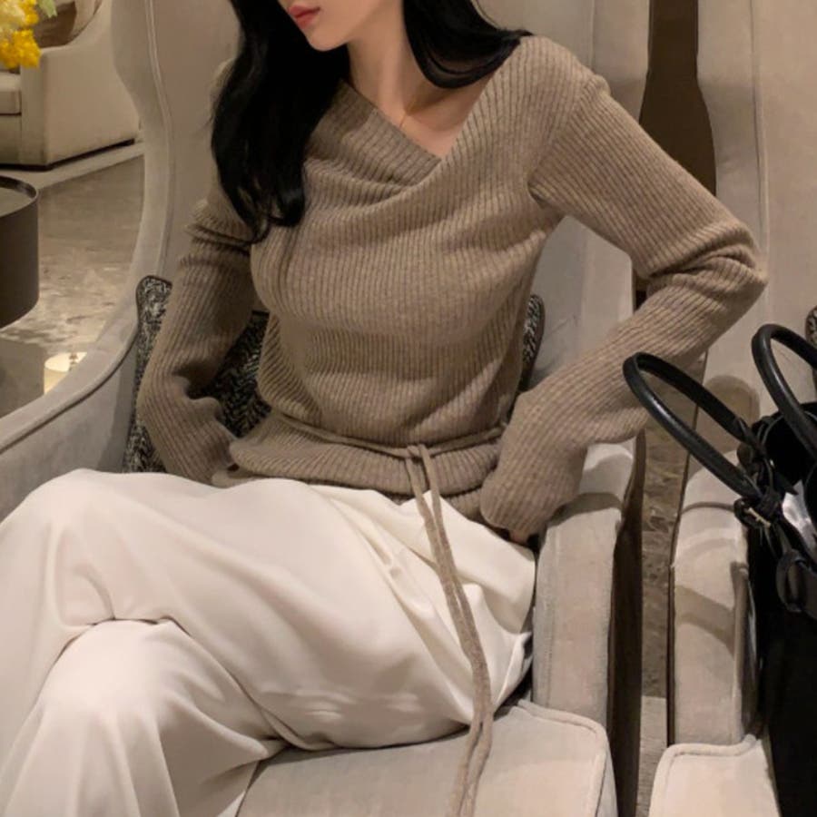 女性らしい抜け感と程よくモードな イレギュラーネックニット。 アシンメトリーに開いた ネックラインがデコルテを美しく 引き立て、女性らしい印象に。 ウエスト部分にはリボン紐付きで 軽やかなメリハリをプラス。 しなやかなニット地で肌に馴染む ソフトな着心地です。