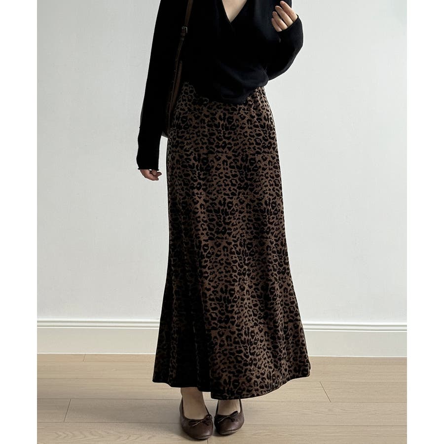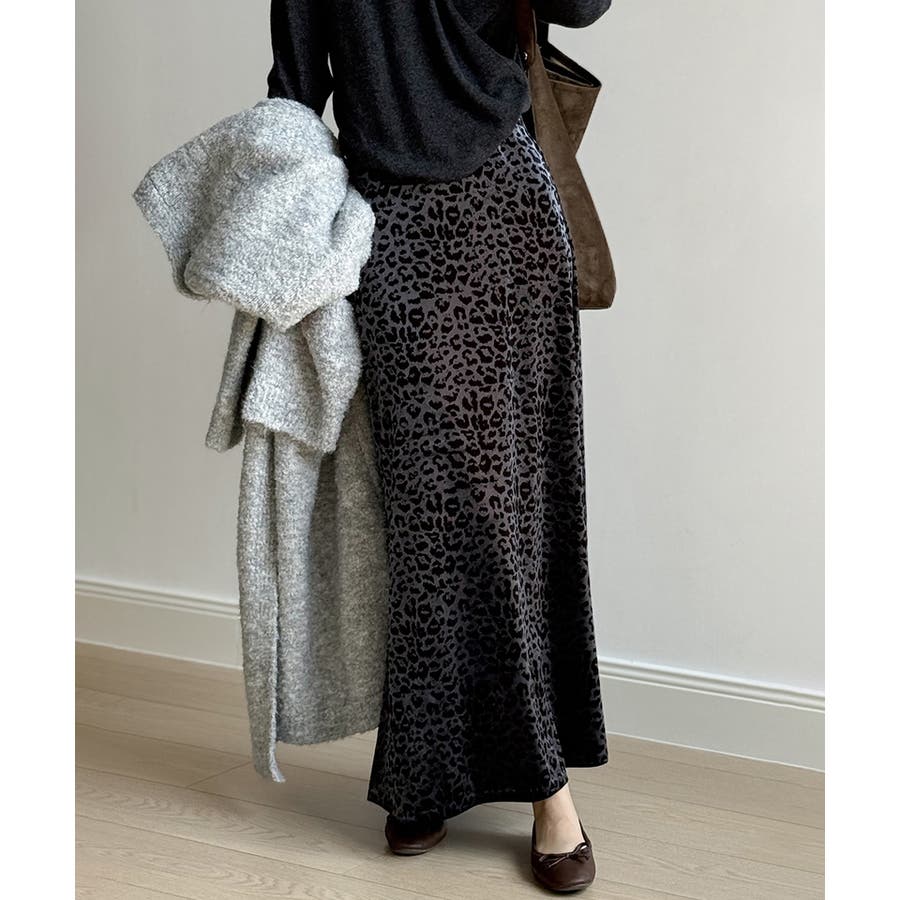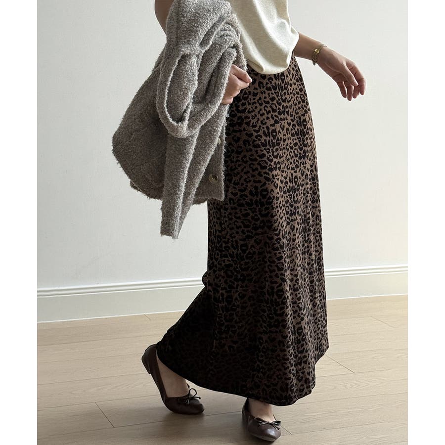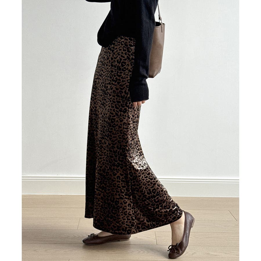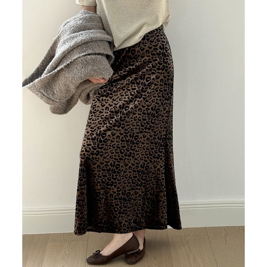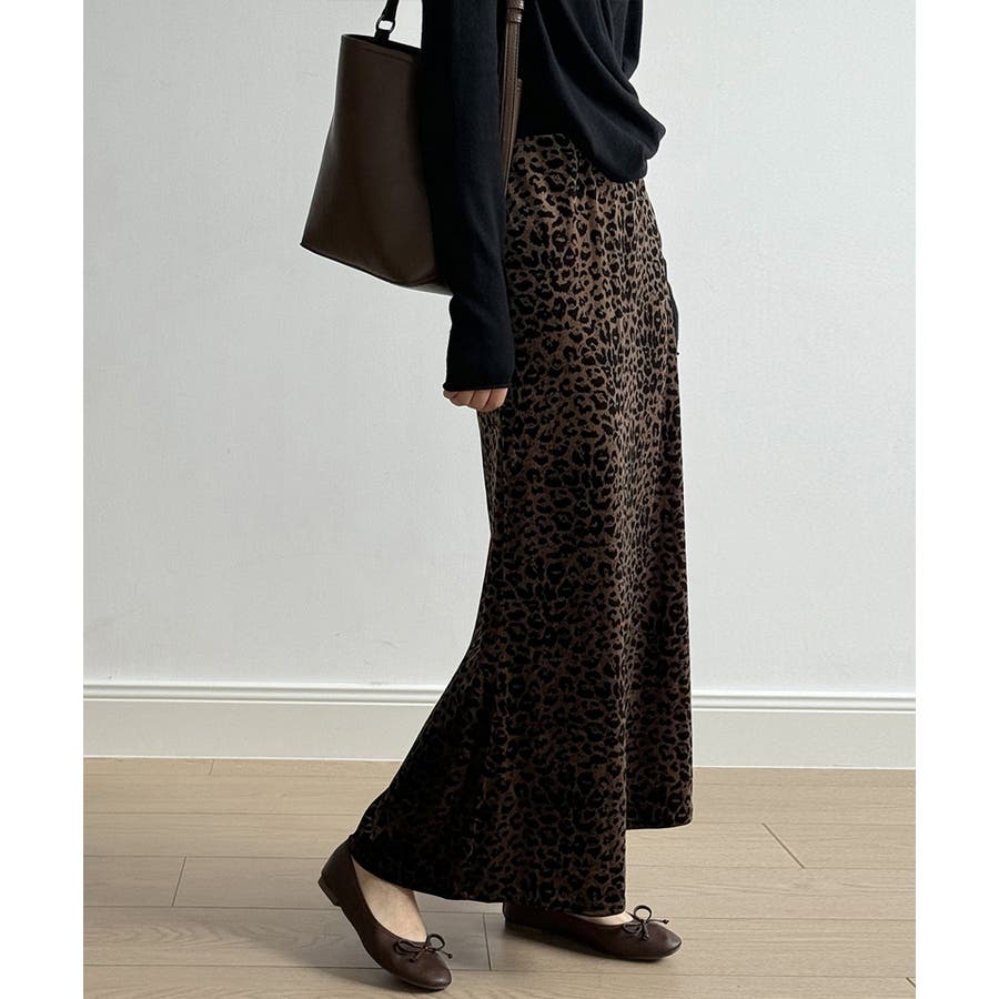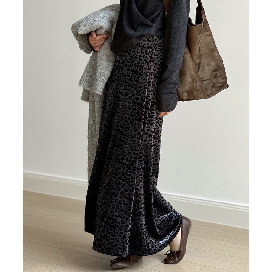 光沢のあるベロア素材に レオパード柄をのせた、 ベロアロングスカート。 動くたびにしなやかな艶感が 華やかで印象的に。 シンプルなトップスにも 合わせるだけで深みを 与えてくれます。