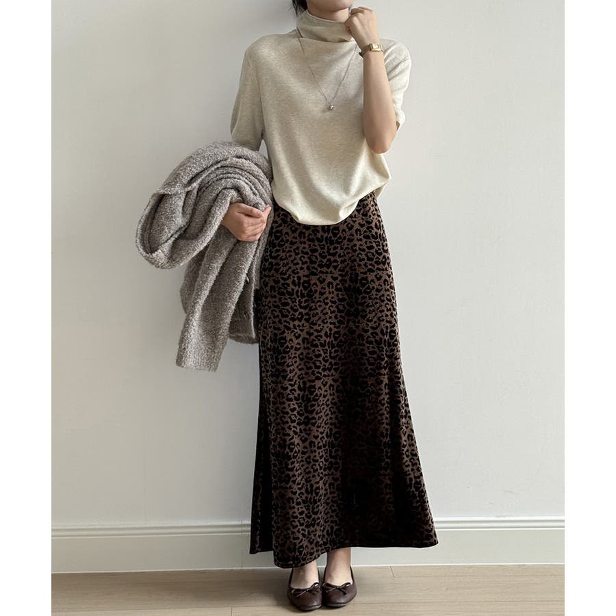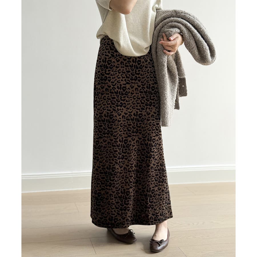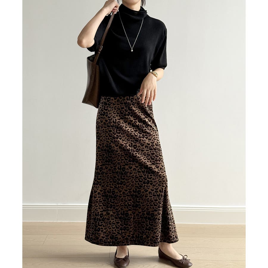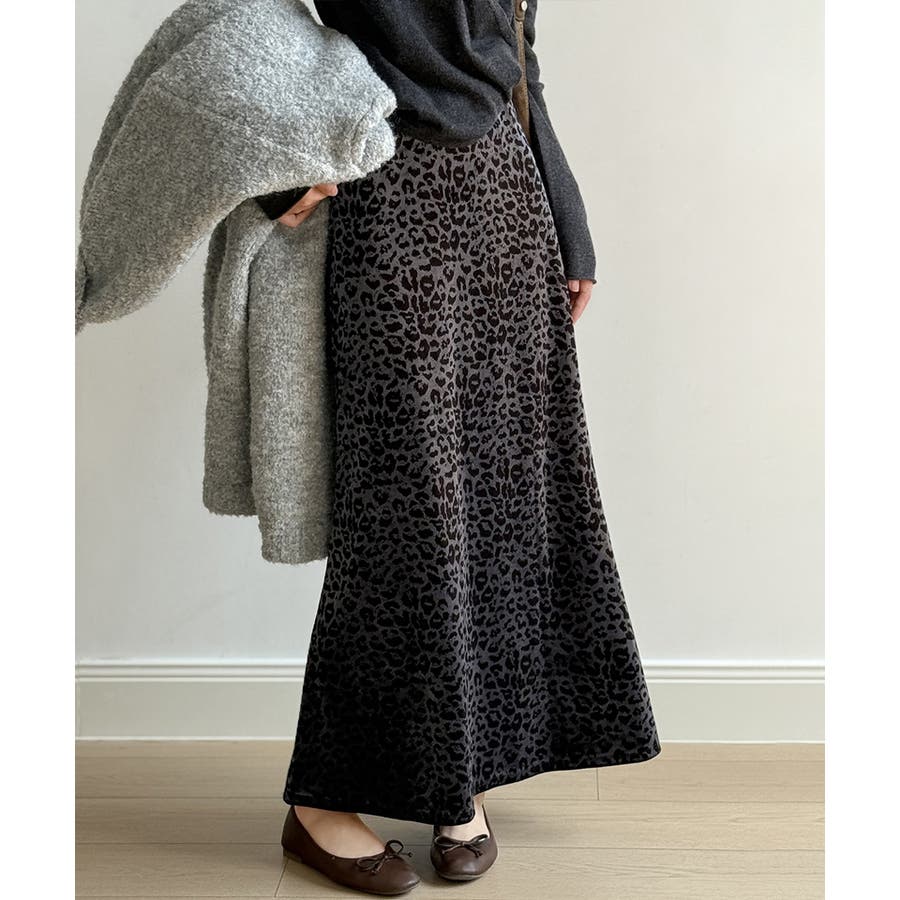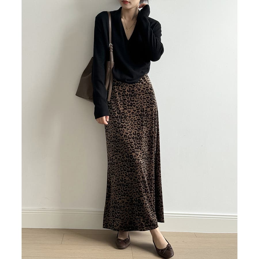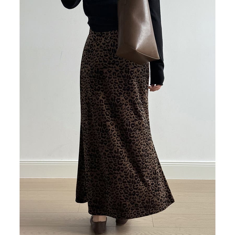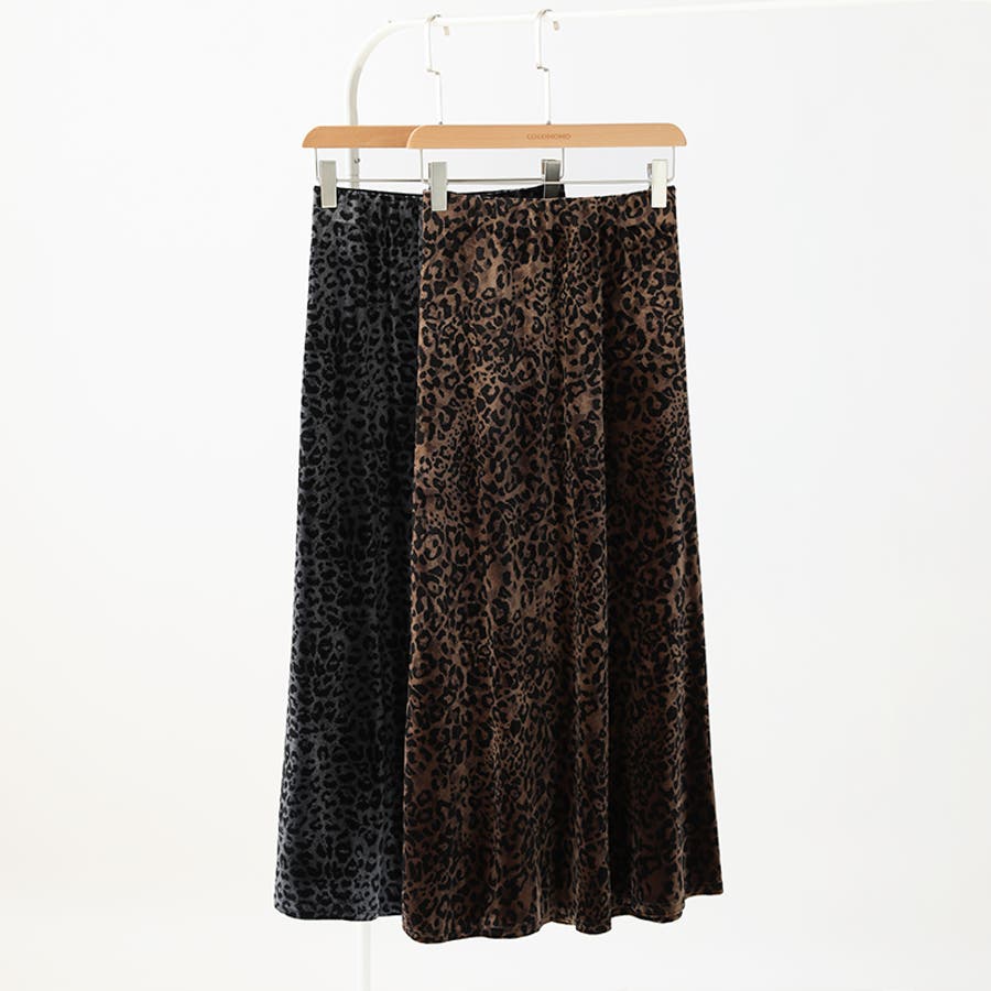 光沢のあるベロア素材に レオパード柄をのせた、 ベロアロングスカート。 動くたびにしなやかな艶感が 華やかで印象的に。 シンプルなトップスにも 合わせるだけで深みを 与えてくれます。