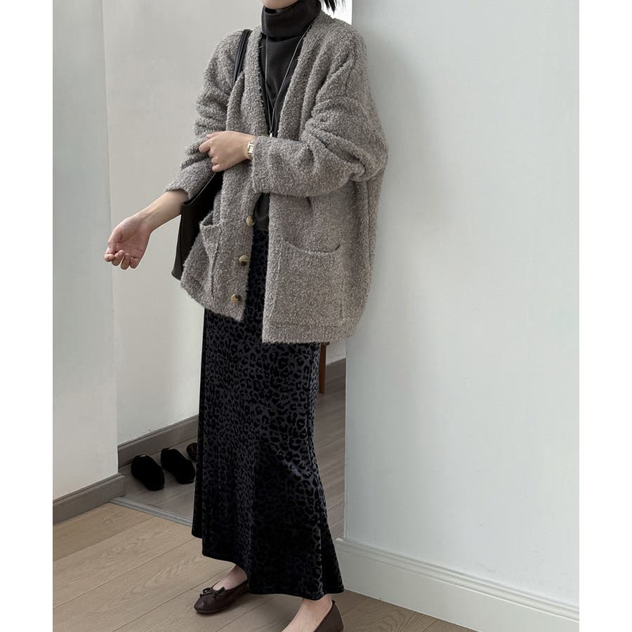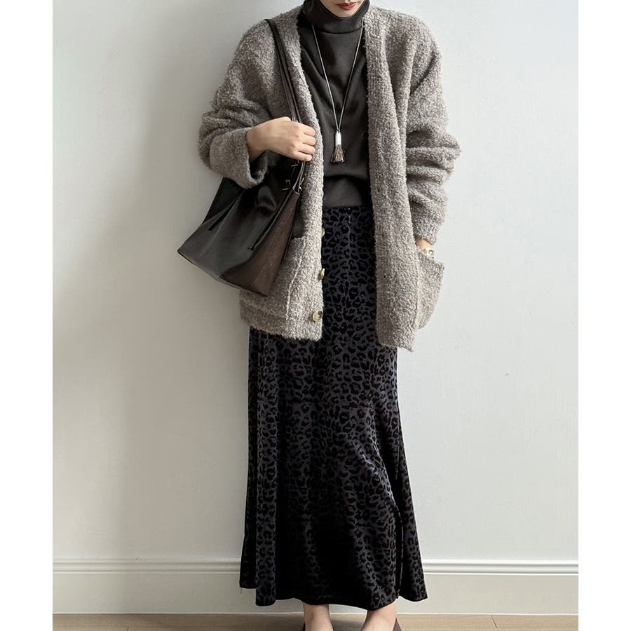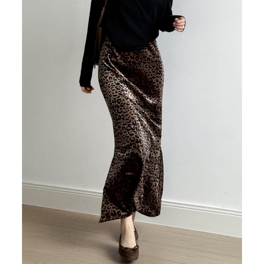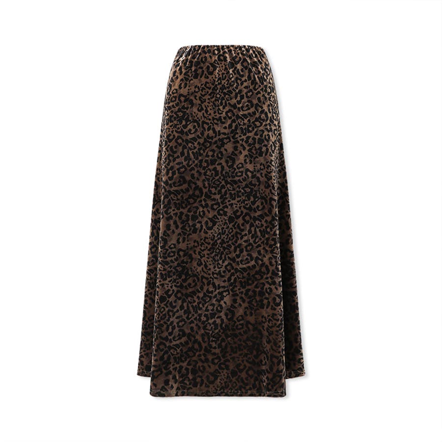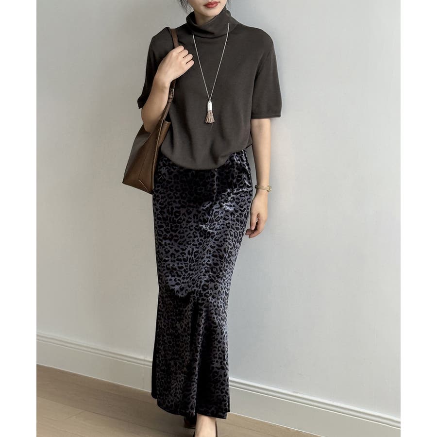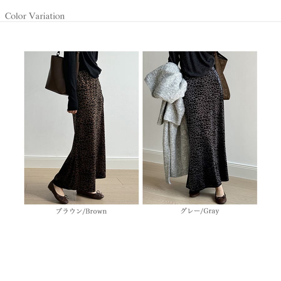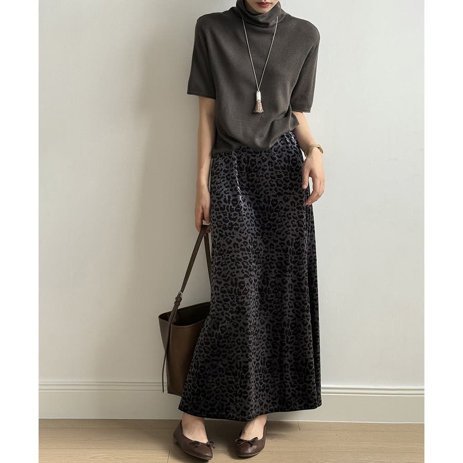 光沢のあるベロア素材に レオパード柄をのせた、 ベロアロングスカート。 動くたびにしなやかな艶感が 華やかで印象的に。 シンプルなトップスにも 合わせるだけで深みを 与えてくれます。