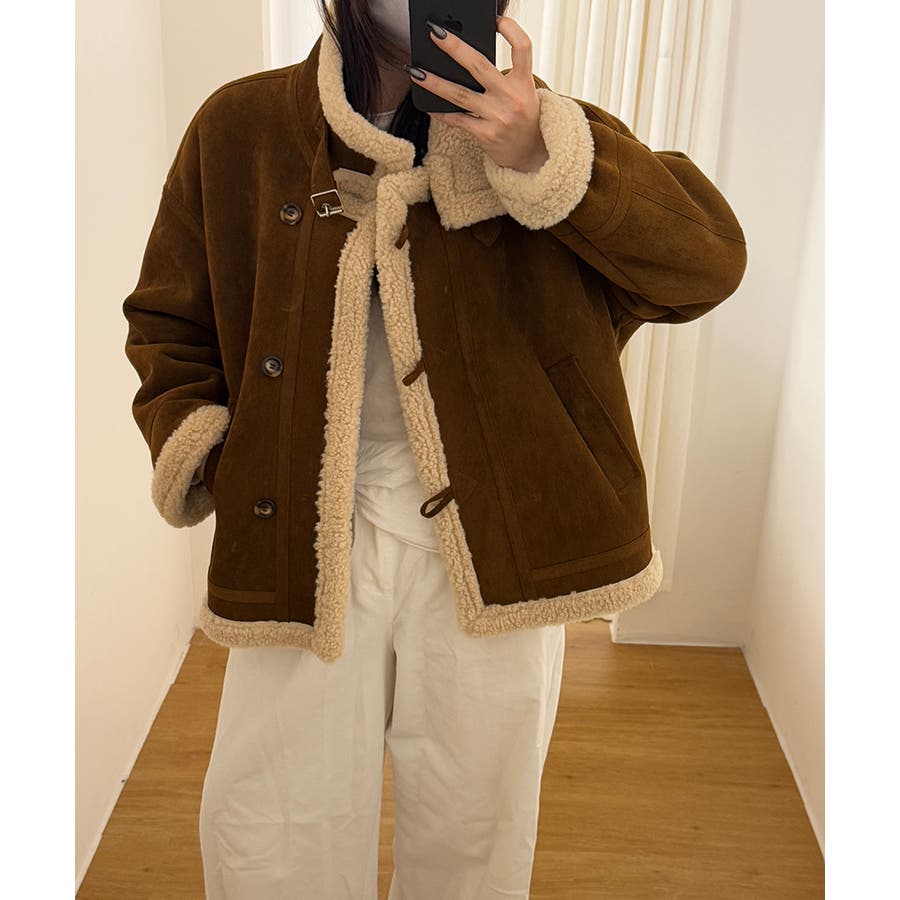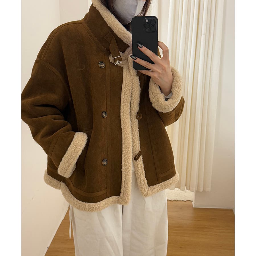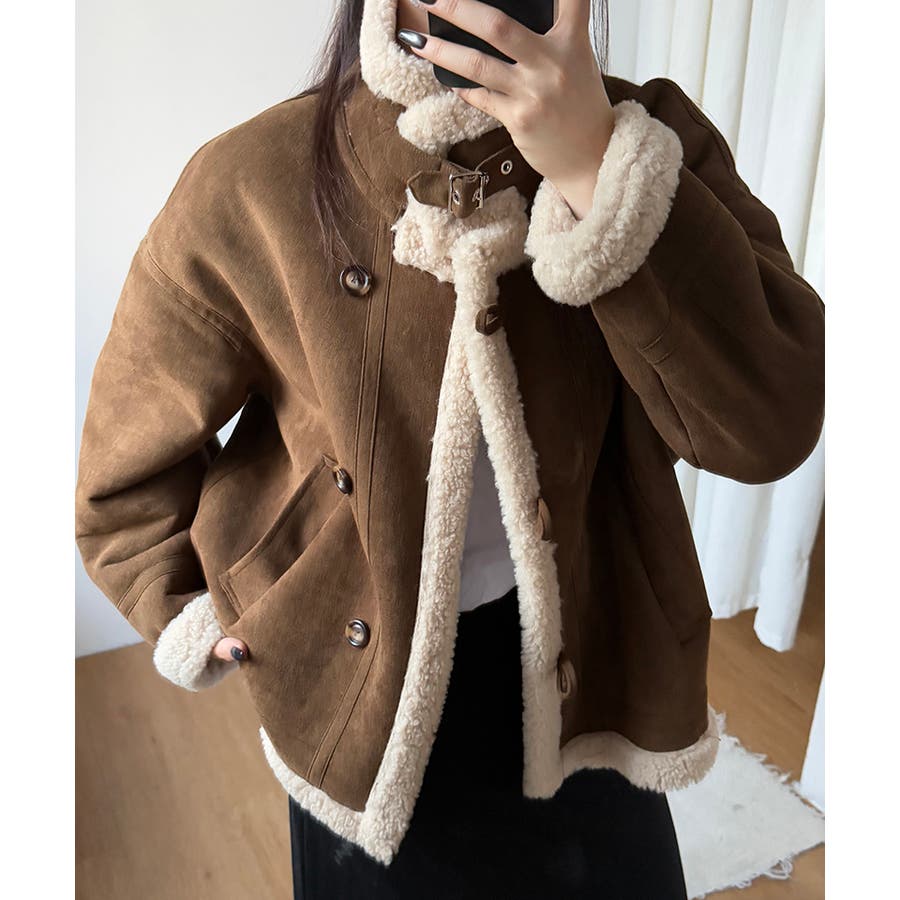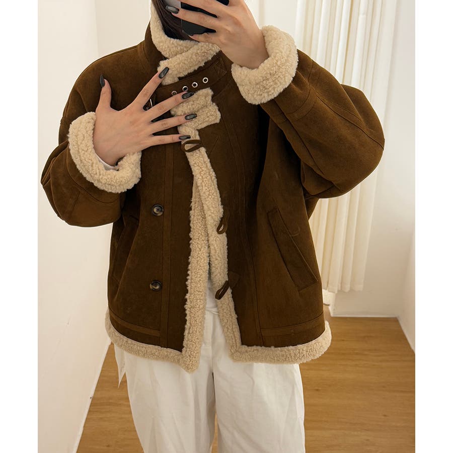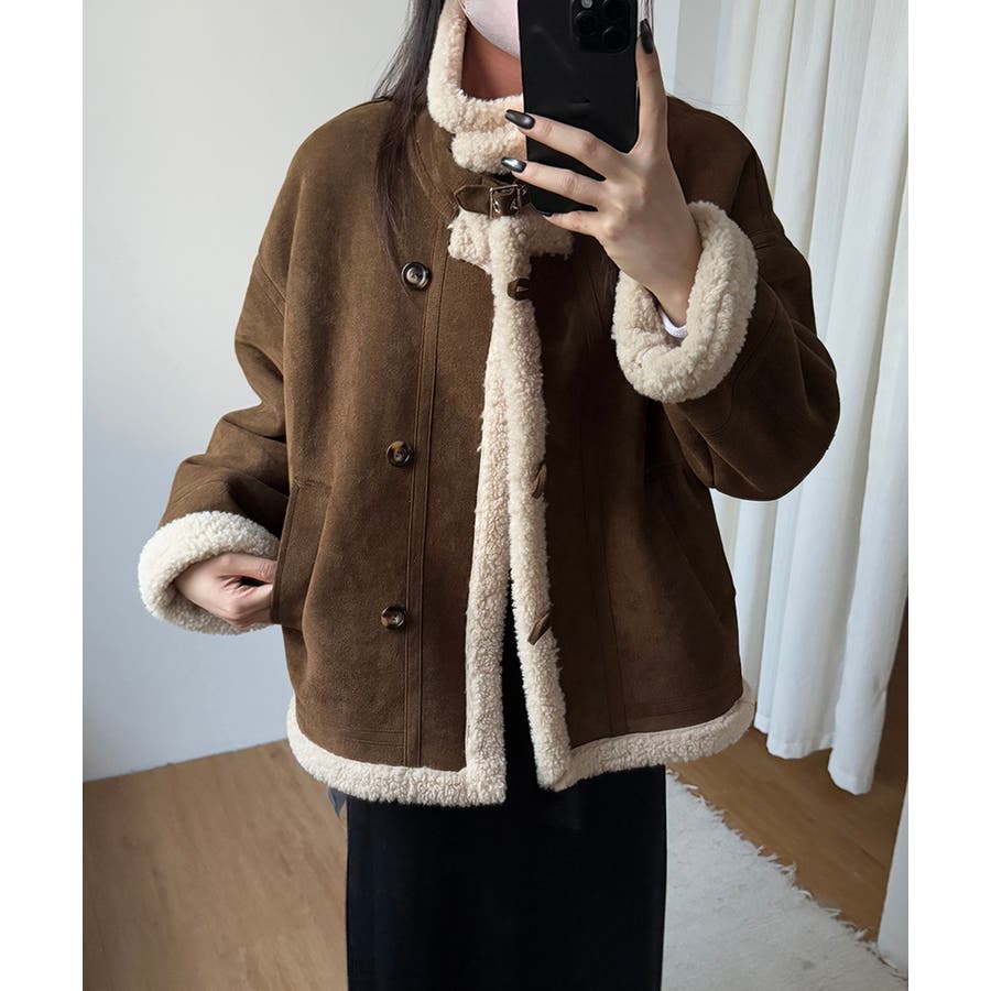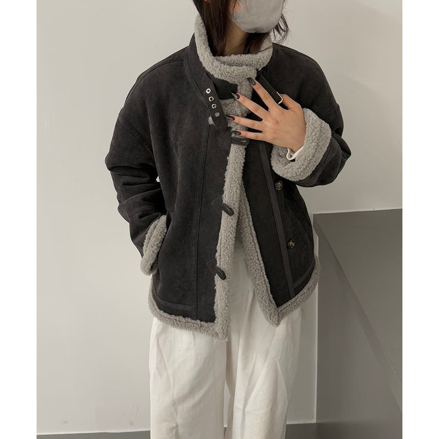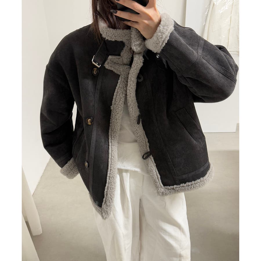 もこもこボアとスエード調の フェイクムートンを組み合わせた フェイクムートンジャケット。 襟元までしっかり包み込む スタンドカラー仕様で、 冷たい風を通さずあたたかに。 首元のバックルデザインが アクセントになり、着るだけで こなれた印象に仕上がります。