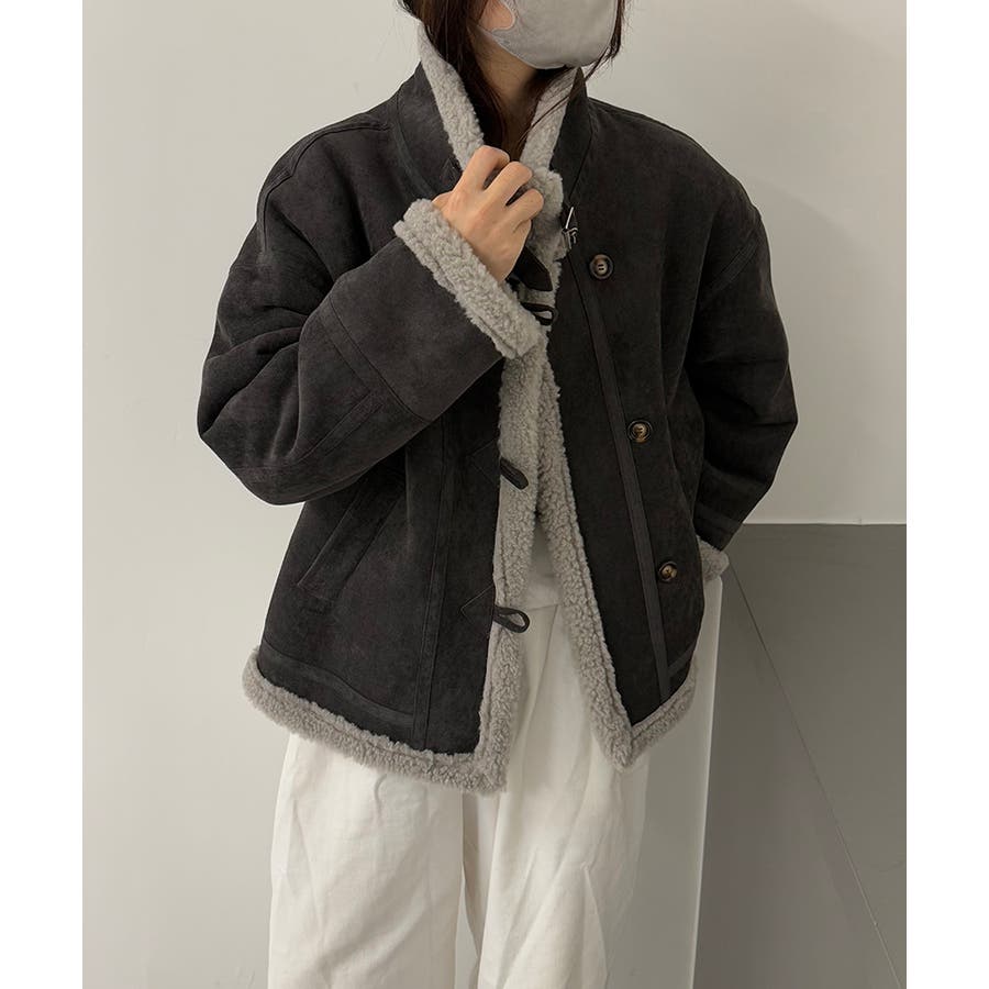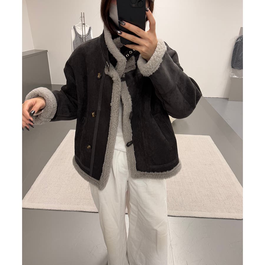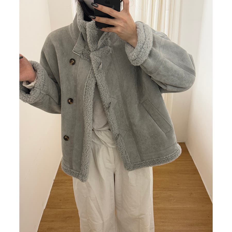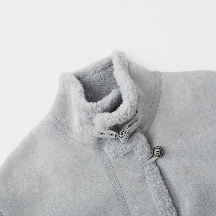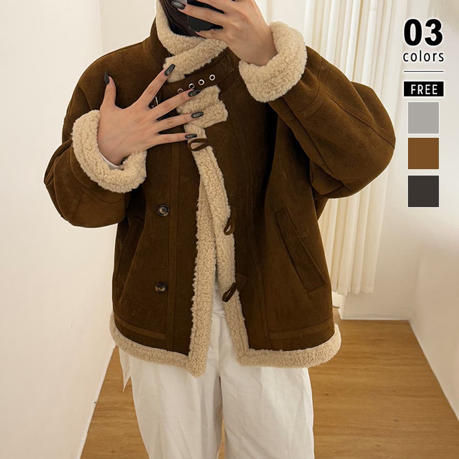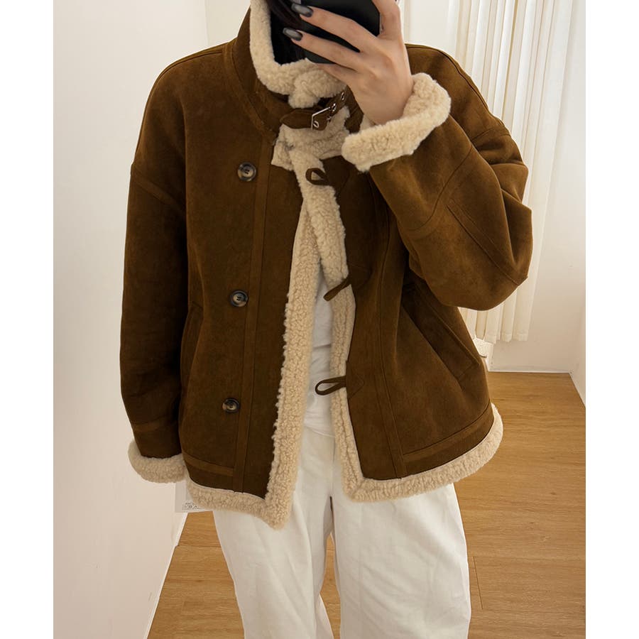 もこもこボアとスエード調の フェイクムートンを組み合わせた フェイクムートンジャケット。 襟元までしっかり包み込む スタンドカラー仕様で、 冷たい風を通さずあたたかに。 首元のバックルデザインが アクセントになり、着るだけで こなれた印象に仕上がります。